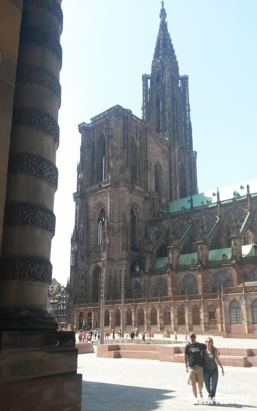 Nun wurde es Zeit für einen Stadtspaziergang. In der Nähe des beliebten Viertel Petite France stiegen wir aus dem Bus. Vorbei an romantischen Fachwerkbauten, über kleine Brücken spazierten wir unter der fachkundigen Führung von Nathalie auf den zentralen Platz in Straßburg, zur Kathedrale „Notre Dame".