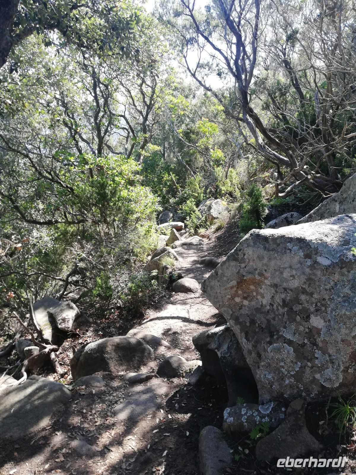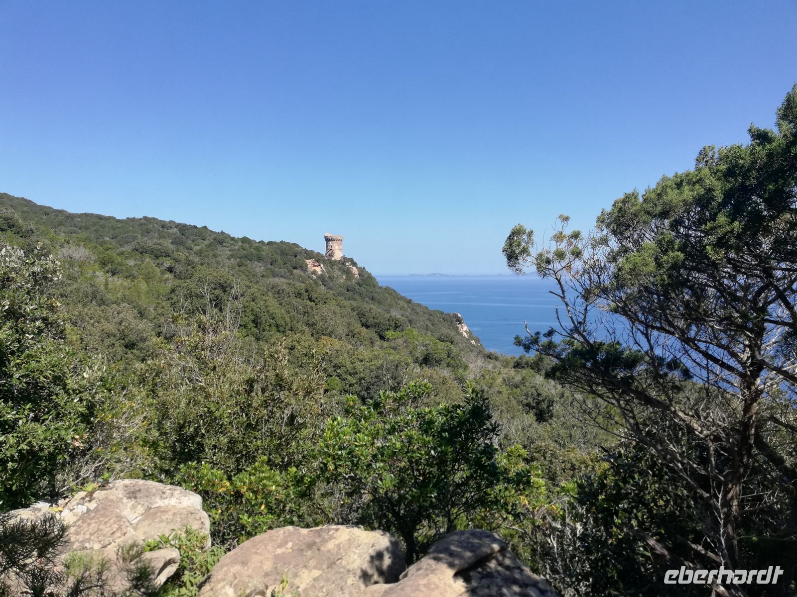 Über Viehweiden und hohem Buschwerk geht der Weg über Steintreppen bis zum Genueserturm.