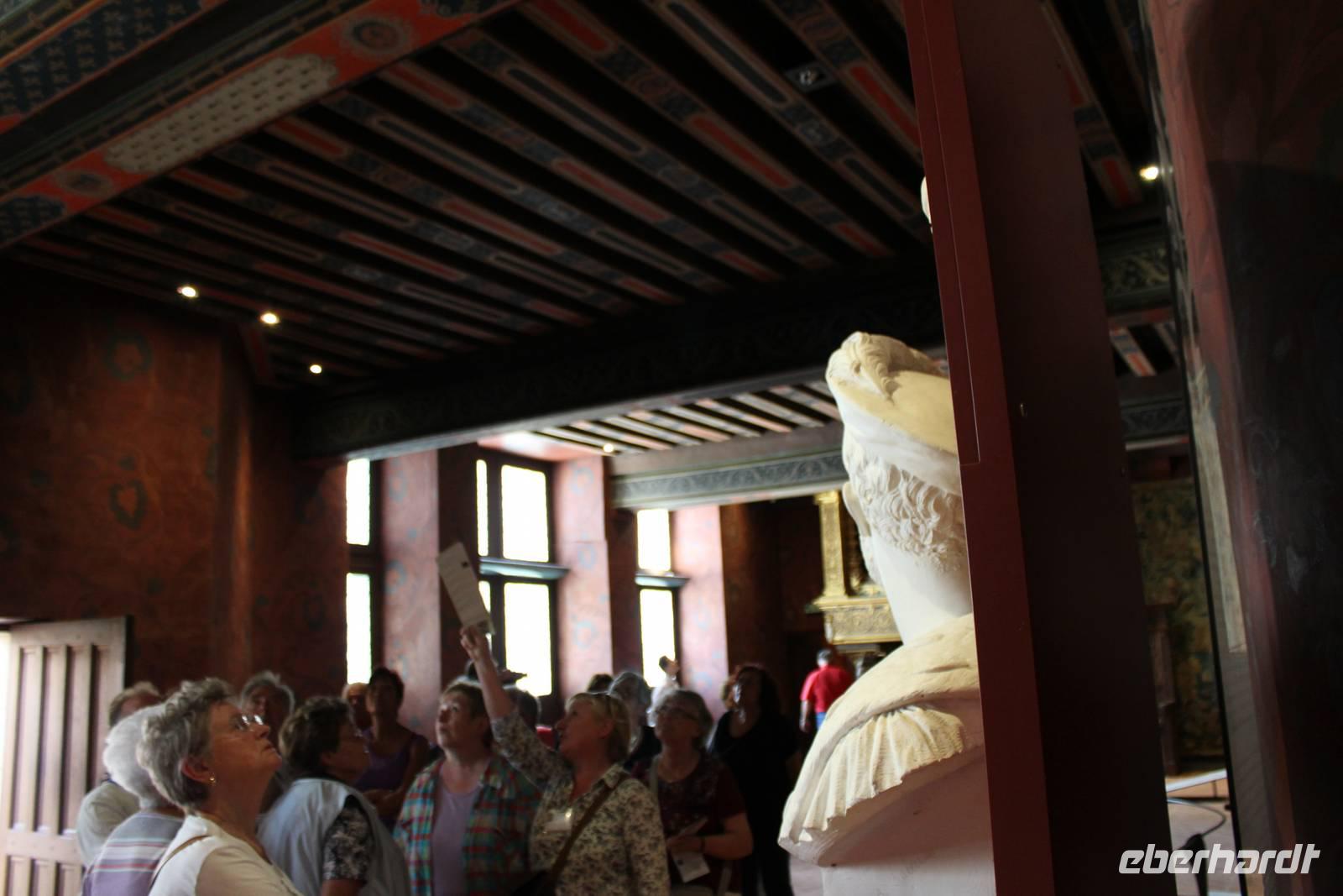 Der ganze Vormittag stand heute zur freien Verfügung. Einige stöberten durch die Geschäfte und kauften beim „soldes" (Schlussverkauf) ein oder spazierten zum Blumenmarkt oder in die Altstadt und vieles mehr. Es gab noch vieles zu entdecken bevor wir unsere Koffer wieder in den Bus einluden und nach Amboise fuhren. Dort sahen wir uns das Schloss Amboise und das Schloss Clos Lucé an. Der hier im Schloss Amboise geborene Charles VIII hatte bei seinen Kriegszügen in Italien die Renaissance mitgebracht. Francois I hielt rauschende Feste dort ab. Zwei wuchtige Türme erlaubten, das Schloss auf einer wendelförmigen Rampe im Inneren zu Pferd zu erreichen. Die Räume zeigen Möbel von der Gotik bis zum Stil Louis Philippe und kostbare Wandteppiche. In der dem heiligen Hubertus geweihten Kapelle sagt man, seien die Überreste von Leonardo da Vinci bestattet. Dann besuchten wir Clos Lucé. Leonardo da Vinci lebte nur 3 Jahre in Amboise, sehr verehrt von Francois I, der ihm das Schlösschen Clos-Lucé überließ. Im Inneren wie im Park gibt es viel zu bestaunen und Entdecken. Der Höhepunkt unter anderem sind circa 60 Modelle des technisch wie künstlerisch begabten Leonardo da Vinci. In der anschließenden Freizeit flanierten alle noch durch den netten Ort. Danach bezogen wir das Herrenhaus „Domaine des Thomeaux", eines von vielen Schlössern und Herrensitzen an der Loire. Dieses Anwesen ist jetzt ein Hotel, in dem jedes Zimmer individuell nach einem Thema ausgestattet ist, wie zum Beispiel Luxor, Peru, Nairobi, Alpage und vieles mehr. Nach dem Abendessen im Herrenhaus genossen die Meisten noch den lauen Sommerabend bevor wir müde in unsere Betten fielen und von Königen und Schlössern träumten.