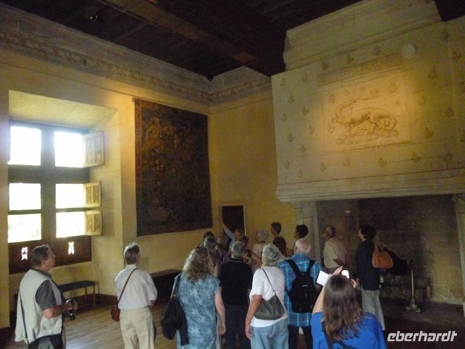 Zuerst fuhren wir nach Chissay, um auf dem Fluss Cher bei einer Bootsfahrt das prachtvolle Schloss Chenonceau erst einmal vom Wasser aus zu besichtigen. Sechs Damen haben den Bau dieses Juwels unter den Schlössern geleitet. Es hat seine Inneneinrichtung erhalten, weil die Bauern dem Besitzer für erwiesene Wohltaten dankbar waren, und das Schloss vor der Plünderung durch eifernde Revolutionäre bewahrten. Auch deshalb ist es einer der am meisten besuchten Schlösser Frankreichs. Nun ging es zur Weinverkostung in der um die Ecke gelegenen Weinkellerei „Cave du Père Auguste". Vor fast einem Jahrhundert schlug der Gründer „Vater Auguste" einen Weinkeller in die Felsen, auf dem seine Weinreben wuchsen. Heute ist die Kellerei im Besitz der 5. Generation des Gründers, der Familie Godeau und sie kooperieren auch mit dem Schloss Chenonceau. Nach einer kurzen Besichtigung des kleinen, aber feinen Weinkellers, verkosteten wir verschiedene Weine der Touraine - Weisswein, Roséwein, Rotwein und Schaumwein und dazu gab es Baguette, Tomaten und Rillettes. Lecker! Was ein Gaumenschmaus! Viele nahmen sich dann auch ein paar Flaschen Wein mit nach Hause. Beschwingt fuhren wir zurück in unsere Domaine, um uns Auszuruhen - auch im Spa und Wellness-Bereich - und um Zeit zu haben uns hübsch zu machen für unser Gala-Abendessen im Schloss Chissay. Wir fuhren nach Chissay und genossen ein geschmackvolles 4-Gang-Menü in einem besonderen Ambiente, eben in diesem Schloss, das sonst vorher Könige und den letzten Premierminister der 3. Republik Frankreichs, beherbergte. Zufrieden und müde erreichten wir unser Herrenhaus danach wieder und fielen ins Bett.