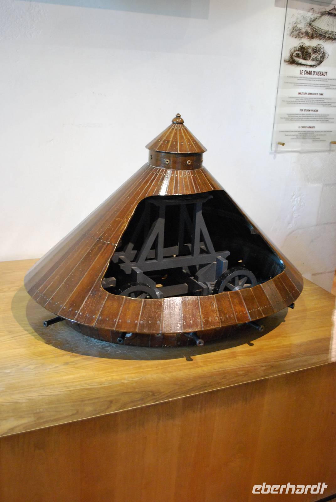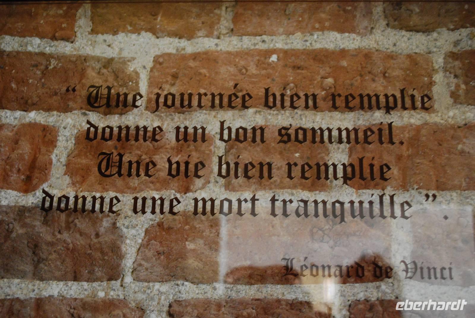 Bei einem schönen und sonnigen Nachmittag beginnt unser halbtägiger Ausflug in Amboise und Umgebung. In Amboise stehen Ihnen zwei Möglichkeiten zur Verfügung: entweder das Schloss von Amboise mit Michael oder der Clos Lucé mit mir. Vom ursprünglichen königlichen Schloss ist nicht mehr viel erhalten geblieben. Immerhin hat das Schloss aber seine Kavaliertürme behalten. Diese Türme haben nämlich die Besonderheit keine Treppen und ein sehr hohes Gewölbe zu haben, um deswegen auch mit Pferden zugänglich zu sein. In der Kapelle ist auch das vermutete Grab von Leonardo Da Vinci zu sehen. Der berühmte Italiener hat nämlich die drei letzten Jahre seines Lebens in Frankreich verbracht und zwar im Schlösschen Le Clos Lucé auf der anderen Seite von Amboise. Das Clos Lucé präsentiert heute zahlreiche Modelle, die nach den Skizzen des Künstlers und Ingenieurs gebaut worden sind. Schon im 16. Jahrhundert hat Da Vinci den Panzer oder den Fallschirm erfunden! Am Abend erwartet uns ein 4-Gang-Menü in einem Schlossrestaurant: das Chateau de Chissay.