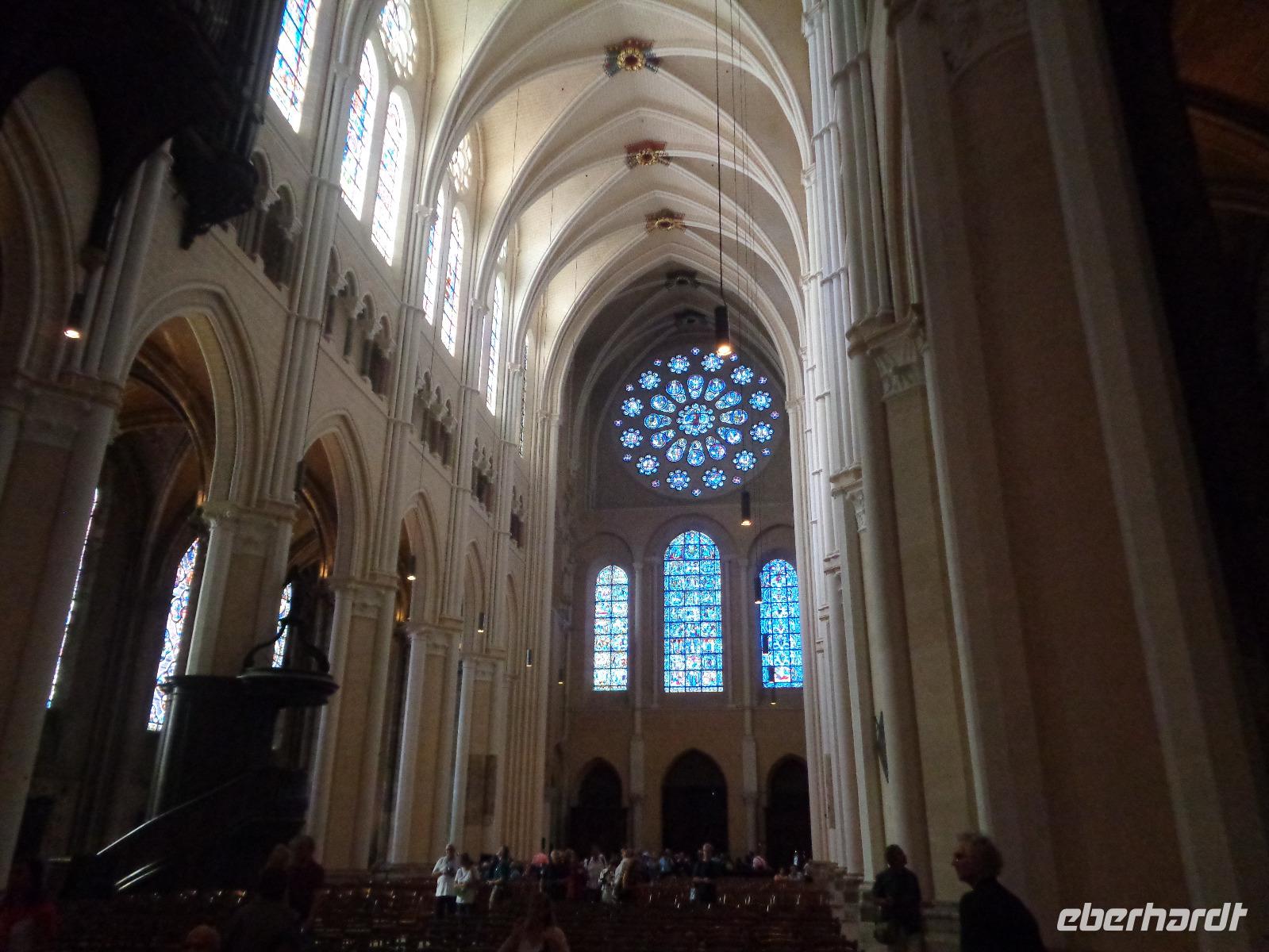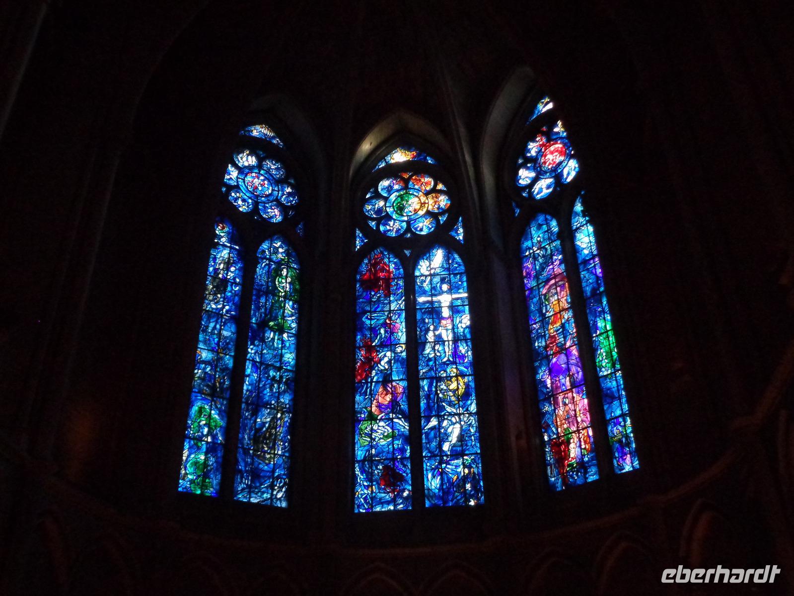 Den lächelnden Engel und die berühmte Rosette können wir leider nicht sehen, denn es wird restauriert und ein Teil der Fassade und das Hauptportal sind verhüllt. Aber wir bewundern die Krönungsstätte der französischen Könige von innen und bestaunen die Ausmaße der neuen gotischen Bauweise. Die bunten Glasfenster von Marc Chagall, 1974 in der Achsialkapelle installiert, runden unseren Kurzbesuch ab.