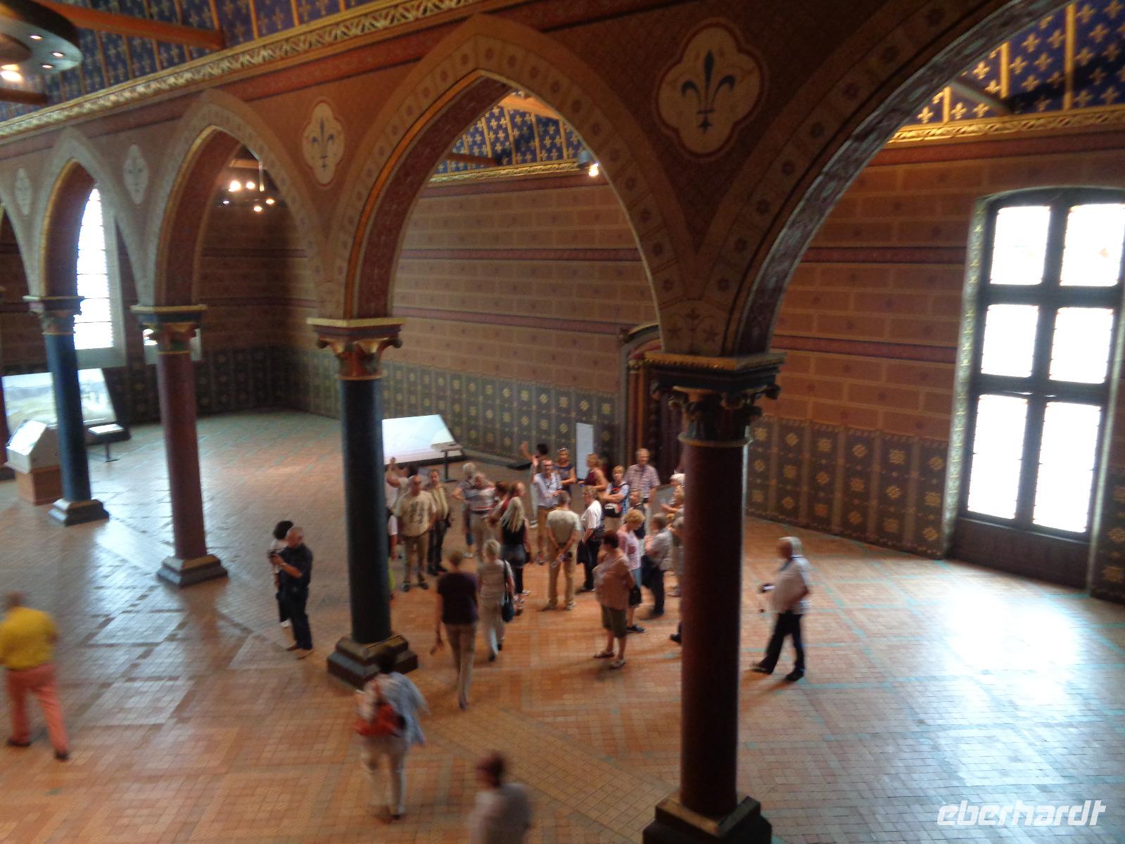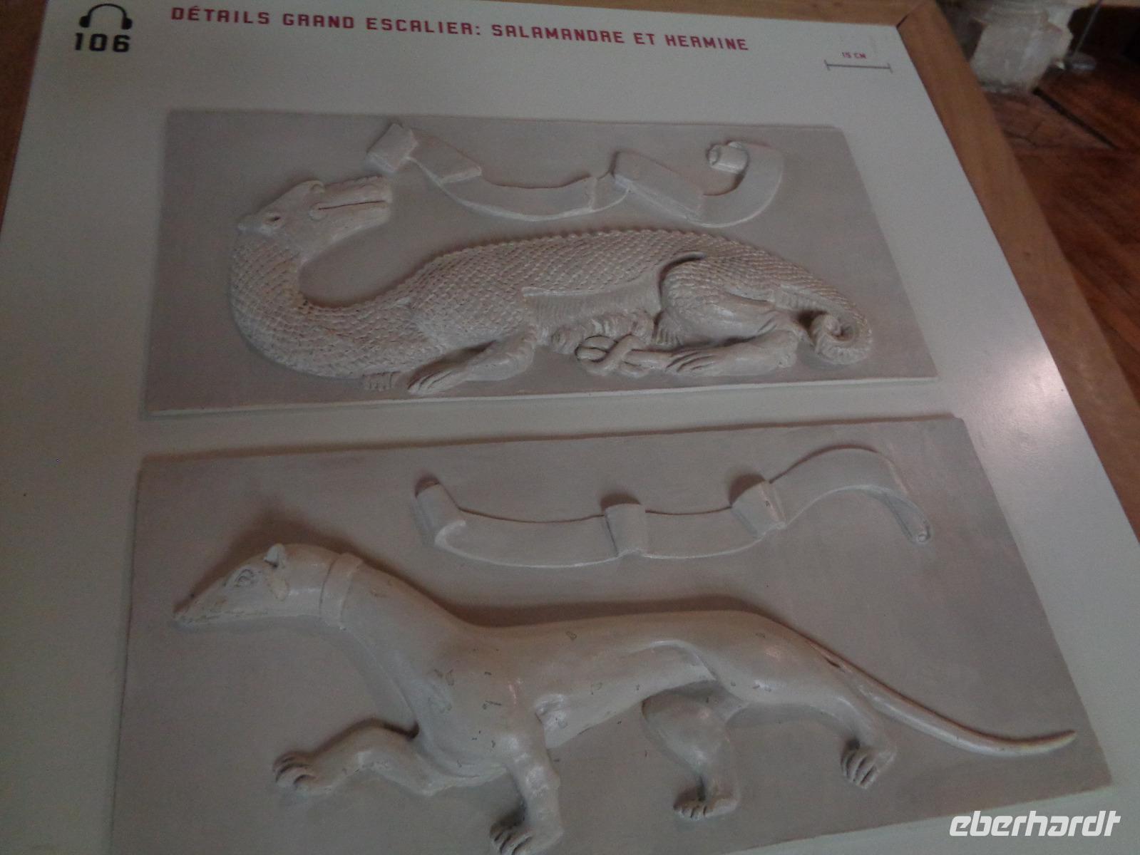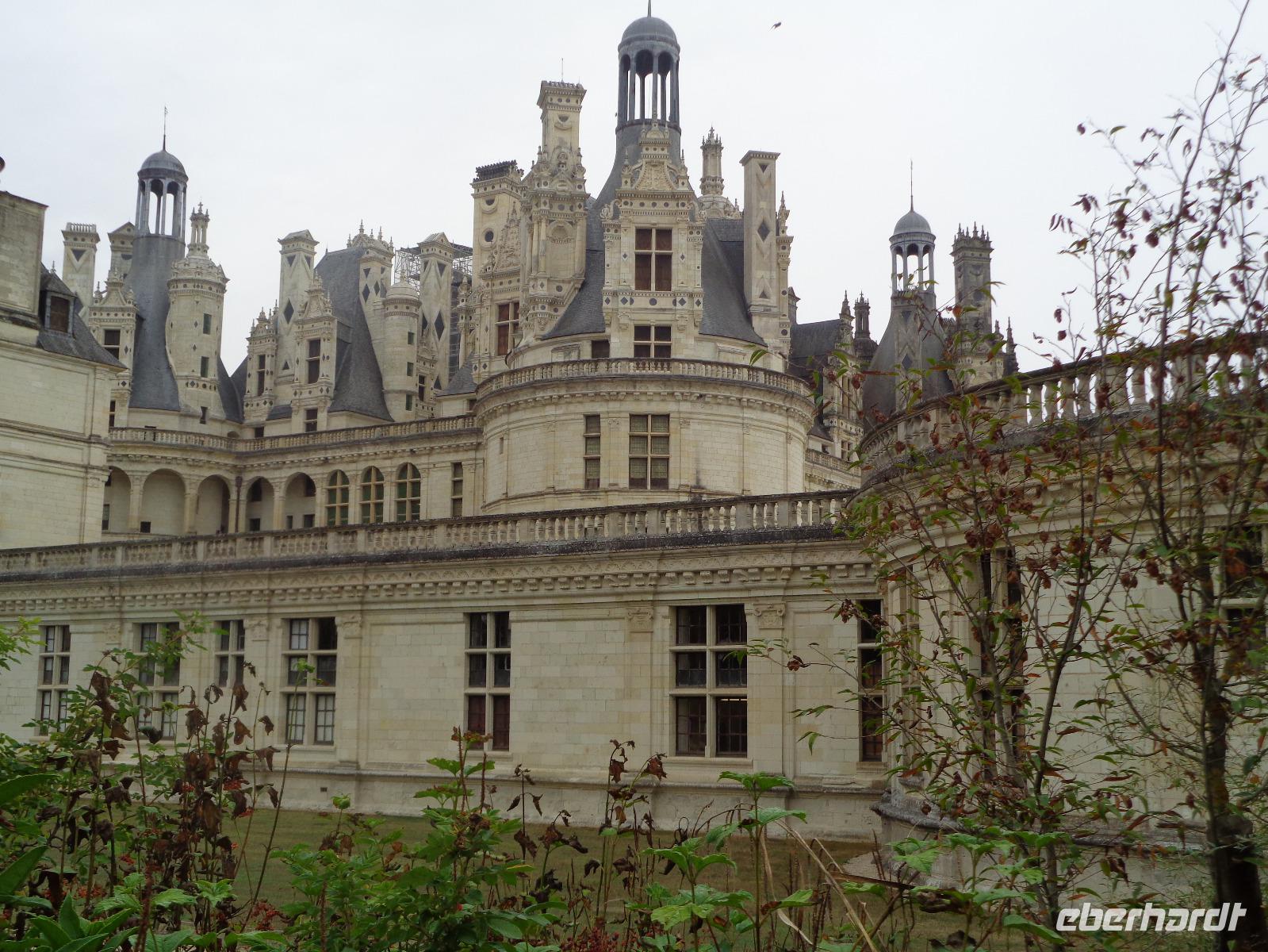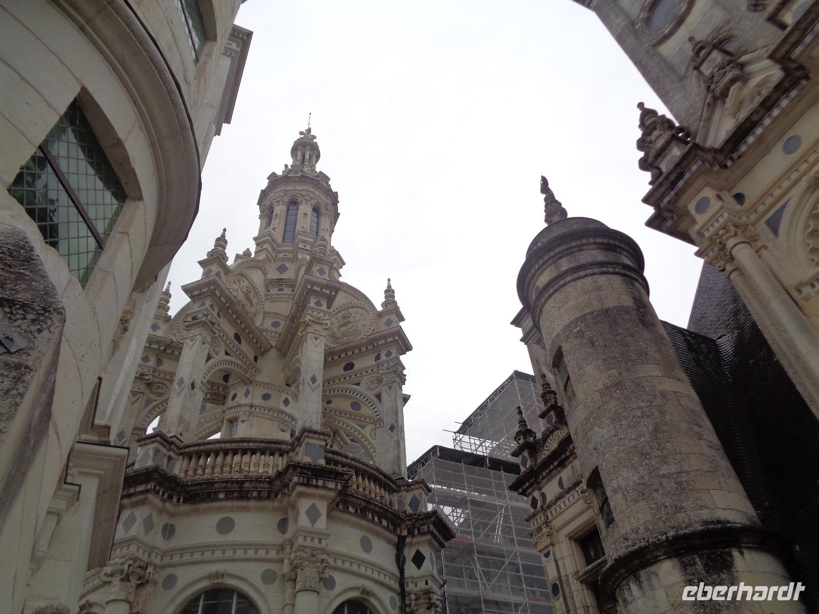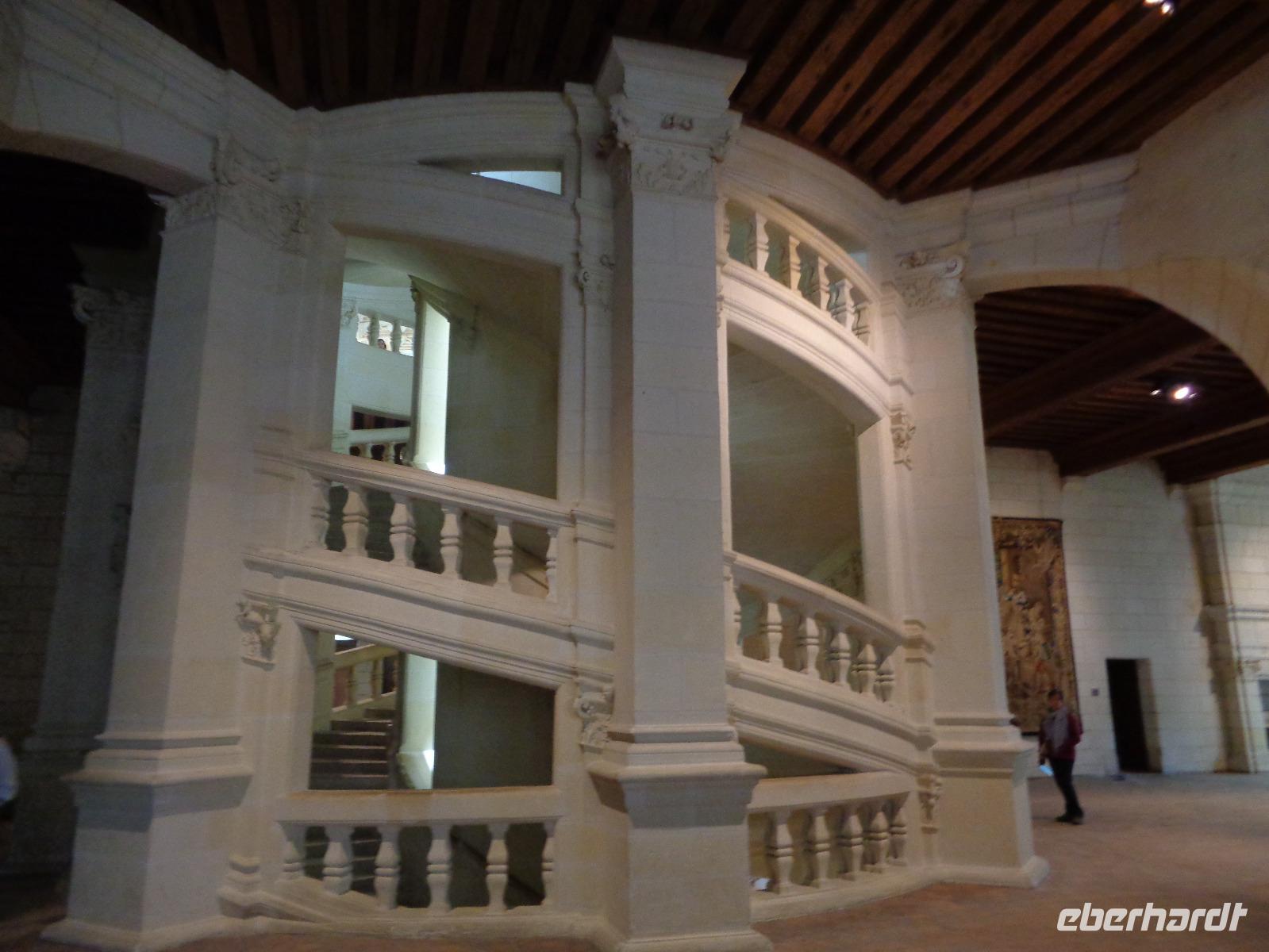 Mittags geht es weiter zum Schloss Chambord. Michael schöpft wieder aus einem unerschöpflich scheinenden Reservoir von Geschichtswissen und zeigt uns das Château de Chambord mit seinen Schätzen. Dieses Schloss ist das größte der Loire-Schlösser. Franz I. widmete sich nach dem Tode Leonardo da Vinci's im Jahre 1519 dem Neubau in einem großen Jagdgebiet. Der Bau sollte ein meisterhaftes Jagd- und Prunkschloss werden, in dem sich Franz I. gern als Kaiser des Heiligen Römischen Reiches gesehen hätte. Das klappte nicht, aber Kaiser Karl V. war einmal im Schloss zu Gast und rühmte die künstlerische Gestaltung. Sehr beeindruckend ist für uns auch die doppelläufige Wendeltreppe, die möglicher Weise nach einer Idee von Leonardo da Vinci gefertigt wurde. König Ludwig XIV. feierte hier rauschende Feste und lud zur Jagd ein. Anfang des 18. Jhd. befand sich der polnische König Ladislaus I. hier im Exil. Der französische verdiente Marschall Moritz von Sachsen lebte im Schloss bis 1750, besaß ein Gestüt und wollte 100 Rehe hier ansiedeln, nachdem er Sümpfe trocken legen ließ. Auch ein Theater richtete er im Schloss ein.