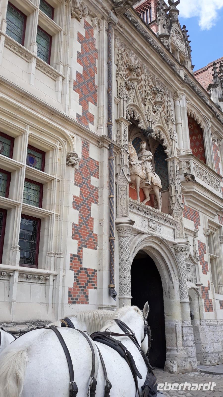 Bei strahlendem Sonnenschein fuhren wir am nächsten Tag Richtung Norden nach Chartres, wo wir eine der bedeutsamsten Kathedralen Frankreichs besuchten. Dort beeindruckten vor allem die noch aus dem Mittelalter erhaltenen Fenster mit ihrem mystischen Licht. Deutlich wurde auch, dass diese Kathedrale - obwohl ebenfalls gotisch und in nahezu gleicher Zeit wie Reims entstanden - einen vollkommen anderen Charakter und Eindruck hinterließ. Unsere Tour führte uns schließlich weiter nach Blois, wo wir bereits vor dem Schlosstor von zwei Kutschen erwartet wurden. Mit unserem Gespann passieren wir die wichtigsten Sehenswürdigkeiten der Stadt und fühlen uns dabei in die Zeit der französischen Könige zurückversetzt. Im Anschluss besuchten wir unter kundiger Führung von Reiseleiter Michael die Innenräume des Schlosses, bevor wir mit dem Bus zu unserem heutigen Hotel nach Tours fuhren.