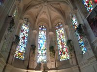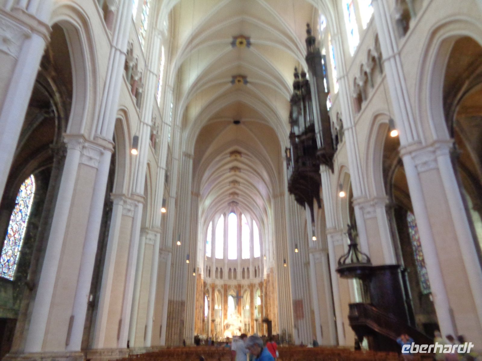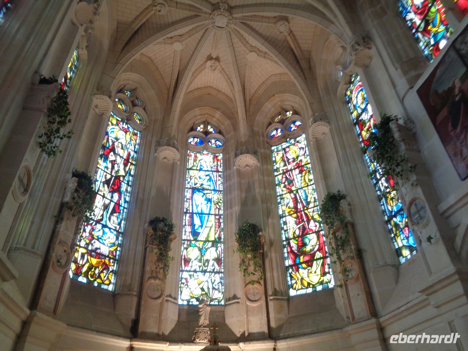Es wird immer noch restauriert. Wir bewundern die gotische Bauweise mit ihren Dimensionen und lieben die bunten Glasfenster von Marc Chagall von 1974.