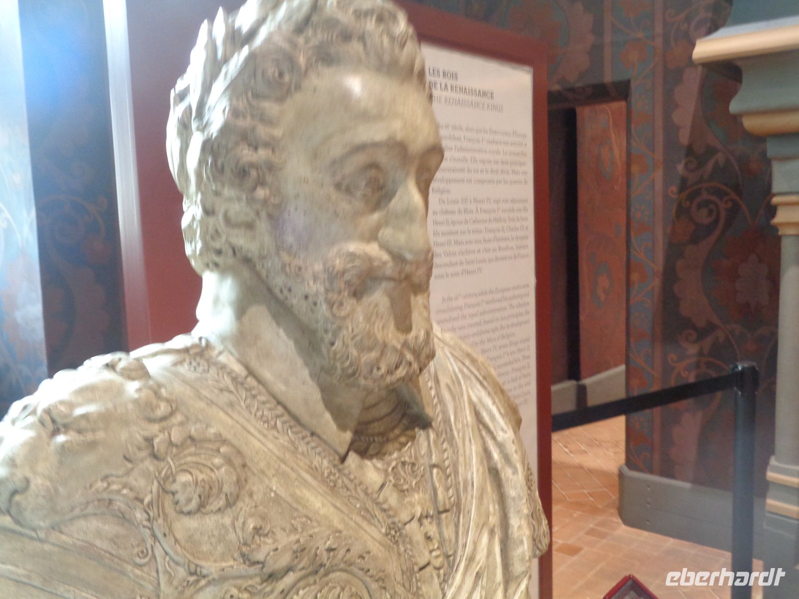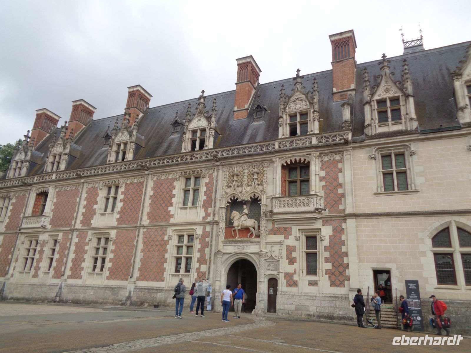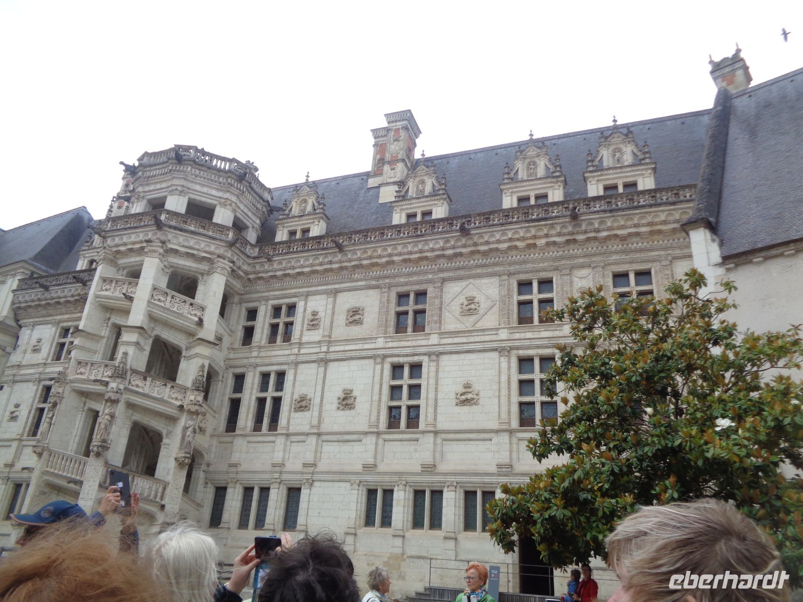 Weiter geht es vorbei an Orléans weiter nach Blois. Vor dem Schloss warten bereits 2 Kutschen auf uns, mit denen es über die Brücke über die romantische Loire geht, die wenig Wasser führt, und wieder zurück durch die Altstadt zum Schlossplatz. Das Schloss von Blois mit seinen 4 Fassaden erinnert an 4 verschiedene Epochen. 7 Könige und 10 Königinnen lebten hier, wie Franz I., Ludwig XII. und Katharina von Medici mit ihrem mörderischen Sohn Heinrich III. Der ließ hier den Herzog von Guise und dessen Bruder, den Kardinal von Lothringen, ermorden und wurde später selbst Opfer eines Mordes. Im 17. Jahrhundert erhielt der Bruder von Ludwig XIII., Gaston von Orléans, einen Flügel des Schlosses, den er modernisierte.