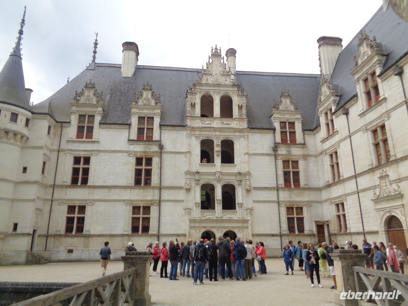 Aus der Festung von Colombiers aus dem 12. Jahrhundert, die abgerissen wurde, ließ der Finanzminister Breton unter Franz I. ein Schloss im Renaissancestil mit einem großen Garten bauen. Anfang des 18. Jahrhunderts gehörte das Anwesen dem Marquis de Castellane, bevor es in die Hände der Familie Hainguerlot und dann im 20. Jhd. der Familie Carvallo überging. Glücklicher Weise sind Schloss und Gärten seit 1920 öffentlich. Wir genießen die romantische Anlage am Cher und fahren weiter zum Schloss Azay-le-Rideau. An der Stelle des Wasserschlosses stand früher die Burg des Ritters Ridel d’Azay, die Karl VII. schleifen ließ. Gilles Berthelot errichtete das Schloss in der ersten Hälfte des 16. Jhd. so, wie wir es heute bewundern können. Über die Familien Raffin und Biencourt gelangte das Anwesen 1906 in den Besitz des französischen Staates. Ein französischer König hat hier nie genächtigt, obwohl alles dafür königlich vorbereitet war. Aber wir waren heute hier und lassen uns von den kostbaren Einrichtungsgegeständen, Gemälden und Möbeln verzaubern. Nach Michaels “Einzelzeit” für die Gäste, die wir für einen Imbiß nutzen, fahren wir zurück nach Tours, der Stadt des heiligen Martins. Michael unternimmt mit uns einen Stadtrundgang und erklärt in schon bekannter kompetenter Manier alle wichtigen Plätze und Gebäude.