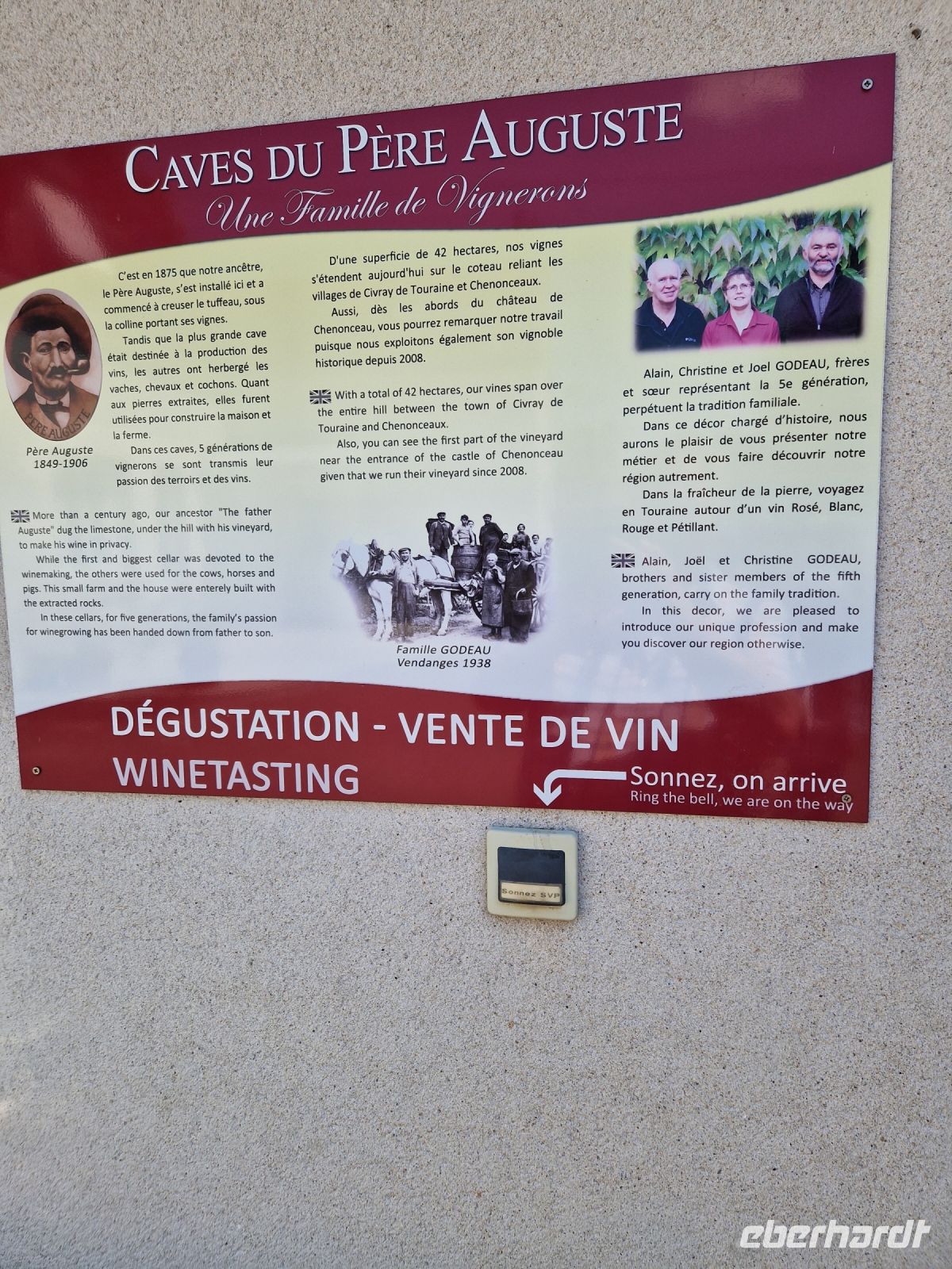 Nach einer kurzen Mittagspause ging es dann nach kurzer Fahrt zum Weingut Caves Du Pere Auguste der Familie Godeau in 5ter Generation. Nach der Begrüßung und Vorstellung durch den Seniorchef gab es eine kurze Führung durch den Weinkeller bevor man sich dann zur Weinprobe begab. Wir durften dann 5 Weine aus eigener Kellerei aus der Region Loire verkosten. Zum krönenden Abschluß gab es dann noch einen Sekt zu verkosten. Man hatte auch die Möglichkeit, die vorgestellten Weine zu erwerben. Zur Weinprobe wurde Baguette und Ziegenkäse oder Rillette gereicht, anschließend nach dem der erworbene Wein im Bus verstaut war ging es zurück nach Tours in unser Hotel, wo uns später eine köstliches Abendessen erwartete.
