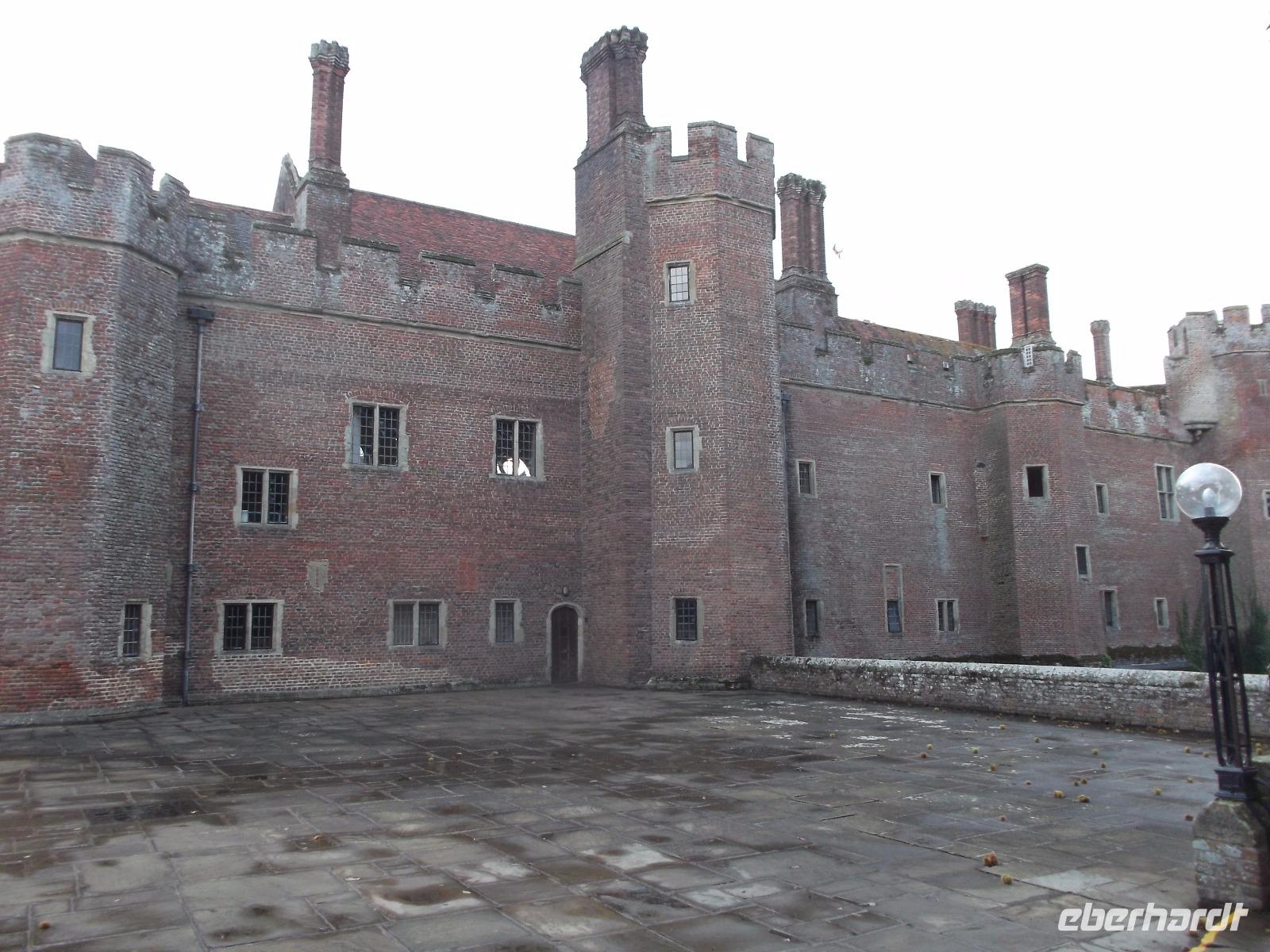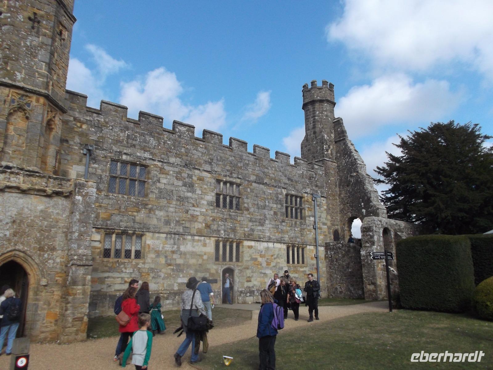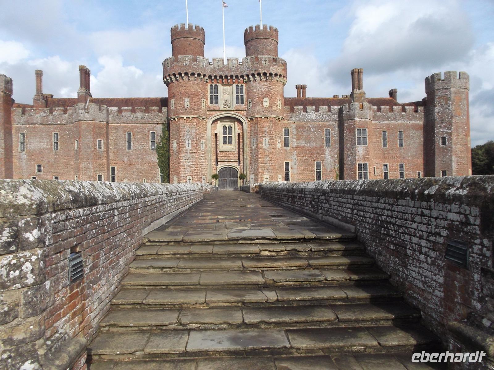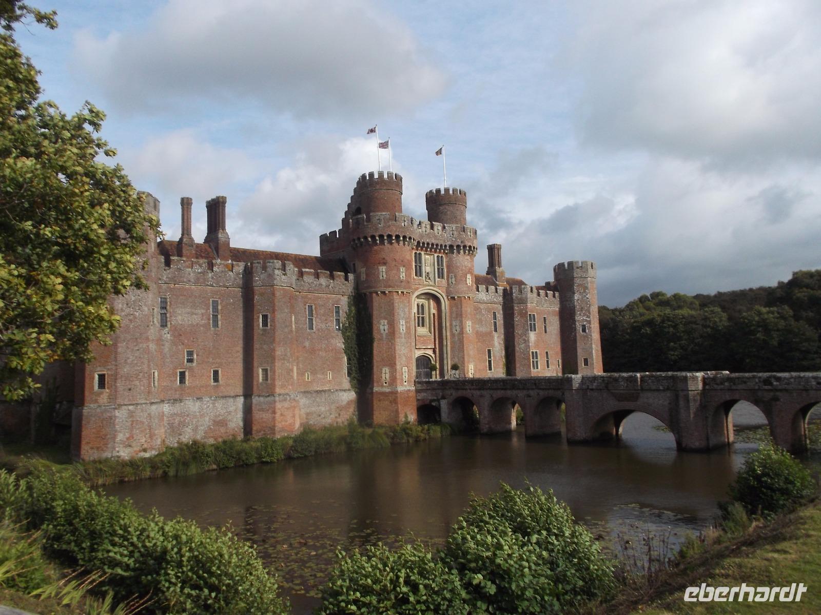 Von Beachy Head fuhren wir zu einem Schloss, das sonst nicht in unseren Programmen auftaucht: Herstmonceux Castle ist eine Wasserburg aus der Tudorzeit, ungewöhnlicherweise als Backsteinbau errichtet. Damals mussten Bauleute und Backsteine aus Flandern nach England gebracht werden. Gebaut wurde damals auf historischem Grund und Boden, denn schon kurz nach der Eroberung Englands durch die Normannen gab es hier eine große Besitzung. 1441 wurde durch die bei Hofe einflussreiche Familie das Backsteinschloss errichtet, aber aus Geschmacksgründen im späten 18. Jh. entkernt und in eine Ruine verwandelt, wobei allerdings alle Außenwände und der Eingangsturm stehenblieben. Wir hörten diese Geschichten bei einer Führung durch die Burg, die heute nicht so ohne weiteres zugänglich ist, denn sie befindet sich in Privatbesitz und beherbergt heute ein Studiencenter der Queens-University aus dem kanadischen Ontario.