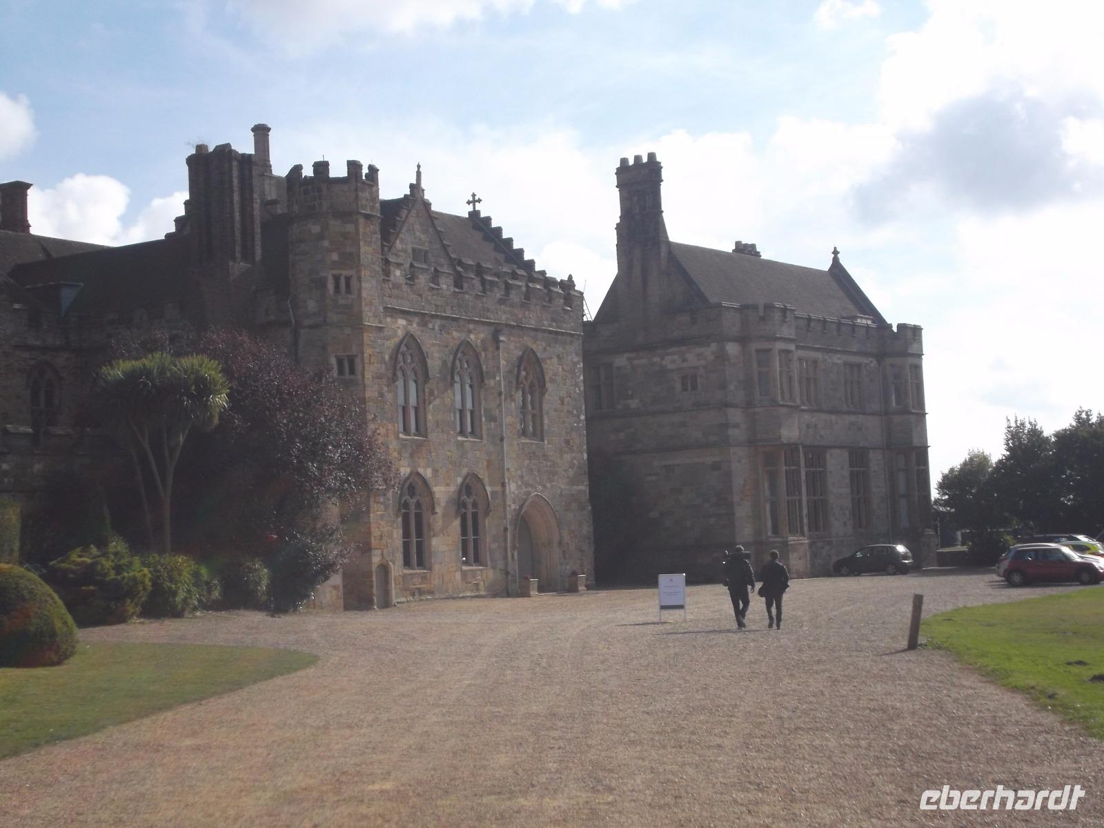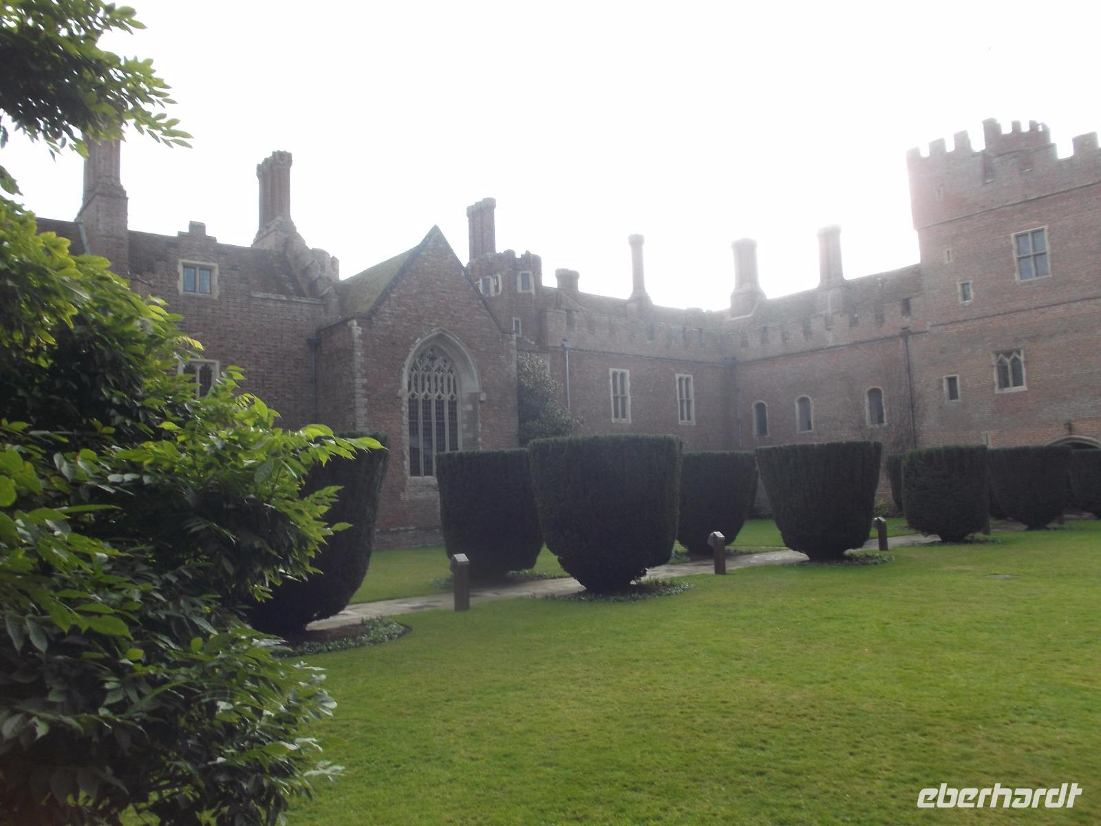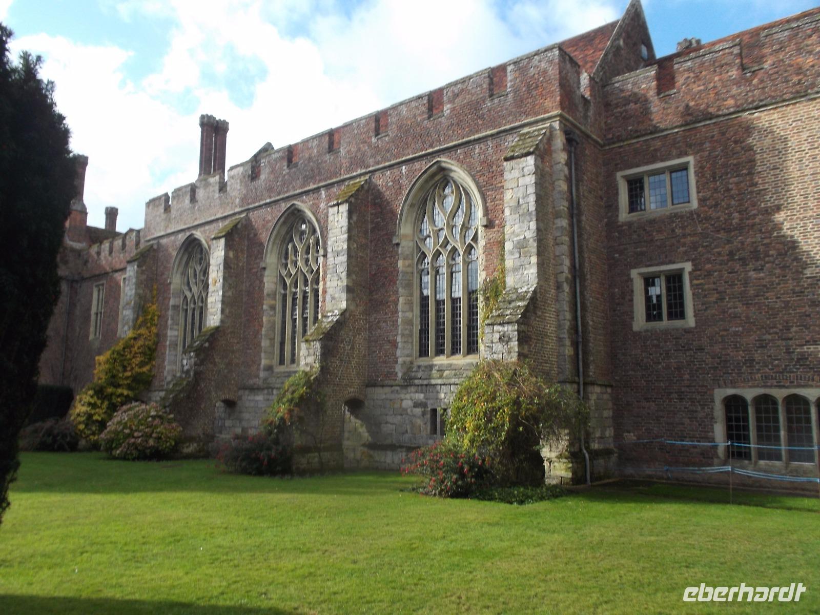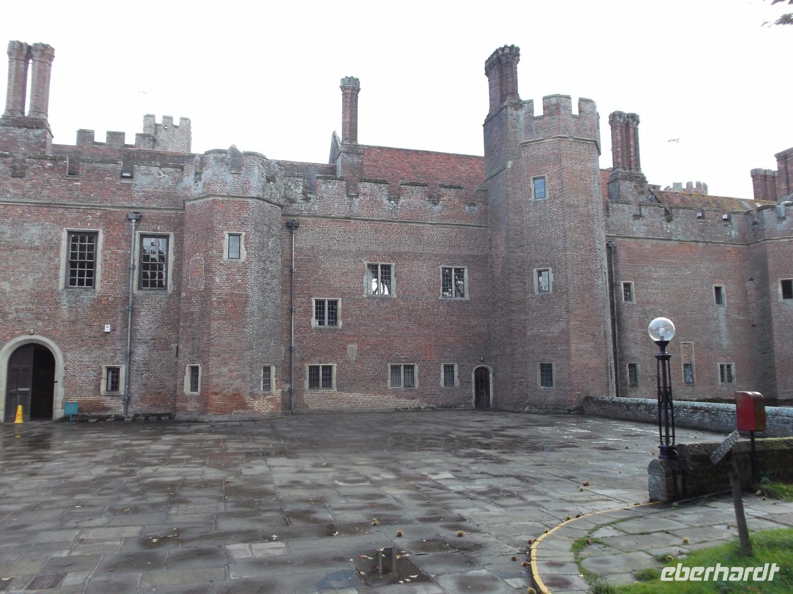 Von Beachy Head fuhren wir zu einem Schloss, das sonst nicht in unseren Programmen auftaucht: Herstmonceux Castle ist eine Wasserburg aus der Tudorzeit, ungewöhnlicherweise als Backsteinbau errichtet. Damals mussten Bauleute und Backsteine aus Flandern nach England gebracht werden. Gebaut wurde damals auf historischem Grund und Boden, denn schon kurz nach der Eroberung Englands durch die Normannen gab es hier eine große Besitzung. 1441 wurde durch die bei Hofe einflussreiche Familie das Backsteinschloss errichtet, aber aus Geschmacksgründen im späten 18. Jh. entkernt und in eine Ruine verwandelt, wobei allerdings alle Außenwände und der Eingangsturm stehenblieben. Wir hörten diese Geschichten bei einer Führung durch die Burg, die heute nicht so ohne weiteres zugänglich ist, denn sie befindet sich in Privatbesitz und beherbergt heute ein Studiencenter der Queens-University aus dem kanadischen Ontario.