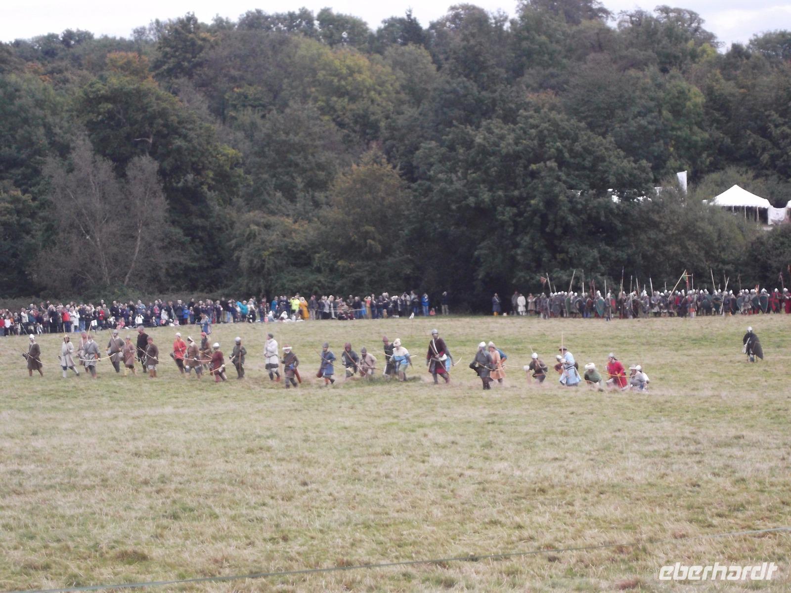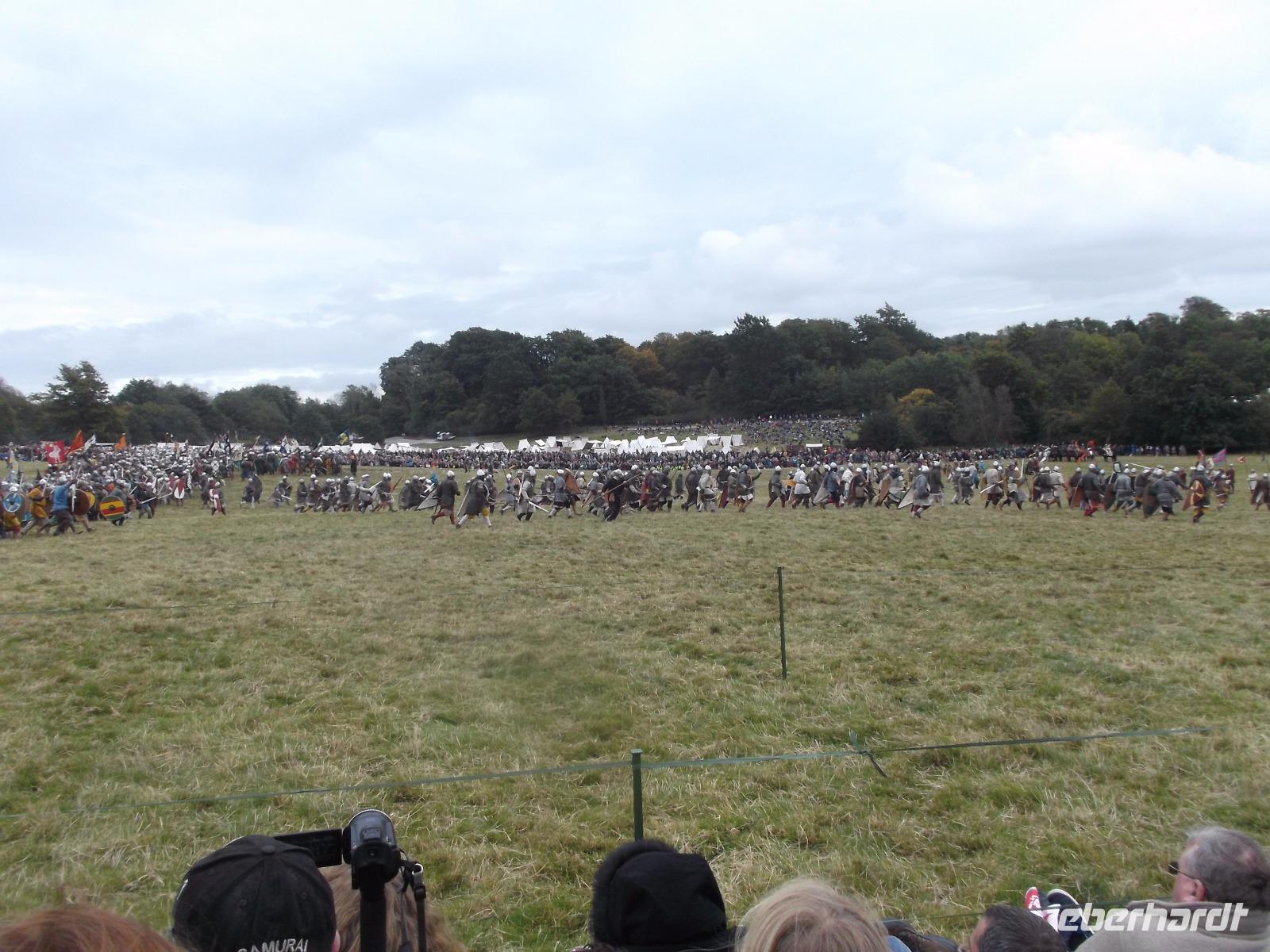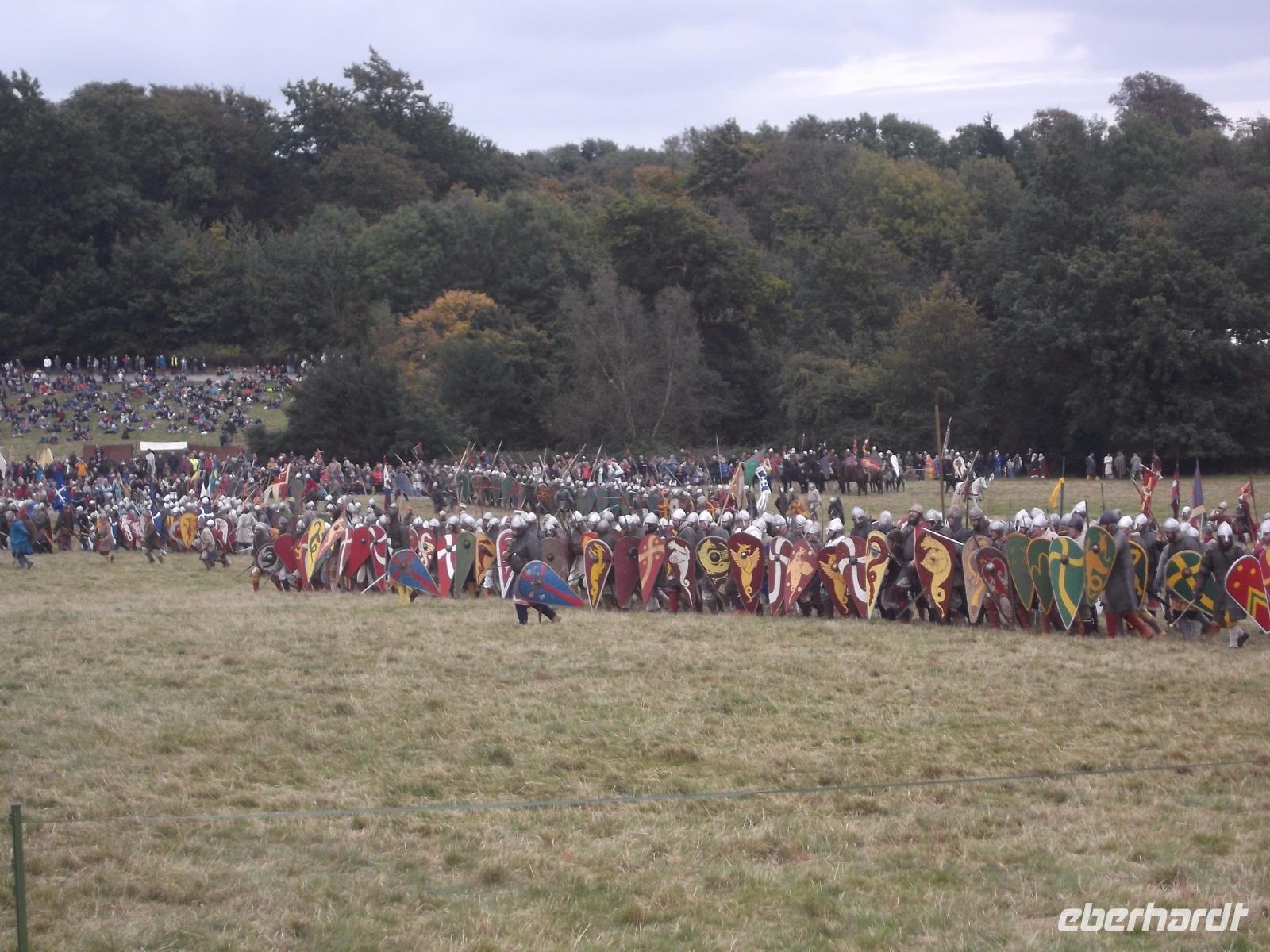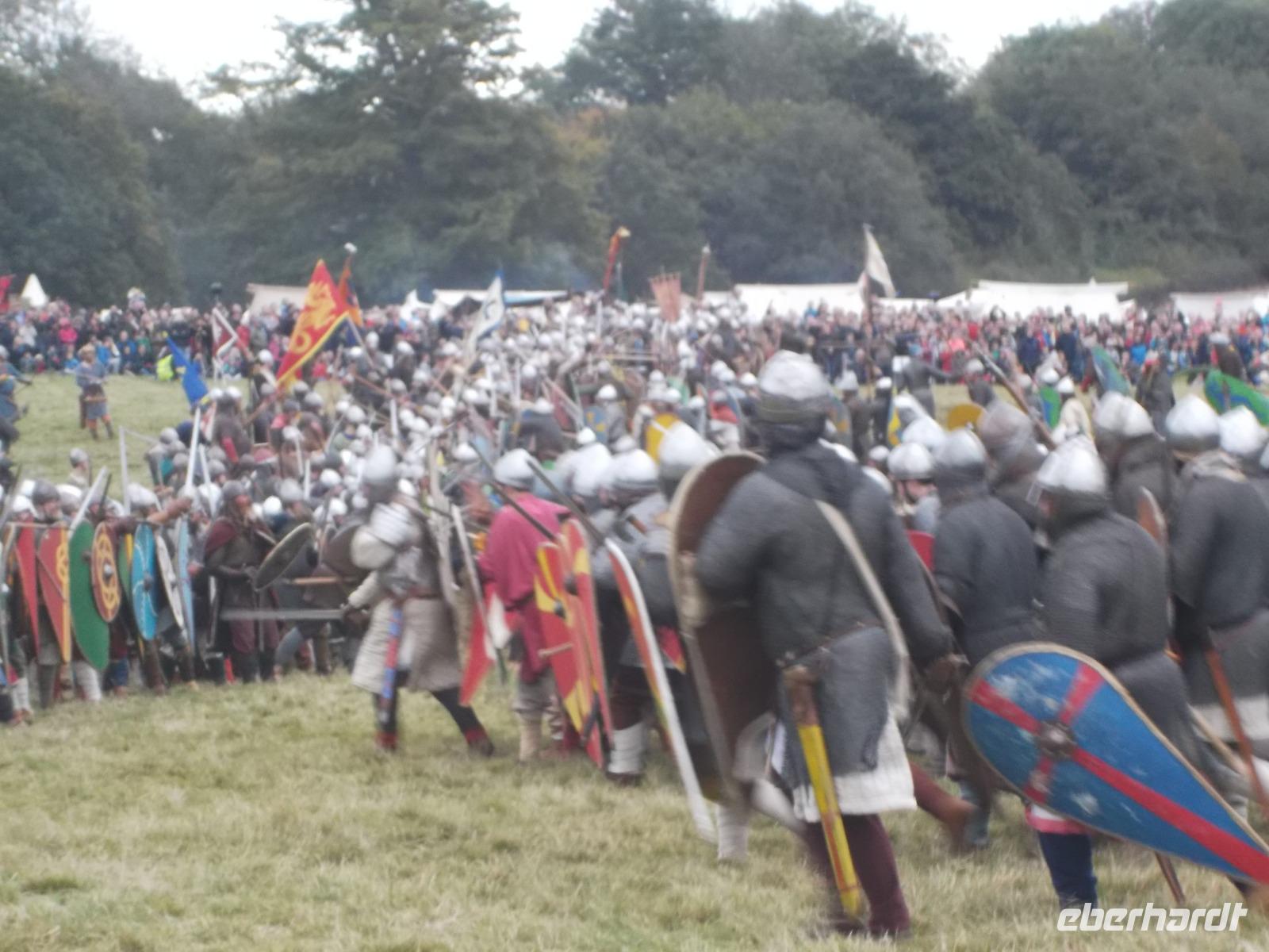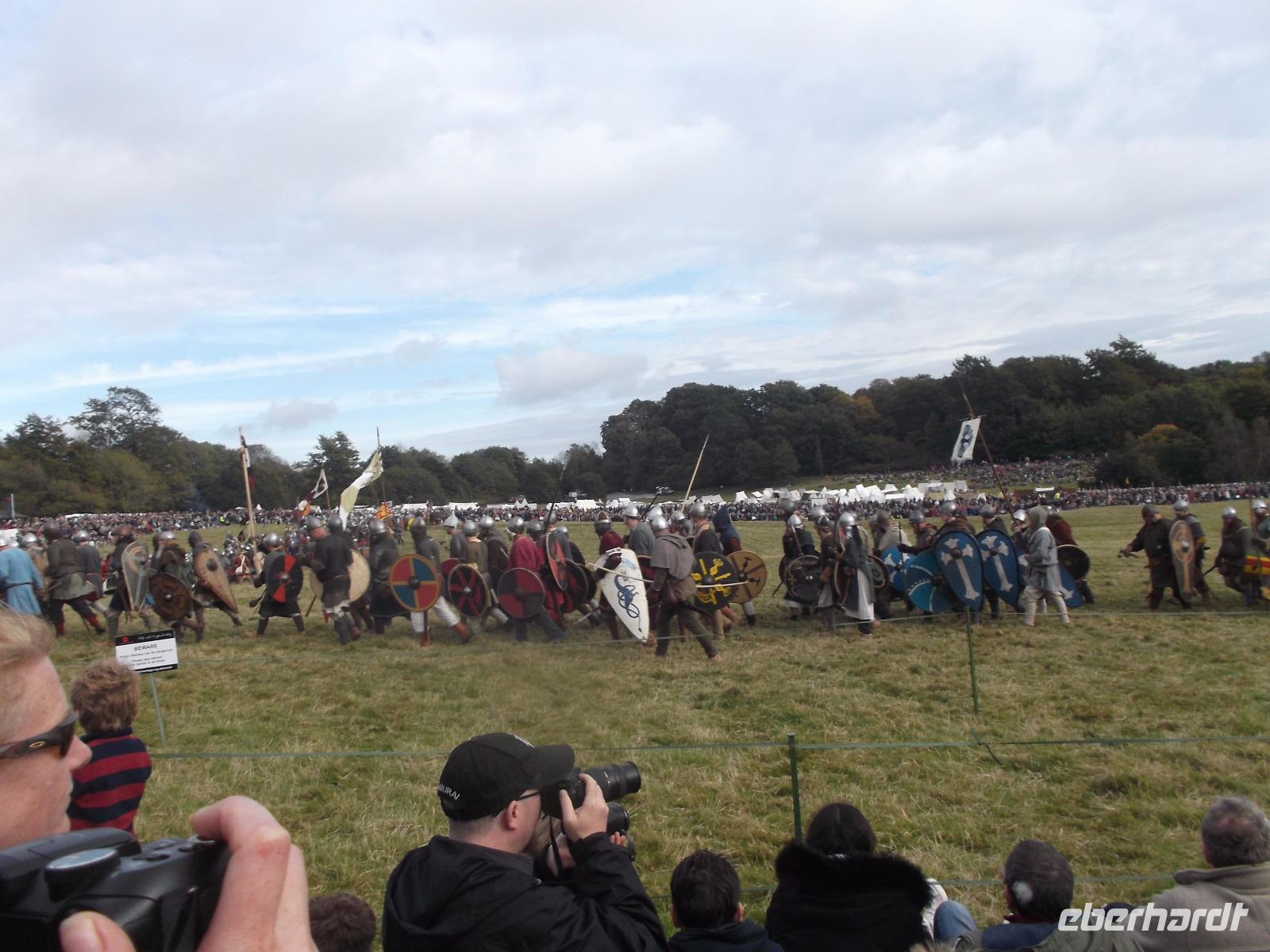 Pünktlich um drei Uhr nachmittags ging es dann los: während ein Kommentator über Mikrofon die Hintergründe erläuterte und die mitwirkenden „Truppen" vorstellte, formierten sich die Schlachtreihen und dann begannen mehrere hundert als Angelsachsen und Normannen Ausstaffierte, die historischen Vorgänge der Schlacht bei Hastings nachzustellen