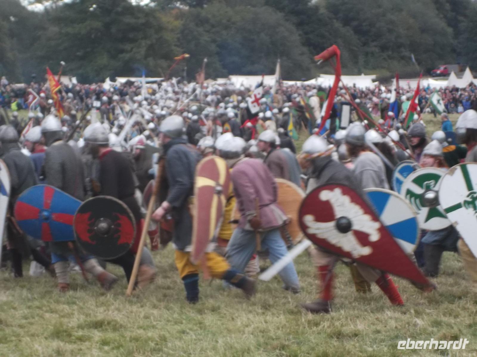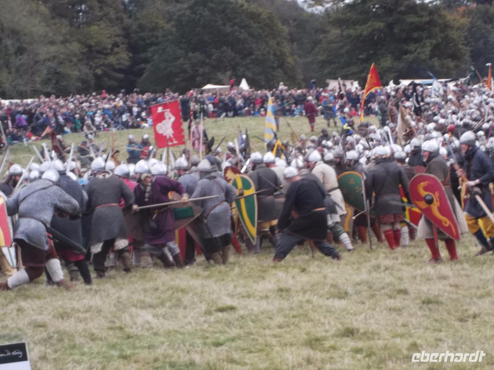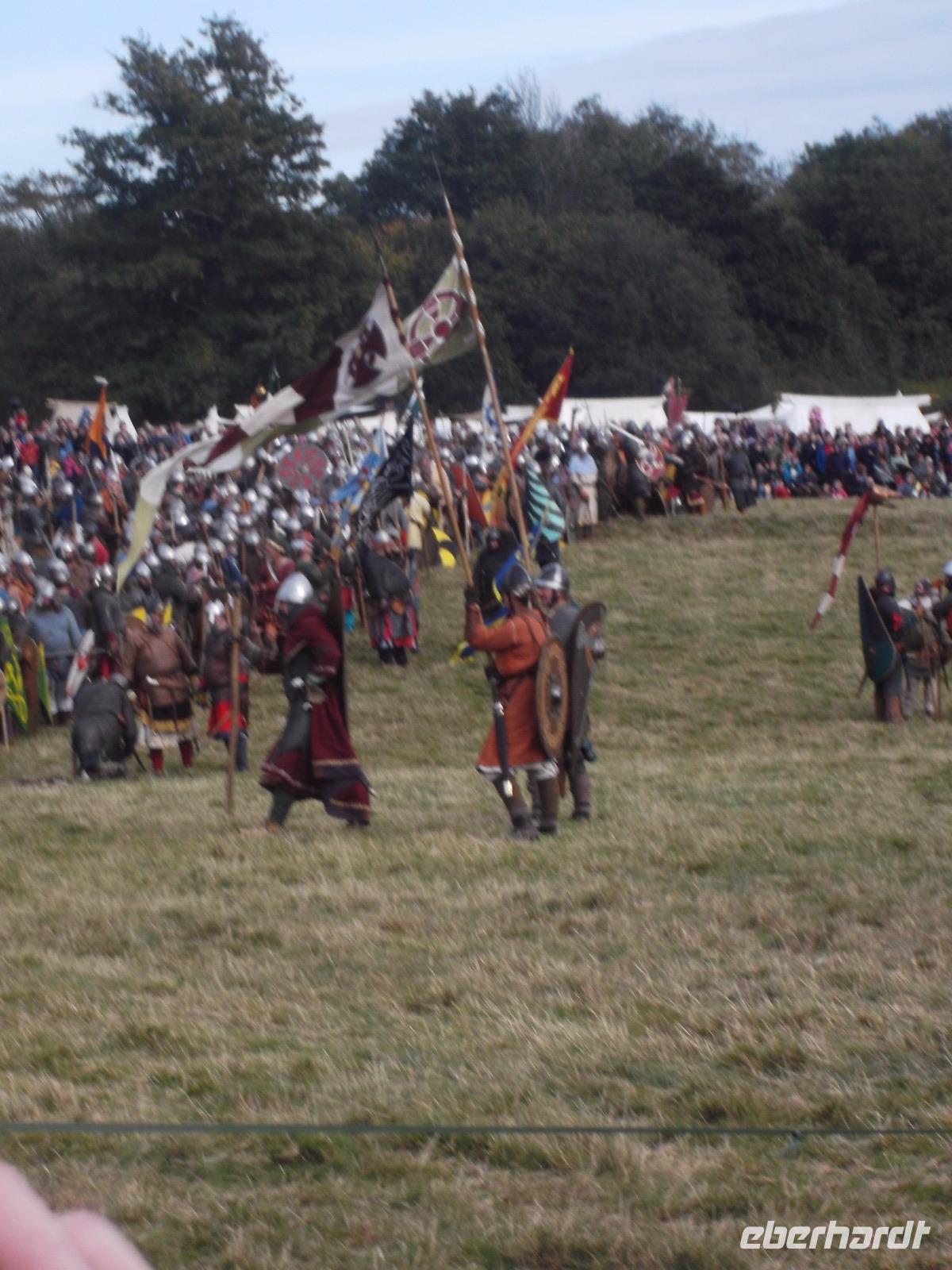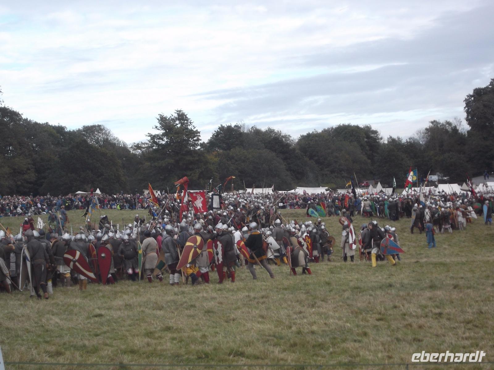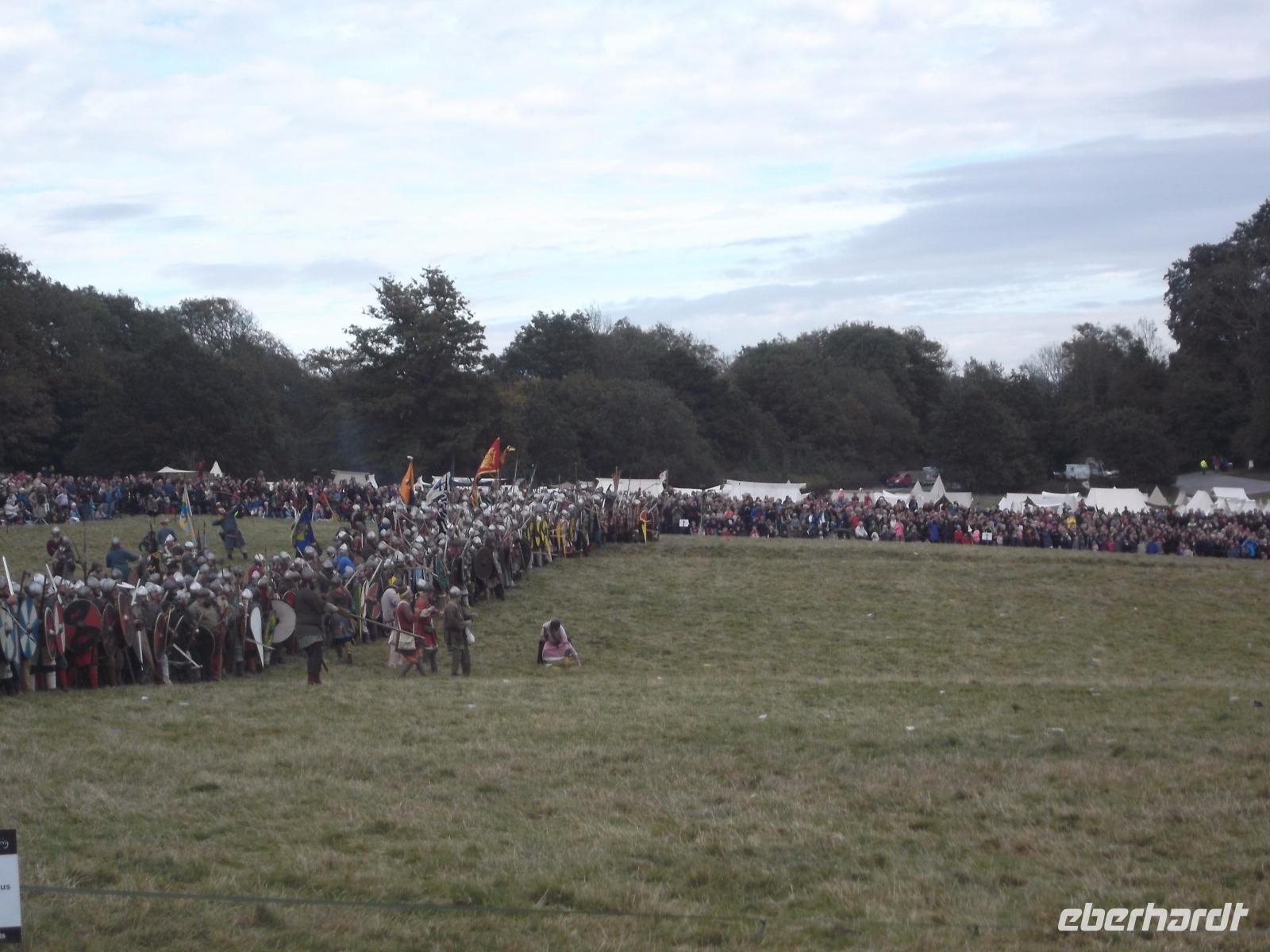 Pünktlich um drei Uhr nachmittags ging es dann los: während ein Kommentator über Mikrofon die Hintergründe erläuterte und die mitwirkenden „Truppen" vorstellte, formierten sich die Schlachtreihen und dann begannen mehrere hundert als Angelsachsen und Normannen Ausstaffierte, die historischen Vorgänge der Schlacht bei Hastings nachzustellen