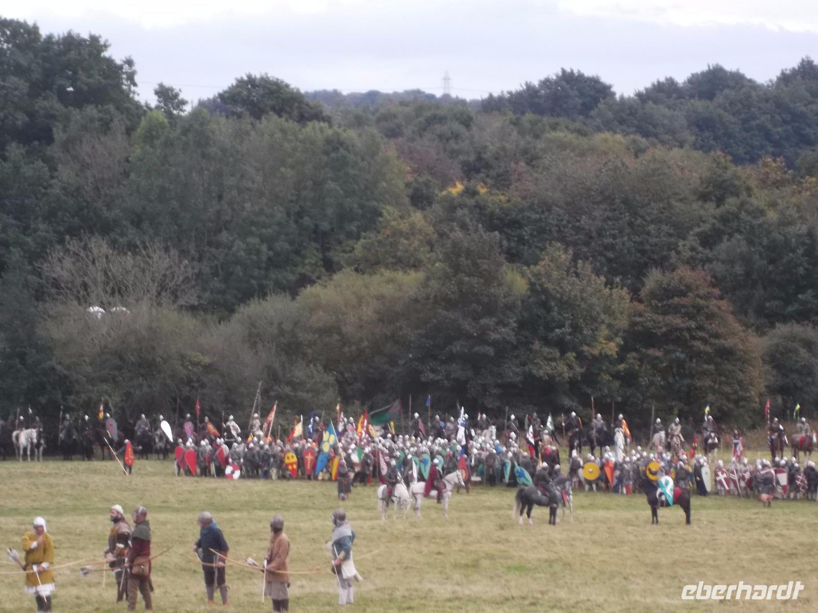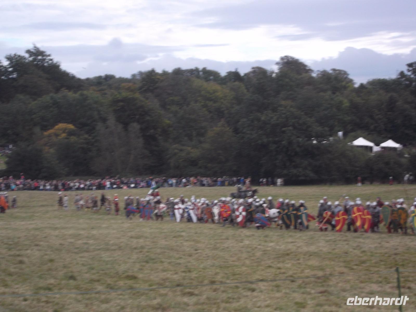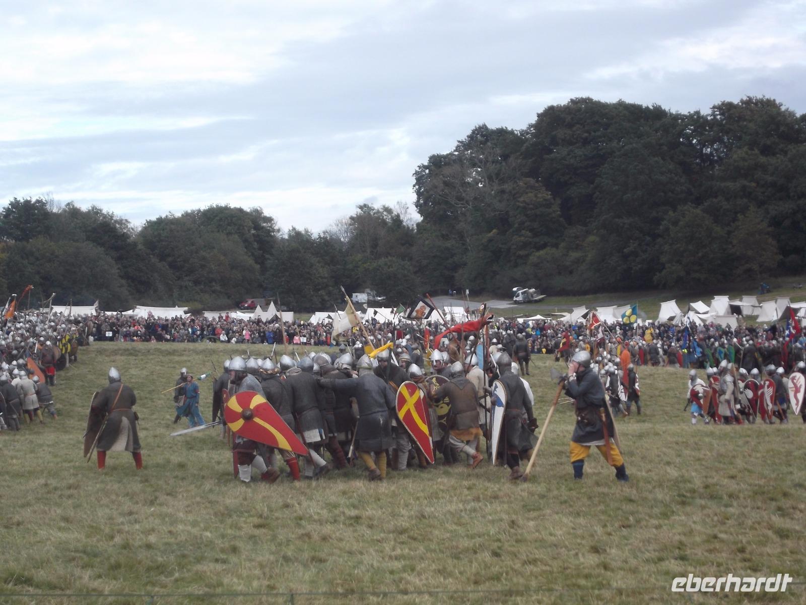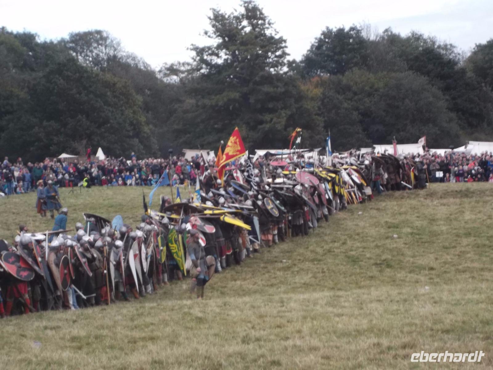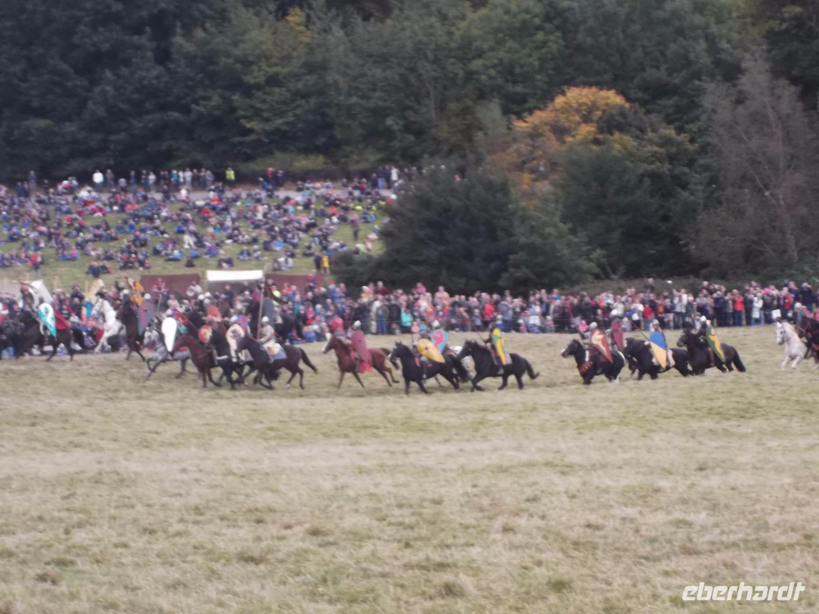 Pünktlich um drei Uhr nachmittags ging es dann los: während ein Kommentator über Mikrofon die Hintergründe erläuterte und die mitwirkenden „Truppen" vorstellte, formierten sich die Schlachtreihen und dann begannen mehrere hundert als Angelsachsen und Normannen Ausstaffierte, die historischen Vorgänge der Schlacht bei Hastings nachzustellen
