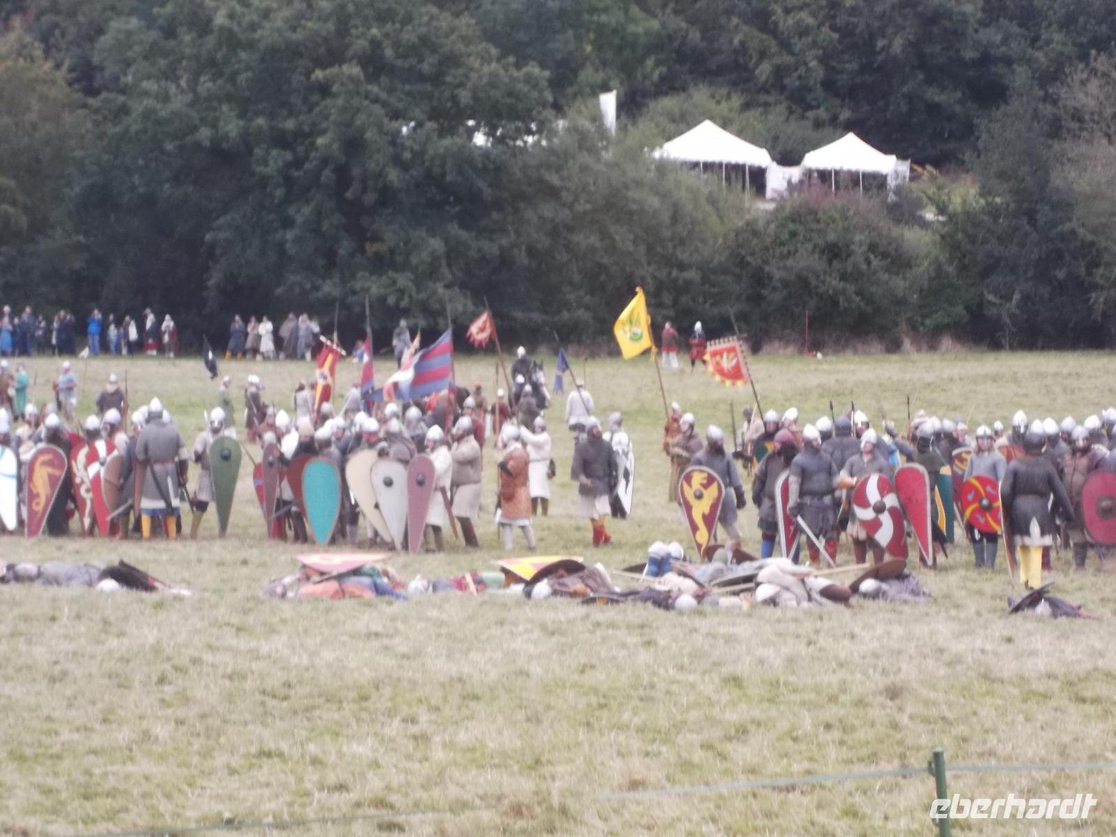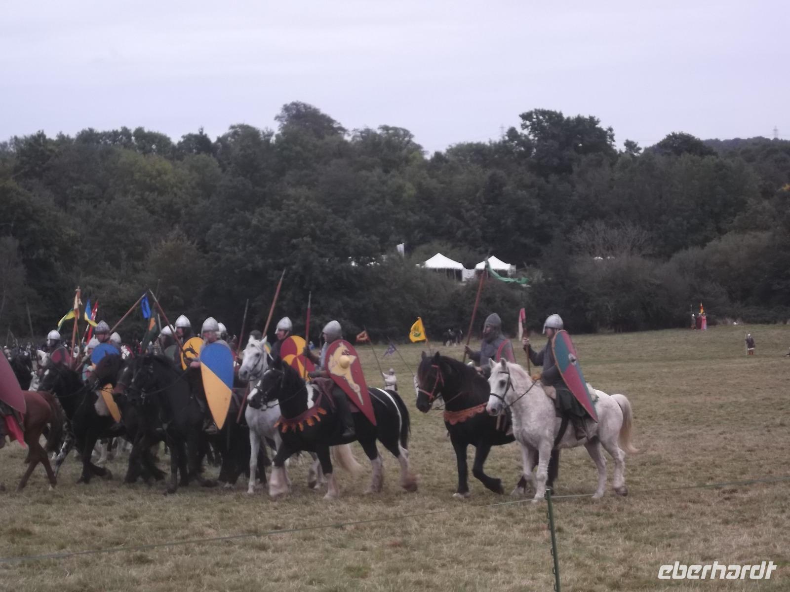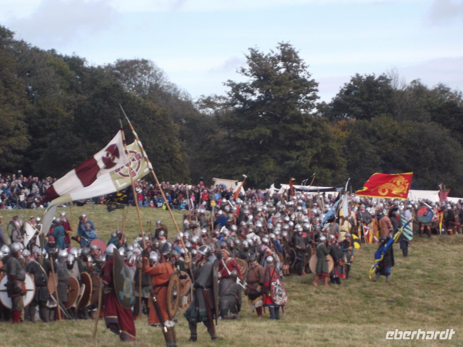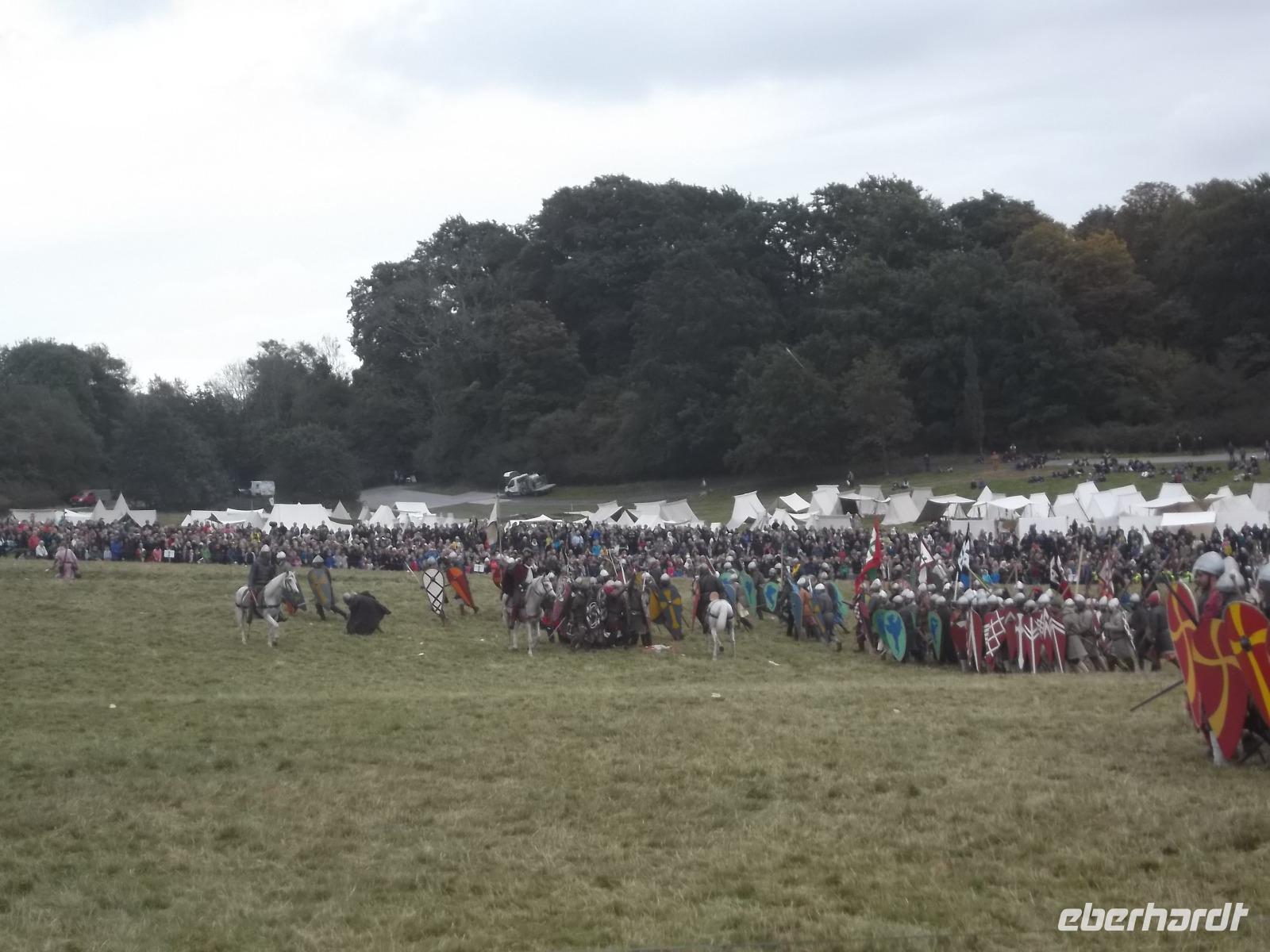 Pünktlich um drei Uhr nachmittags ging es dann los: während ein Kommentator über Mikrofon die Hintergründe erläuterte und die mitwirkenden „Truppen" vorstellte, formierten sich die Schlachtreihen und dann begannen mehrere hundert als Angelsachsen und Normannen Ausstaffierte, die historischen Vorgänge der Schlacht bei Hastings nachzustellen