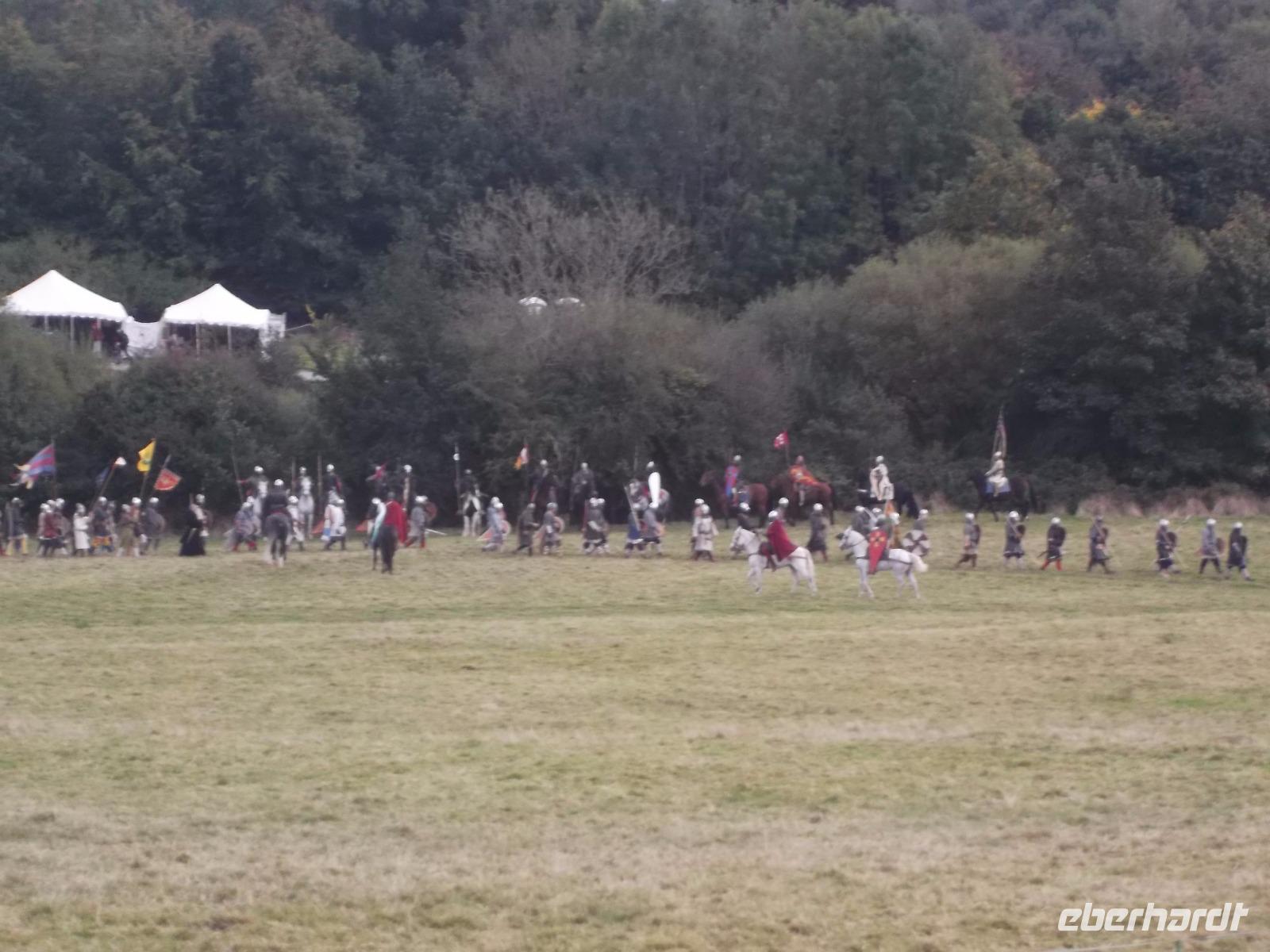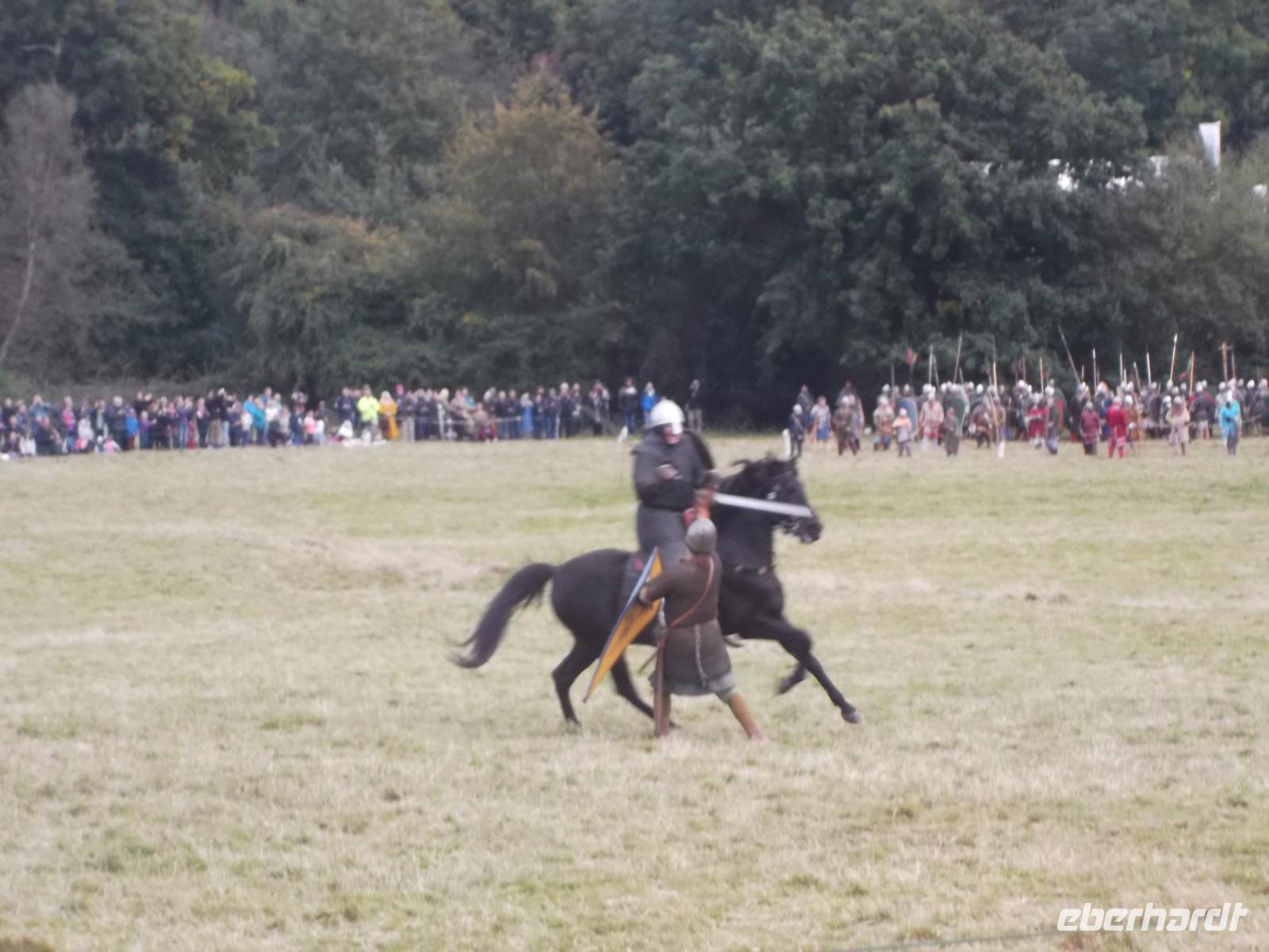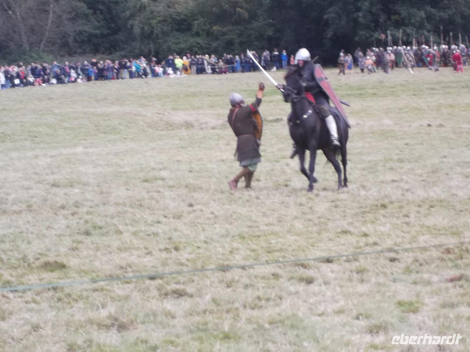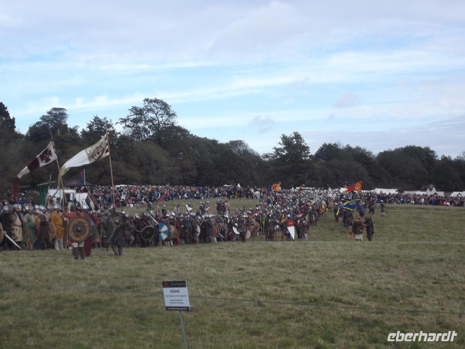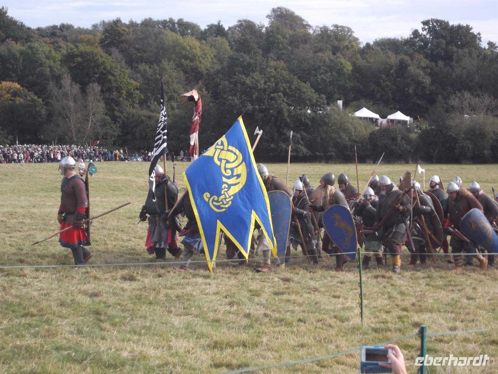 Pünktlich um drei Uhr nachmittags ging es dann los: während ein Kommentator über Mikrofon die Hintergründe erläuterte und die mitwirkenden „Truppen" vorstellte, formierten sich die Schlachtreihen und dann begannen mehrere hundert als Angelsachsen und Normannen Ausstaffierte, die historischen Vorgänge der Schlacht bei Hastings nachzustellen