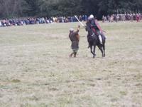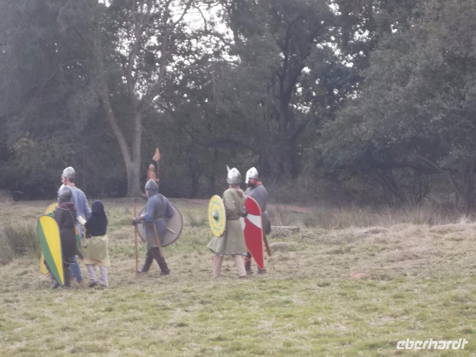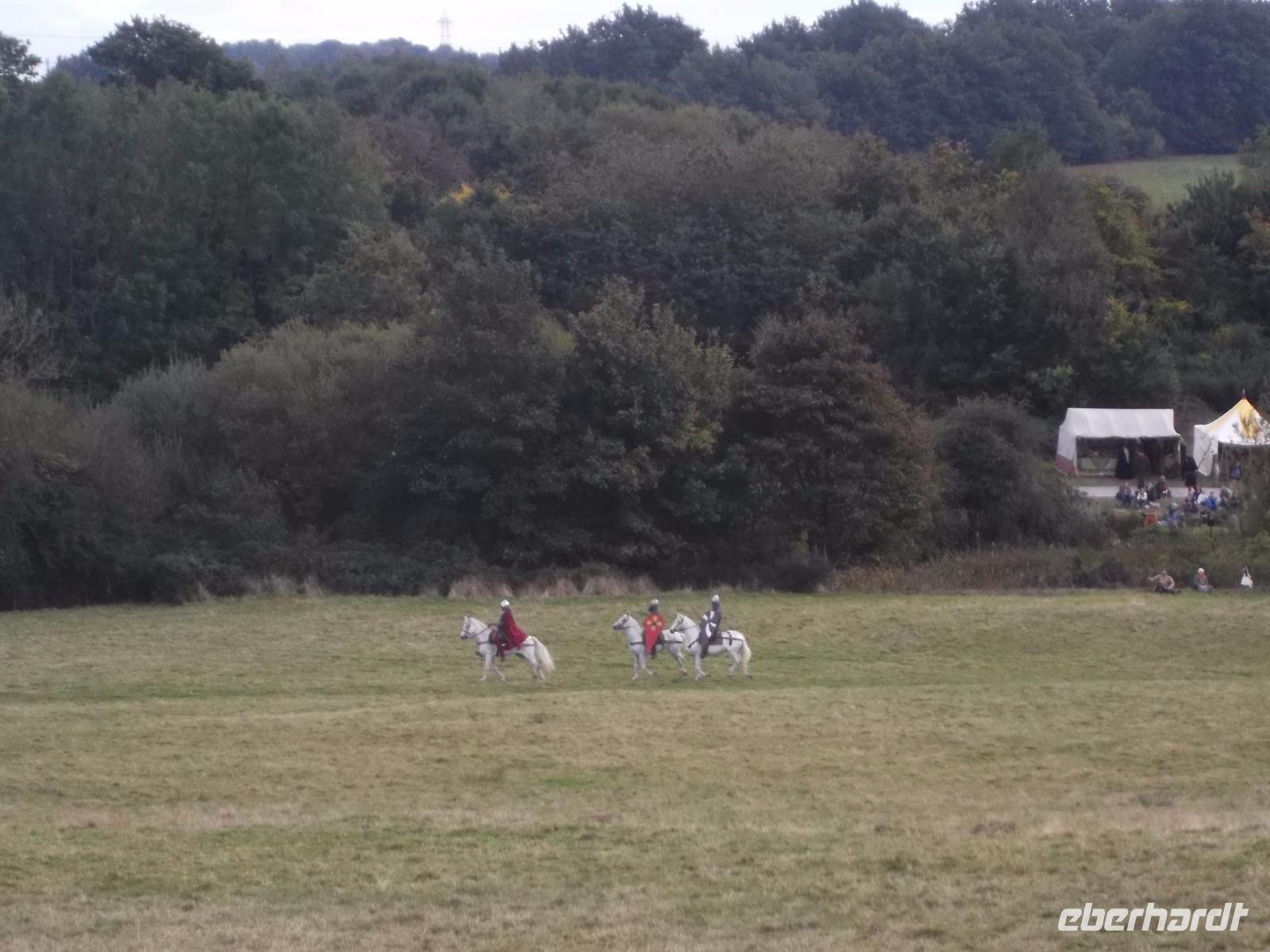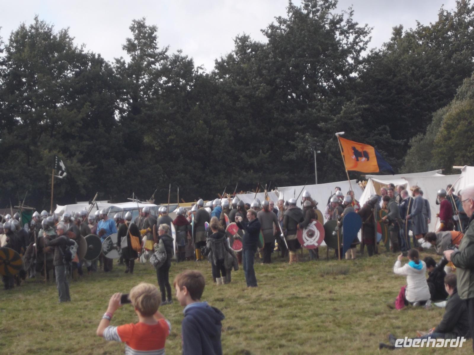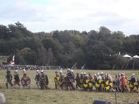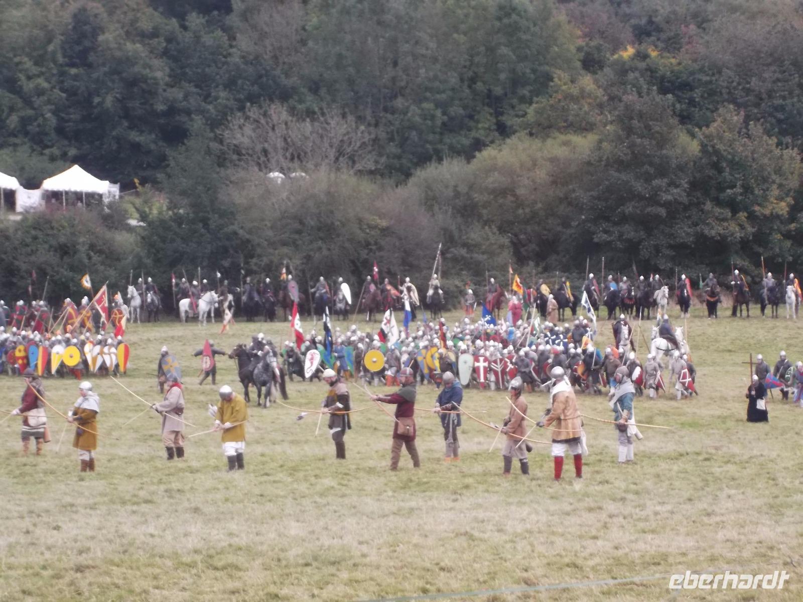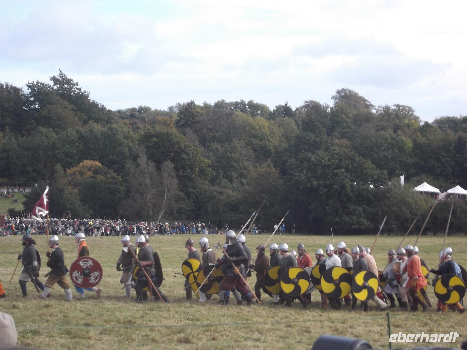Pünktlich um drei Uhr nachmittags ging es dann los: während ein Kommentator über Mikrofon die Hintergründe erläuterte und die mitwirkenden „Truppen" vorstellte, formierten sich die Schlachtreihen und dann begannen mehrere hundert als Angelsachsen und Normannen Ausstaffierte, die historischen Vorgänge der Schlacht bei Hastings nachzustellen