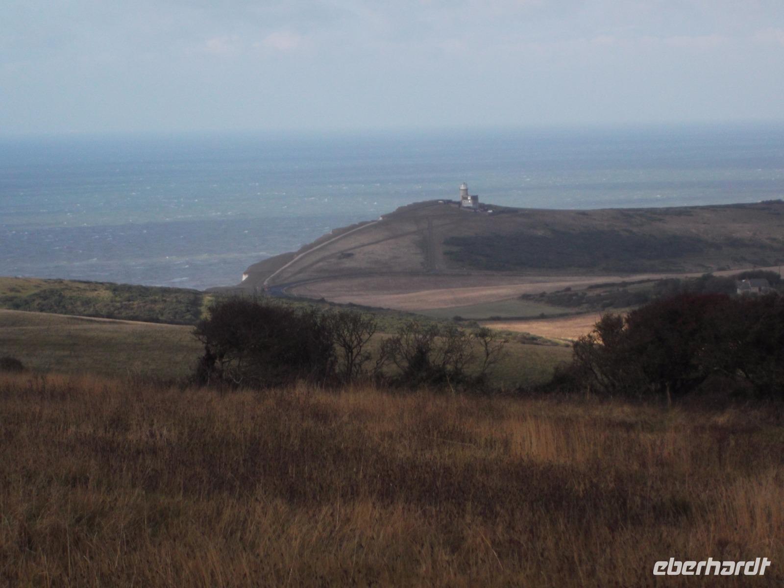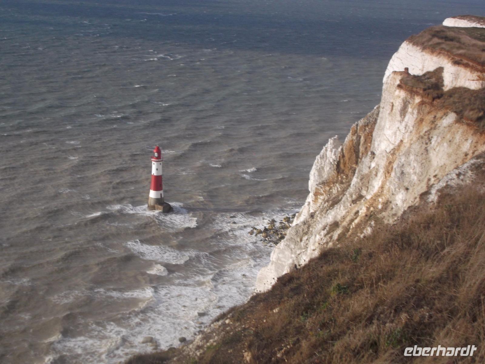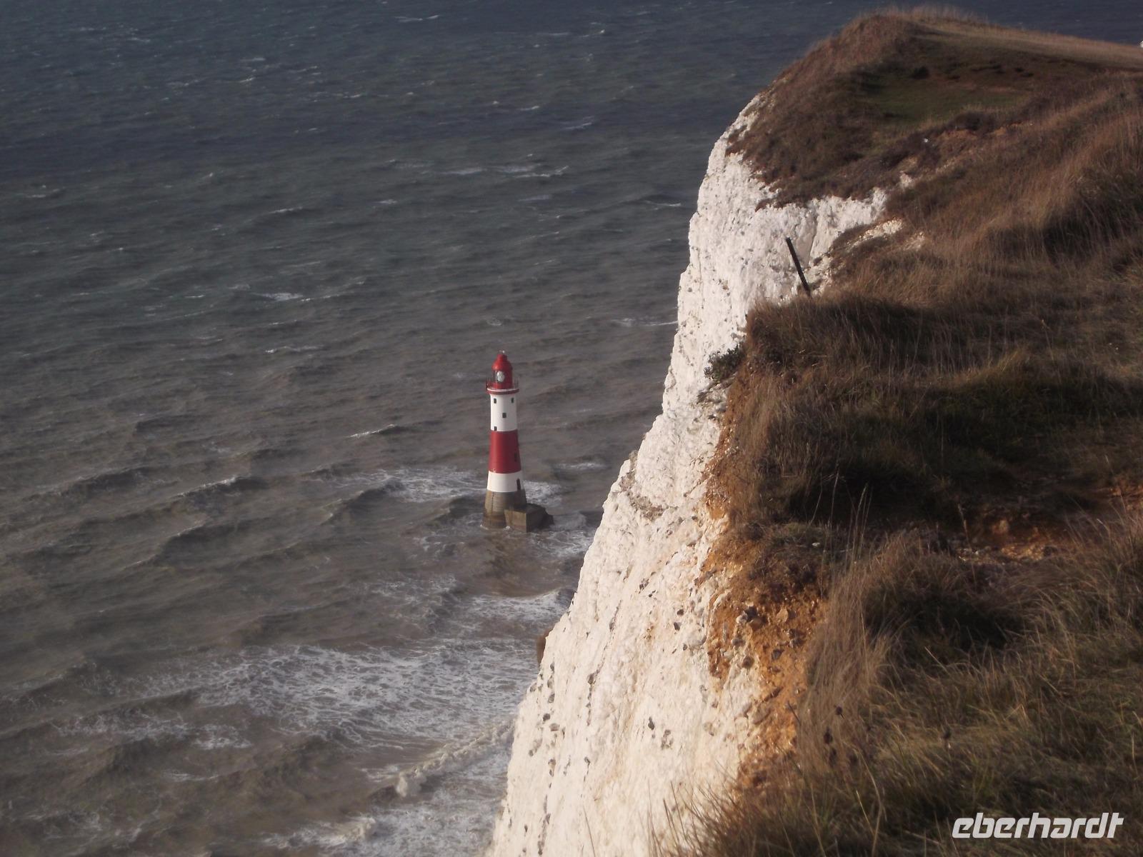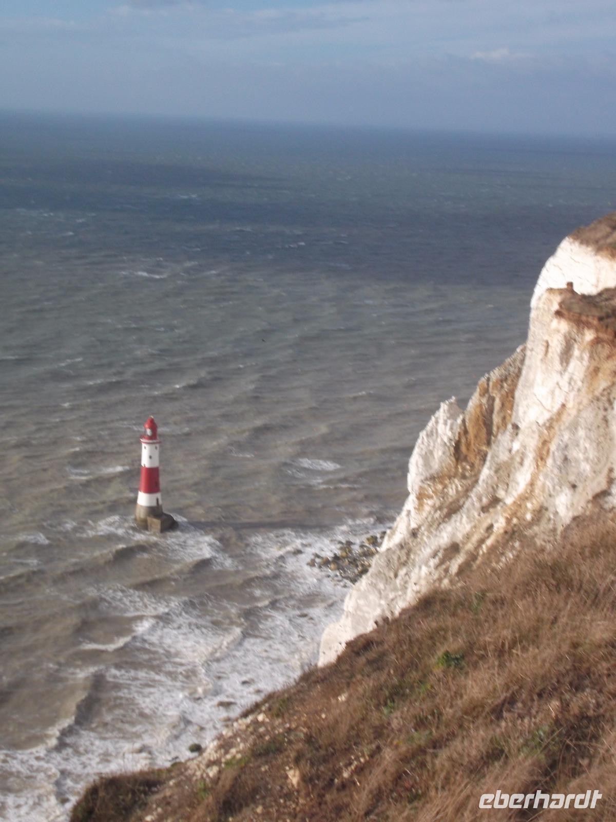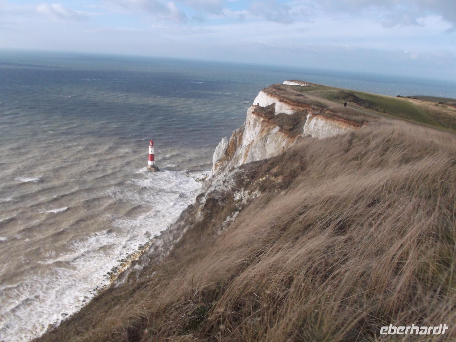 Nach dem Frühstück machten wir - obwohl wir dem regnerisch scheinenden Wetter nicht trauten - einen „Richtig-Reisen-Extra" Abstecher an die Cliff-Küste. Der wohl schönste Punkt der hiesigen Kreideküste ist „Beachy Head", die mit 162 m über dem Meeresspiegel höchste Kreideklippe in Großbritannien. Das macht sie zu einer Landmarke für Schiffe auf dem Ärmelkanal. Hier wurde auch im 19. Jh. ein erster Leuchtturm, erbaut, wegen besserer Sichtbarkeit aber 1902 errichtete man sogar einen 43 m hohen Turm auf einer Plattform mitten im Wasser direkt vor den Klippen, der heute einen äußerst malerischen Anblick bietet.