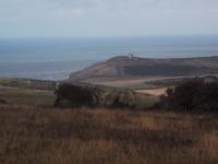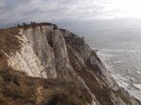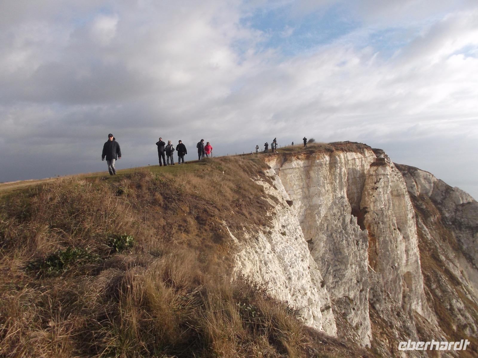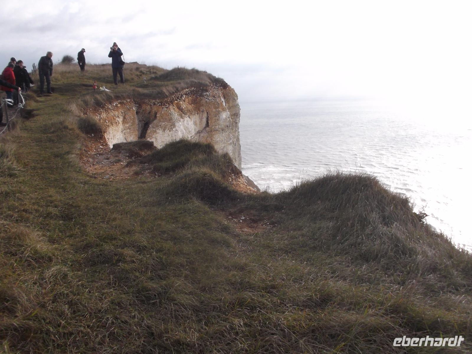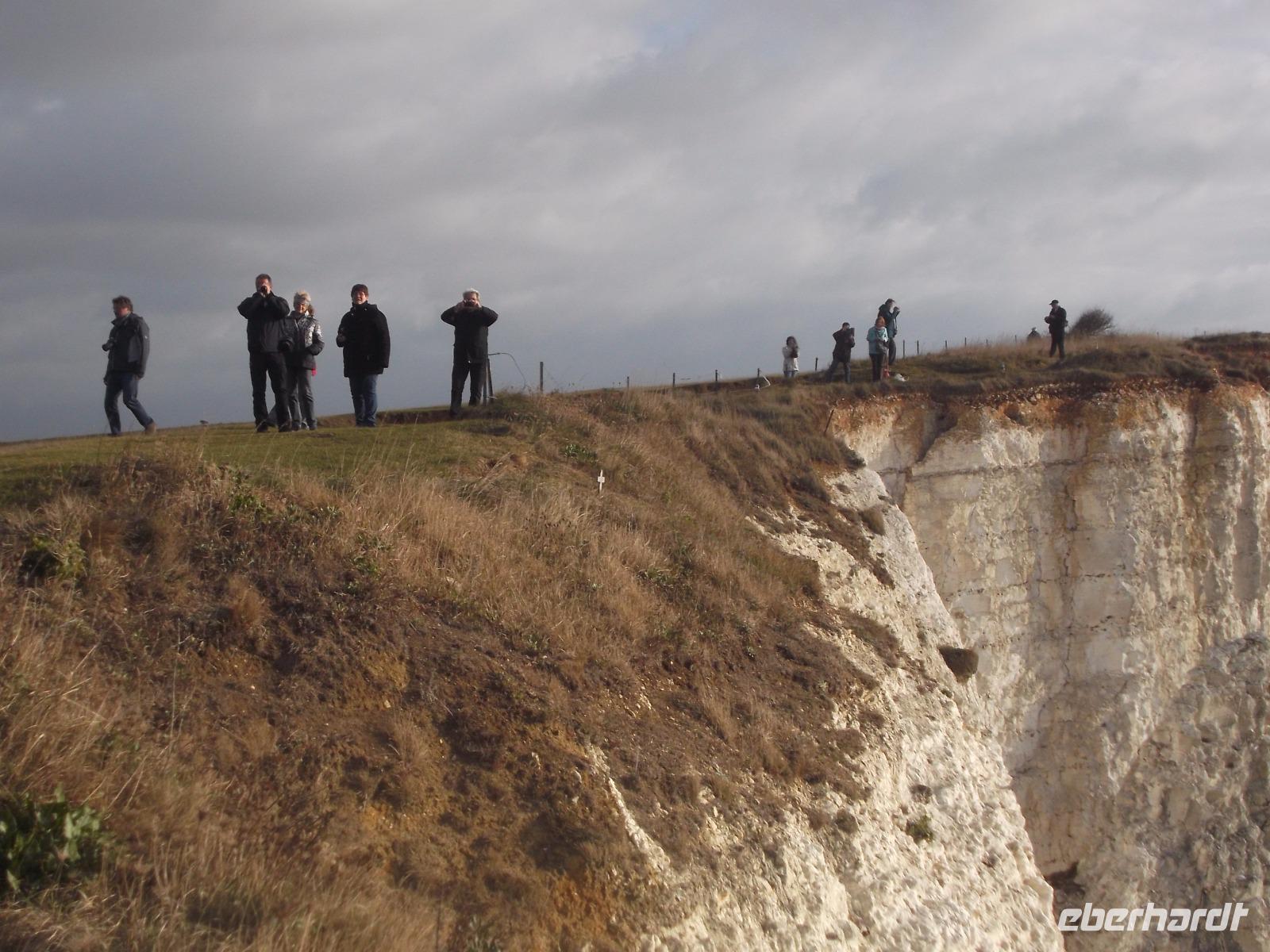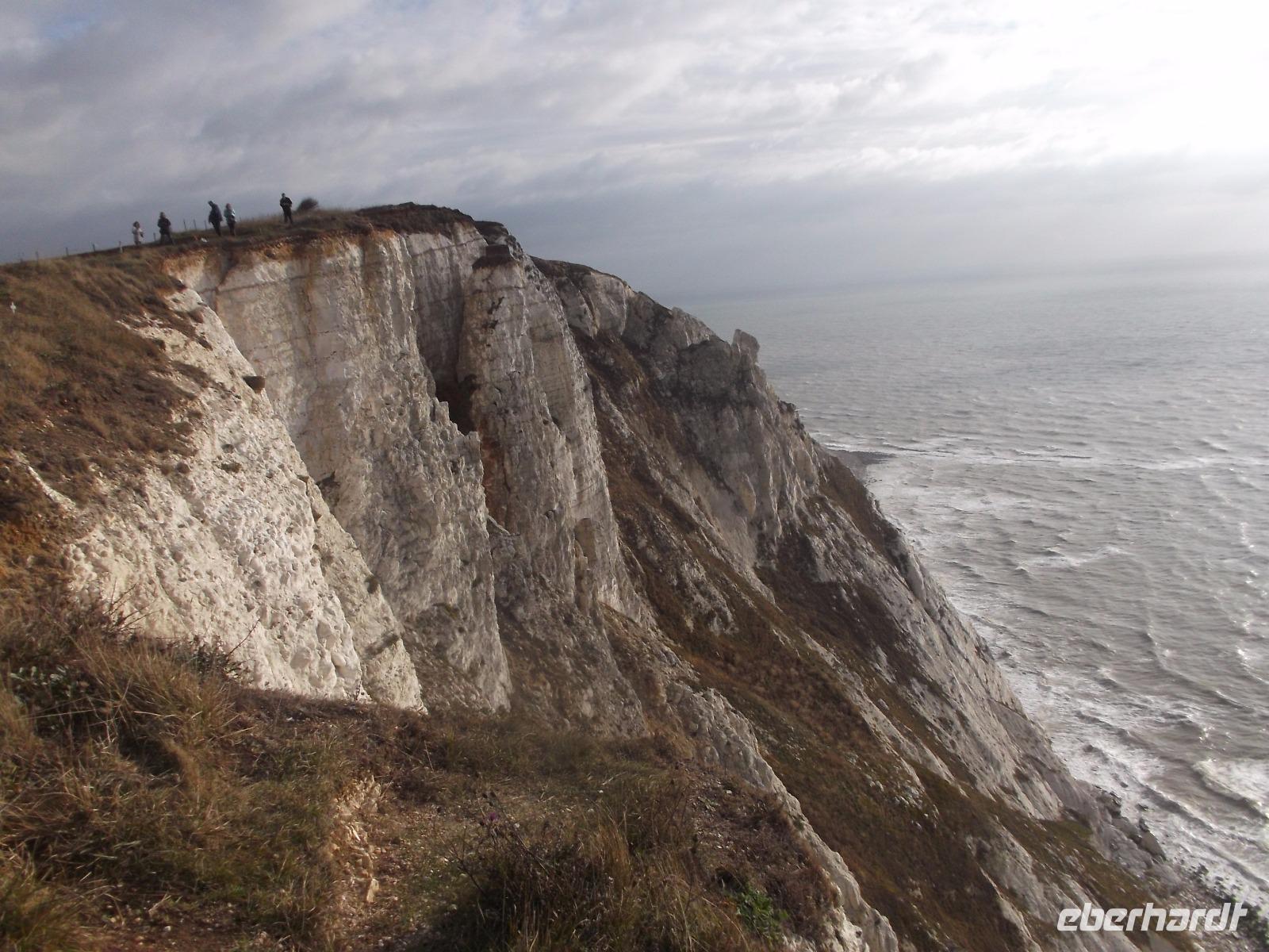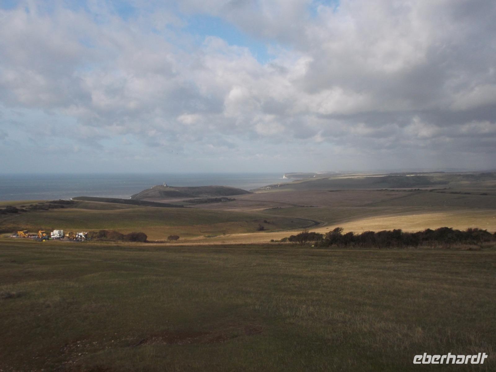 Nach dem Frühstück machten wir - obwohl wir dem regnerisch scheinenden Wetter nicht trauten - einen „Richtig-Reisen-Extra" Abstecher an die Cliff-Küste. Der wohl schönste Punkt der hiesigen Kreideküste ist „Beachy Head", die mit 162 m über dem Meeresspiegel höchste Kreideklippe in Großbritannien. Das macht sie zu einer Landmarke für Schiffe auf dem Ärmelkanal. Hier wurde auch im 19. Jh. ein erster Leuchtturm, erbaut, wegen besserer Sichtbarkeit aber 1902 errichtete man sogar einen 43 m hohen Turm auf einer Plattform mitten im Wasser direkt vor den Klippen, der heute einen äußerst malerischen Anblick bietet.