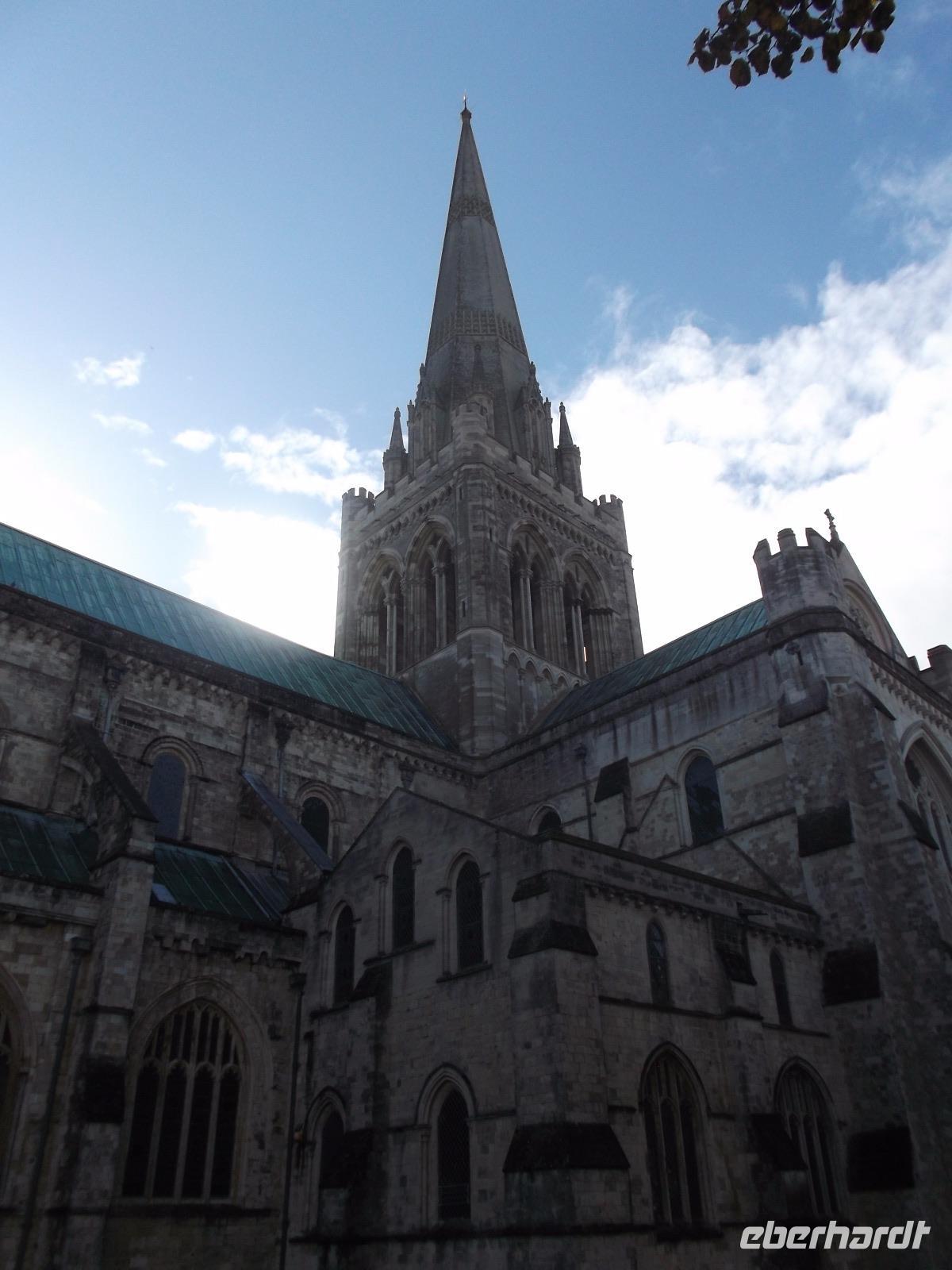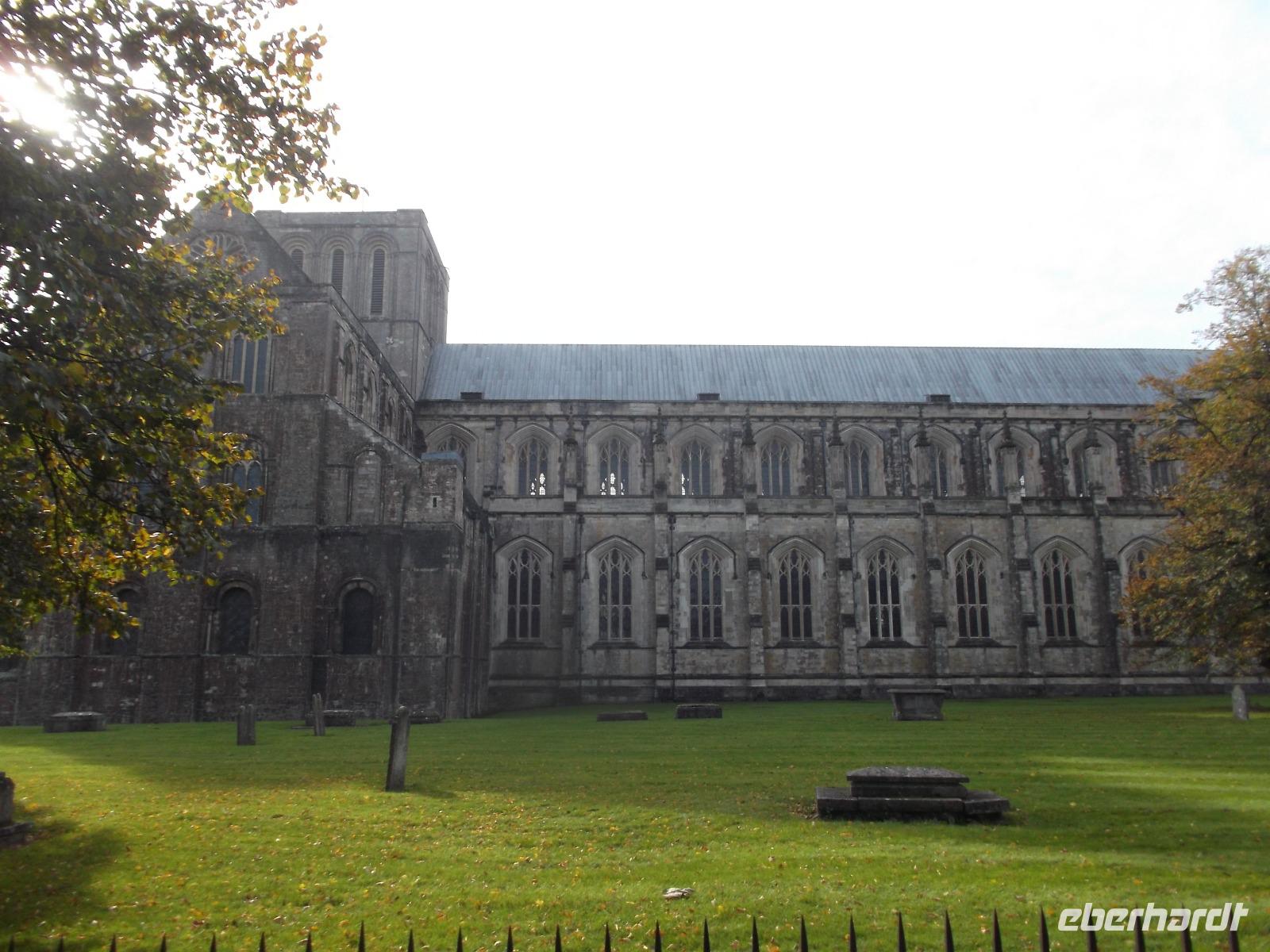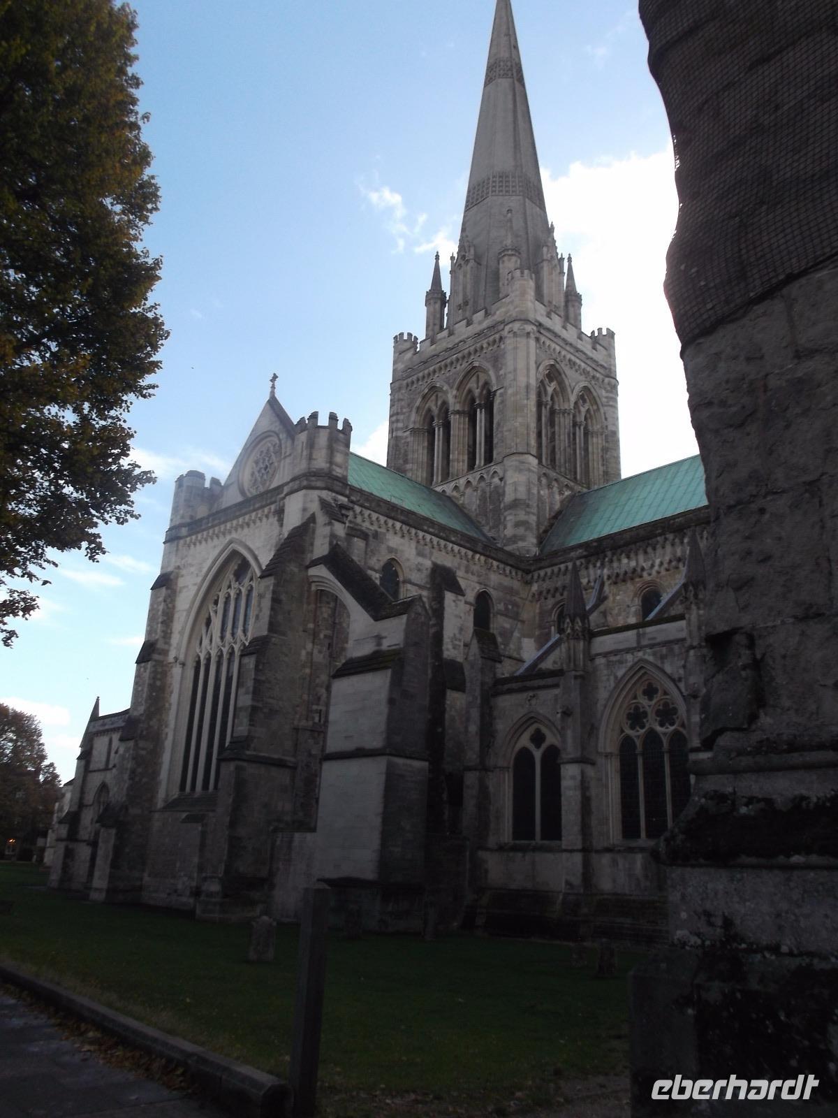 Von der Römervilla aus fuhren wir in die Kathedralen-Stadt Chichester. Noch vor dem kleinen Rundgang gingen wir zu einem kurzen Besuch in einen der originellsten Pubs - der typischen britischen Kneipen - von ganz Südengland, der in einer ehemaligen Kirche untergebracht ist. In ungewöhnlicher Atmosphäre nahmen wir gemeinsam einen Drink, bevor wir aufbrachen zum keinen Rundgang. Mitten in der Stadt steht das historische Marktkreuz, im 15. Jh. errichtet. Leider war das Chichester Cross, das als eines der schönsten seiner Art in ganz England gilt, wegen Bauarbeiten stark eingerüstet. Immer noch steht es am Kreuzungspunkt der Hauptstraßen der Stadt. Nicht weit war es zur Kathedrale von Chichester, die schon seit dem 11.Jahrhundert Bischofssitz war. Errichtet auf den Fundamenten einer römischen Basilika wirkt die Kathedrale mit ihrem gewaltigen Vierungsturm sehr wuchtig. Zudem hat sie einen für Großbritannien ungewöhnlichen einzelstehenden Glockenturm. Der Schutzpatron der Kathedrale und der Stadt ist einer ihrer Bischöfe, Richard von Chichester, der schon im 13. Jh. von der katholischen Kirche Heilig gesprochen wurde. Sein Standbild steht vor der Kirche steht und sein Grab in der Kathedrale war bis zu seiner Zerstörung in der Reformation ein Wallfahrtsort. In der Kathedrale finden sich mehrere moderne Kunstwerke, deren bekanntestes das in der nördlichen Chorapsis gelegene „Lobet den Herrn"-Fenster von Marc Chagall von 1976 mit überwiegenden Rottönen ist.