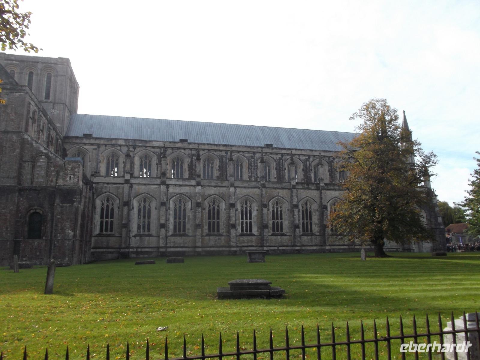 Unser heutiges Tagesprogramm führte uns zunächst nach Winchester, der alten Hauptstadt Englands. Spätestens der angelsächsische König Alfred der Große hatte die Stadt stark befestigt und zum Hauptort seines Königsreichs Wessex gemacht. Als die Dänen, die im „Danelag" lange Zeit über große Teile Englands geherrscht hatten, vertrieben waren, wurde Winchester zur Hauptstadt des gesamten Reiches und blieb es auch unter König Edward dem Bekenner, dem Vorgänger Harolds II., der in der Schlacht von Hastings den Normannen unterlegen war. König Alfred der Große begrüßte uns auch in Winchester, denn in der Nähe seiner den Eingang zur Altstadt und den Platz vor dem Rathaus beherrschenden Statue stiegen wir aus dem Bus. Es folgte ein Spaziergang durch die hübsche Altstadt vom Rathaus durch die Fußgängerzone bis zum Westgate, in dessen Nähe sich die Reste der einst gewaltigen Burg von Winchester finden. Hier ist die „Great Hall" interessant, die seit dem 13. Jh. fast unverändert erhaltene große Halle des Palastes. Hier findet sich die neben der Kathedrale wohl bekannteste Sehenswürdigkeit Winchesters, der „Runde Tisch des Königs Artus". In Aufnahme der Artuslegenden, die im späten Mittelalter weit verbreitet waren, fertigte man den Tisch wohl im 12. Jh. an, in der Zeit Heinrichs VIII. wurde er dann mit Bildern versehen. Wir sahen andächtig zu dem hoch an der Wand der „Great Hall" aufgehängten Tisch hinauf (der ein wenig wie eine überdimensionale Dart-Scheibe wirkt) und ließen einige der Legenden Revue passieren. Nach dem Besuch hier gingen wir durch historisches Gelände bis zur Kathedrale, die wir allerdings nur von außen sehen konnten, da sie wegen der gerade laufenden Graduierungsfeiern der Universität geschlossen war. Ein wenig von dem bunten Treiben um die Verleihung der „Doktorhüte" bekamen wir mit und hatten in der Freizeit Gelegenheit, in der historischen Stadt bzw. im Kathedralenbezirk zu bummeln und die Ausmaße des Kirchenbaues zu bestaunen, denn ihr Langhaus ist das zweitlängste in Europa.