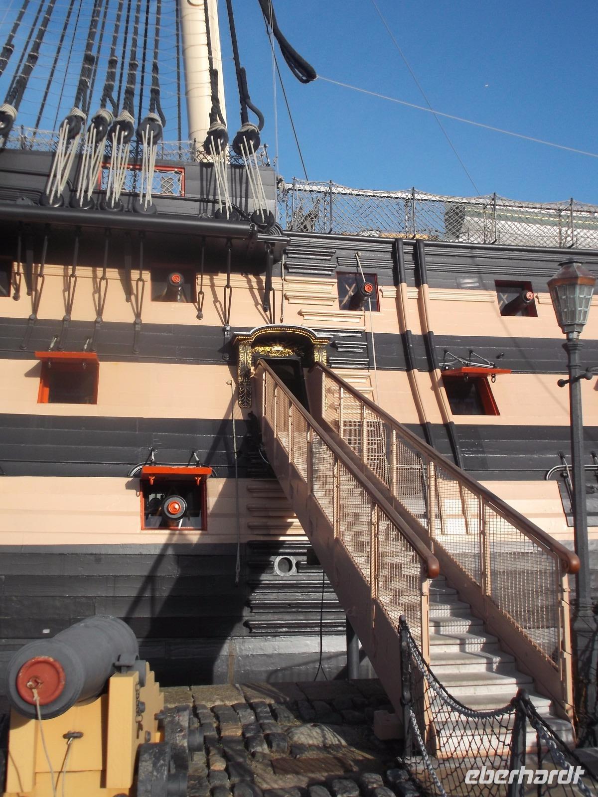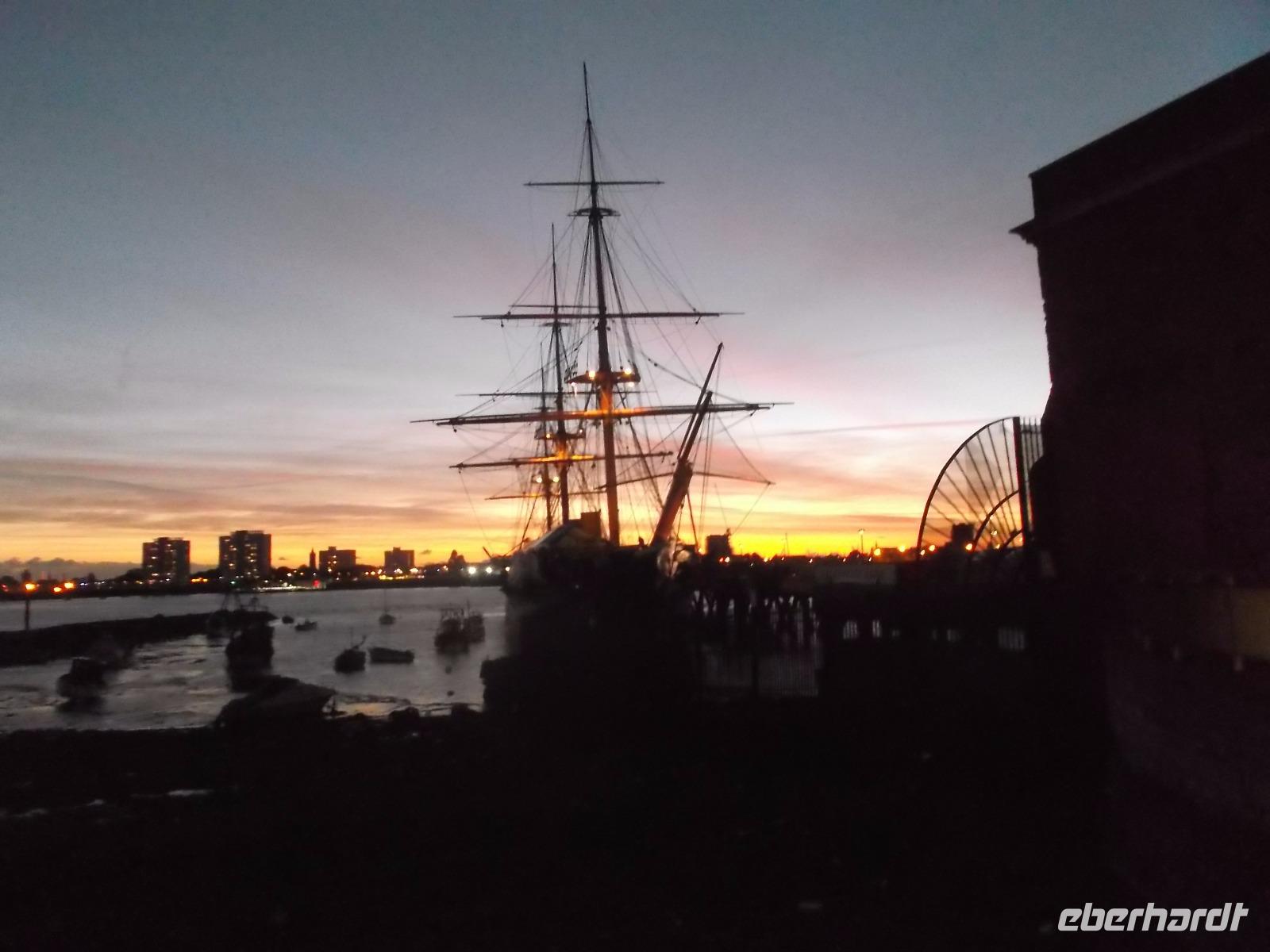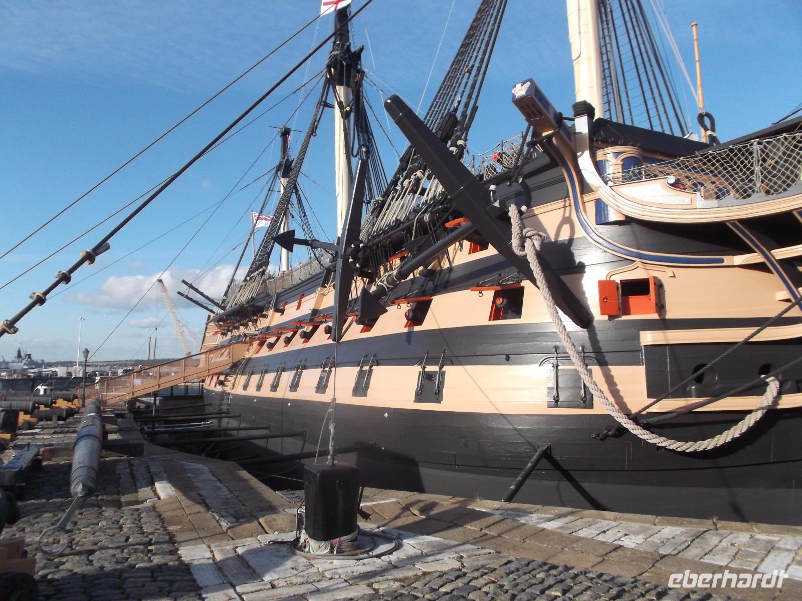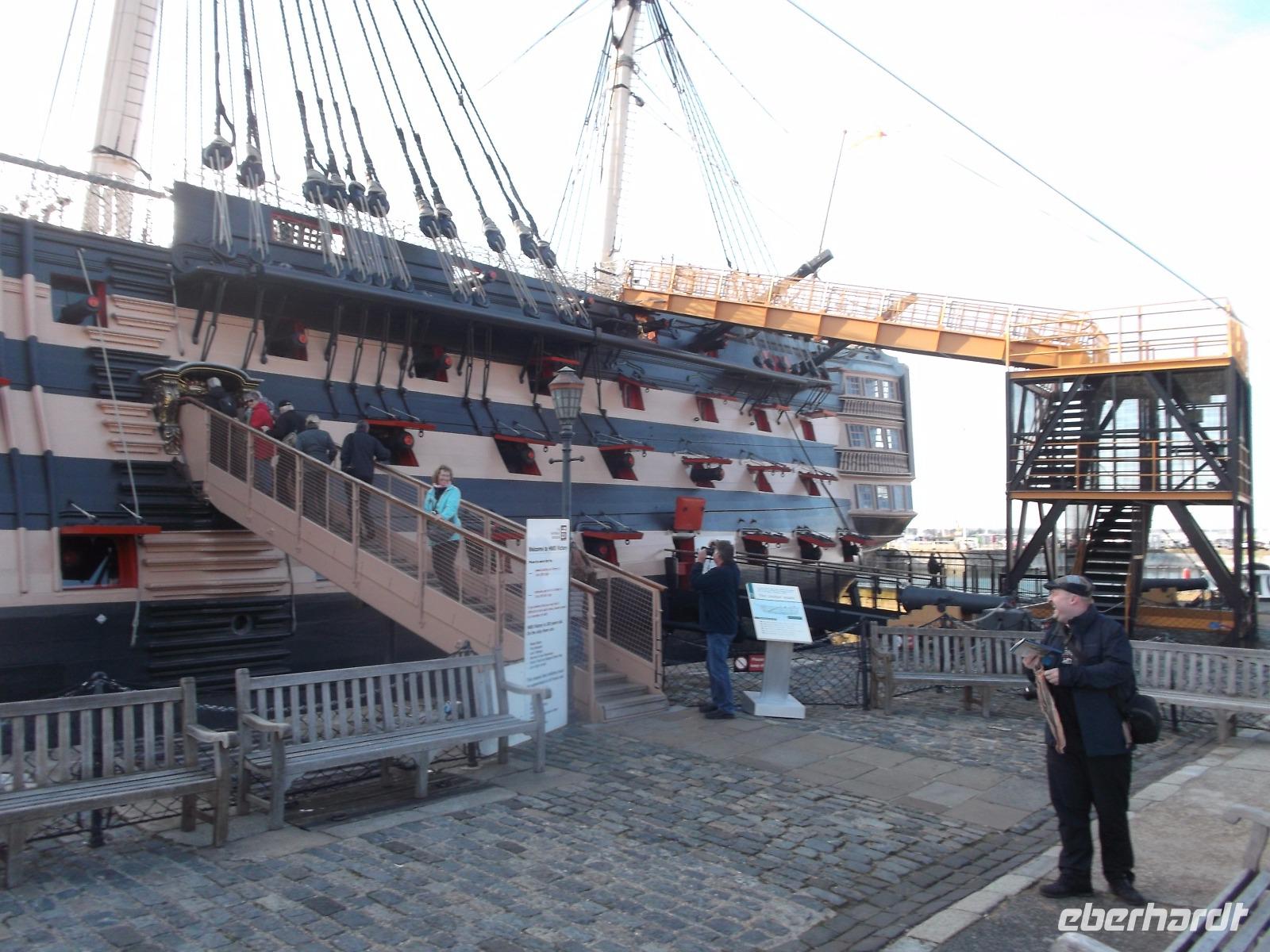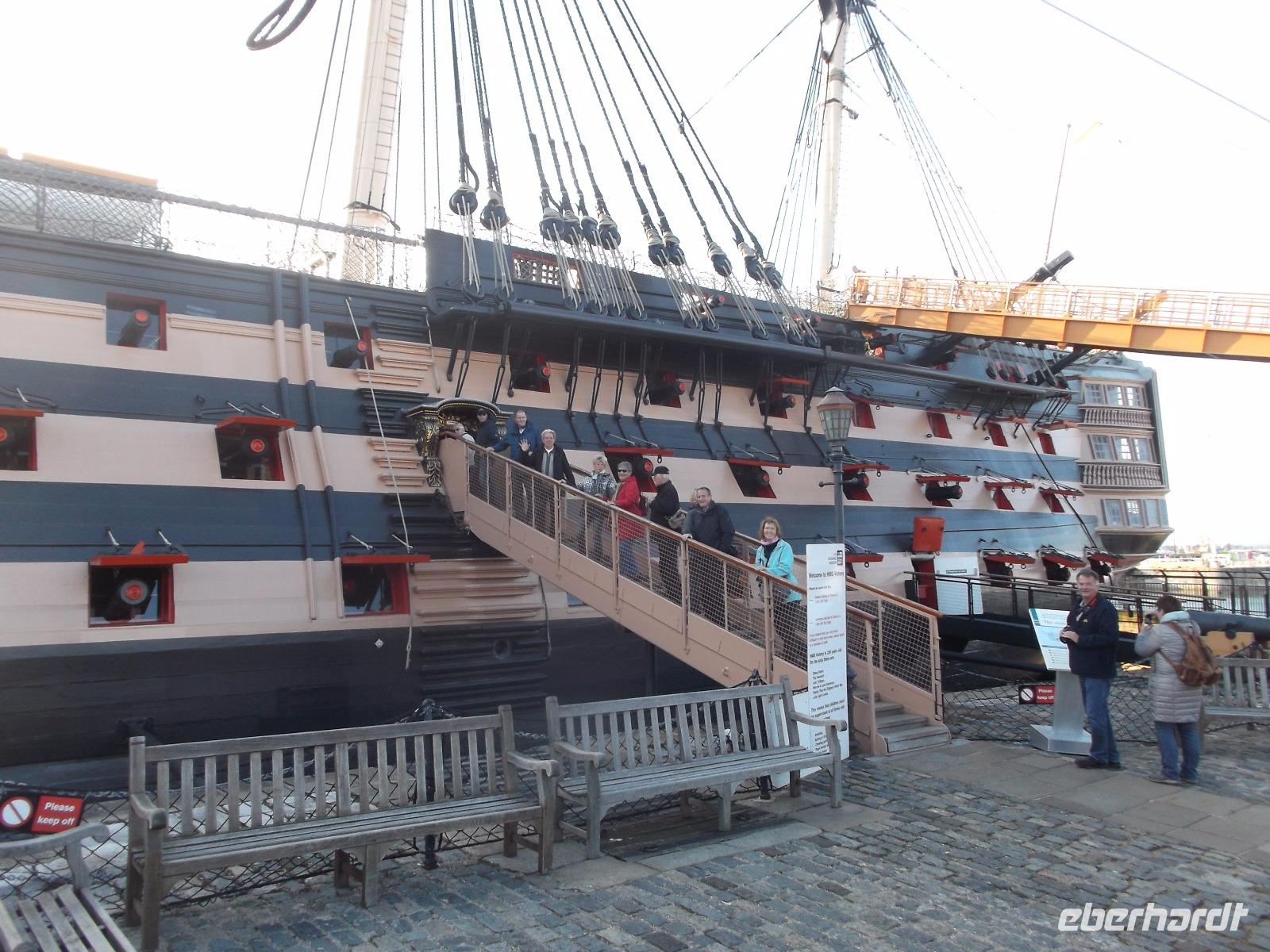 Ein Teil des historischen Militärhafens wird museal genutzt und ist daher öffentlich zugänglich. Mehrere historische Kriegsschiffe sind hier ausgestellt, z. B. die HMS „Warrier", das erste kombinierte Segel-Dampf-Schiff. Dennoch ist ein anderes Kriegsschiff hier die Hauptattraktion: HMS „Victory", das Flaggschiff der britischen Flotte beim Seesieg der Engländer gegen Napoleon in der Schlacht von Trafalgar 1805. Schon 1765 in Dienst gestellte wurde das Linienschiff - so genannt wegen der in mehreren Etagen angeordneten „Kanonenlinien" für den Kampf gegen Napoleons Flotte aufgerüstet. Es verfügte dann über 104 Kanonen und hatte 850 Mann Besatzung. Es wurde nie aus dem Marinedienst entlassen - und ist damit wohl das älteste aktive Kriegsschiff der Welt. Im hier untergebrachten Museum kann man eindrucksvoll die Lebensbedingungen englischer Seesoldaten des 19. Jahrhunderts kennenlernen und gewinn tolle Einblicke in den Bau von Schiffen und Geschichte der Seekriege. Nach dem „Victory"-Erlebnis hatten wir noch etwas Zeit, bevor wir uns an einem der historischen Pubs neben den Hafenanlagen trafen. Hier nahmen wir ein typisch englisches Abendessen ein, bevor wir dann zum Fährhafen aufbrachen, denn nach dem Check in auf die Fähre über den Ärmelkanal verbrachten wir die Nacht in Schiffskabinen.
