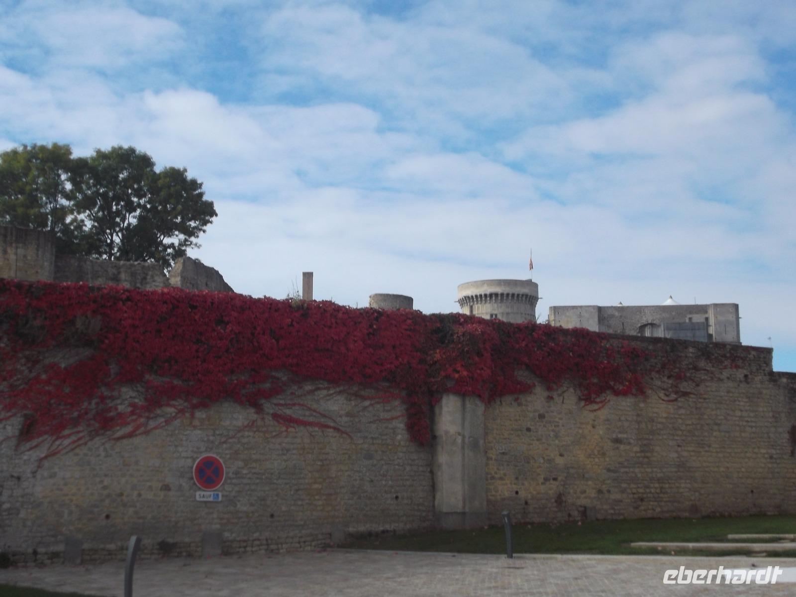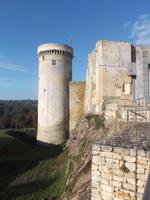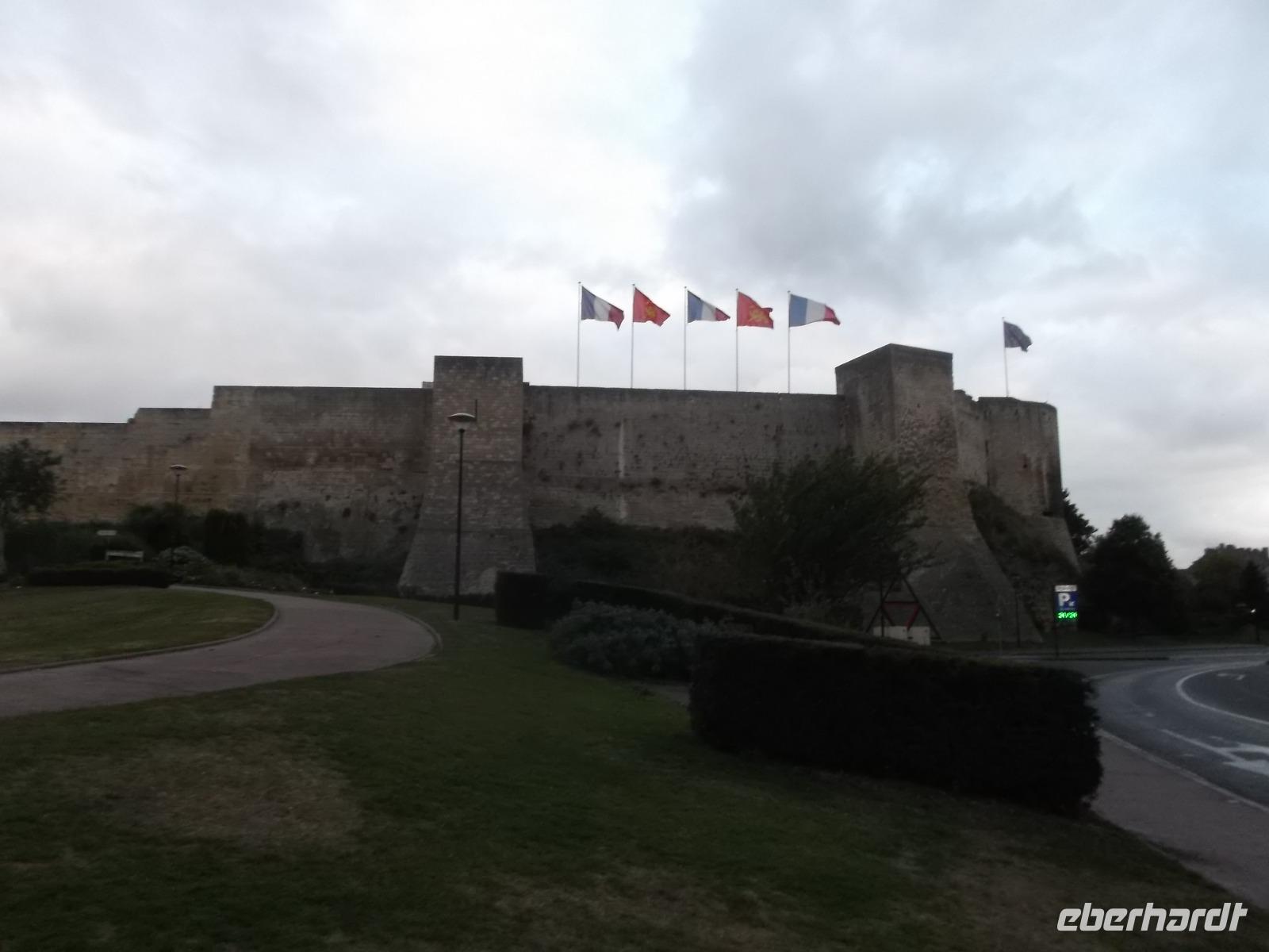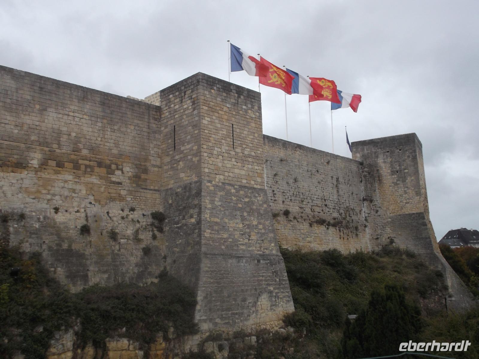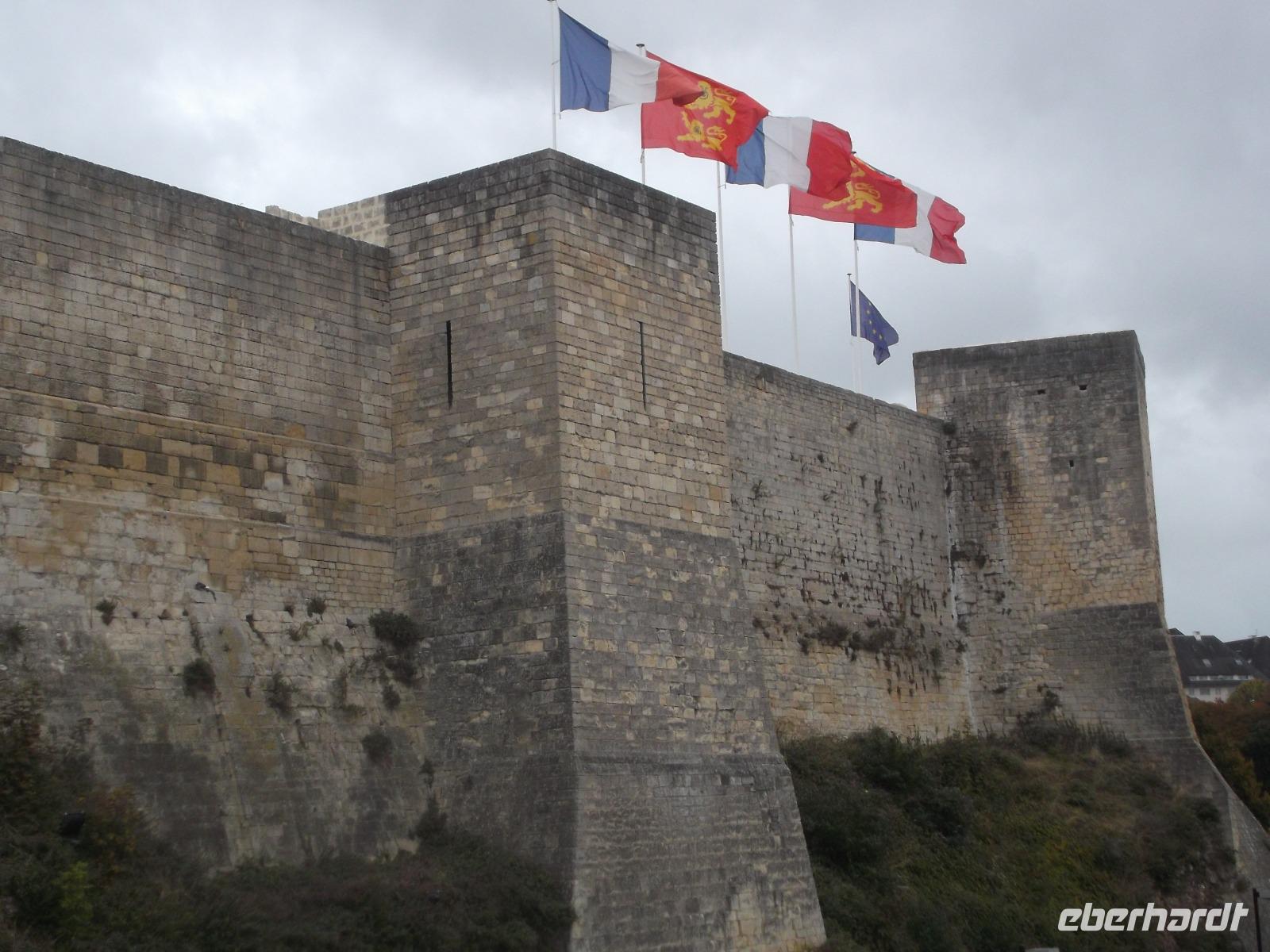 Unser erstes Ziel für heute war die Kleinstadt Falaise. Ihre Burg, die imposant das Städtchen überragt, war bis 1066 Sitz der Herzöge der Normandie und auch der Geburtsort Wilhelm des Eroberers. Von hier aus regierte er die Normandie und fasste wohl auch den Plan, sich seinen Thronanspruch auf England zu sichern. Die Burg Falaise, die wir am Vormittag erreichten und besichtigten, wurde schon im 10. Jh. als Höhenburg errichtet und in drei Phasen ausgebaut. So entstanden ein großer und später ein kleiner viereckiger Bergfried und in einer späteren Phase noch ein runder. Das moderne, in der mit vielen Verteidigungsanlagen und seinen drei Bergfrieden interessant restaurierten Burg eingerichtete Museum, zeigt eindrucksvoll die Residenz der Normannenherzöge und gibt Aufschluss über die Zeit und die Lebensweise jener Phase des Mittelalters in Nordfrankreich.
