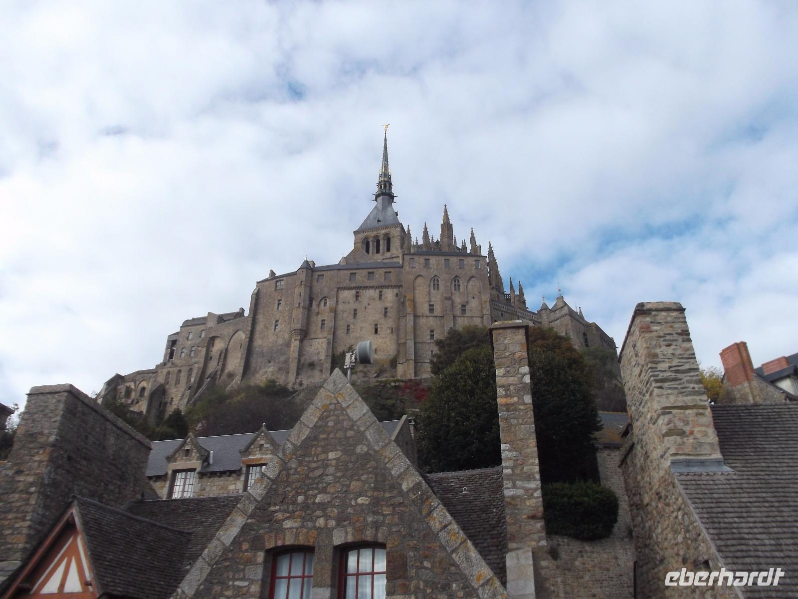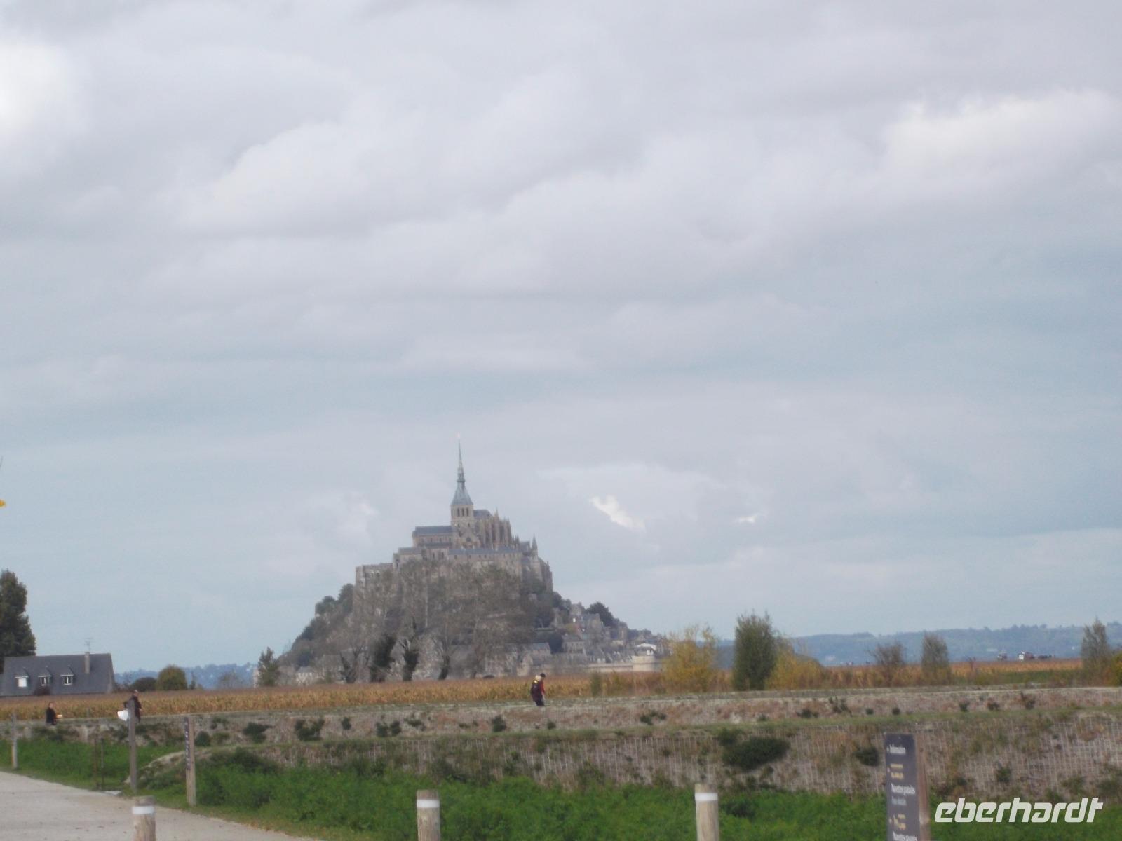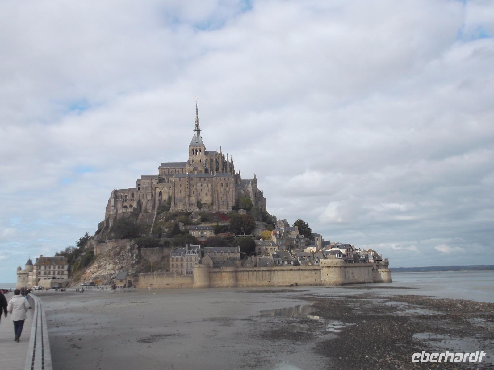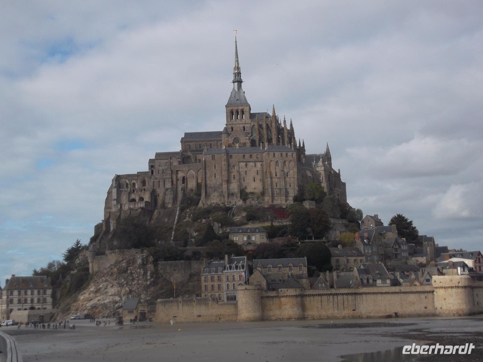 Der Nachmittag sah uns auf dem Weg zur normannisch-bretonischen Grenze, bis wir den Mont St. Michel erreichten.Im Mittelalter wurde der Berg „Wunder des Abendlandes" genannt - und bereits bei seinem majestätischen Anblick versteht man diesen Beinamen. Gelegen auf einer Gezeiteninsel inmitten der Bucht von Mont St.Michael ist aus dem einst flachen Felsen in jahrhundertelanger emsiger Bautätigkeit ein gewaltiges, prächtiges Bauwerk - eine Mischung aus Wehrbau, Kloster und Kirche entstanden. Der Wallfahrtsort begann seine Geschichte im 8. Jh. als der Bischof von Avranches eine Kapelle zu Ehren des Erzengels Michael errichten ließ. In einem der aufwendigsten und wohl auch kostspieligsten Bauprojekte des Mittelalters entstanden im Laufe der Zeit nicht nur Verteidigungsanlagen fast auf Meereshöhe, die sich bis in Dutzende Meter Höhe auf dem Felsen hinziehen, sondern auch massive turmhohe Stützmauern, die die Aufbauten eines Klosters und einer großartigen gotischen Kirchenlage tragen. Über 150 m über die Bucht erhebt sich nun, die Klosterspitze krönend, die Figur des Erzengels Michael. Romanische, gotische und renaissance-Gebäudeteile formen nun eines der bedeutendsten Gebäude-Ensembles der europäischen Vergangenheit. Bereits seit 1979 gehört der Mont St. Michel zum UNESCO-Weltkulturerbe und wohl kaum jemand kann sich dem Eindruck entziehen, der von dieser mystisch wirkenden Anlage ausgeht. Hinzu kommt ihre Lage in der Bucht, verbunden mit dem Auf-und-ab der Gezeiten - umgeben von Schlick oder umtost von Wellen, Stürmen und dem Geschrei der Lachmöwen.