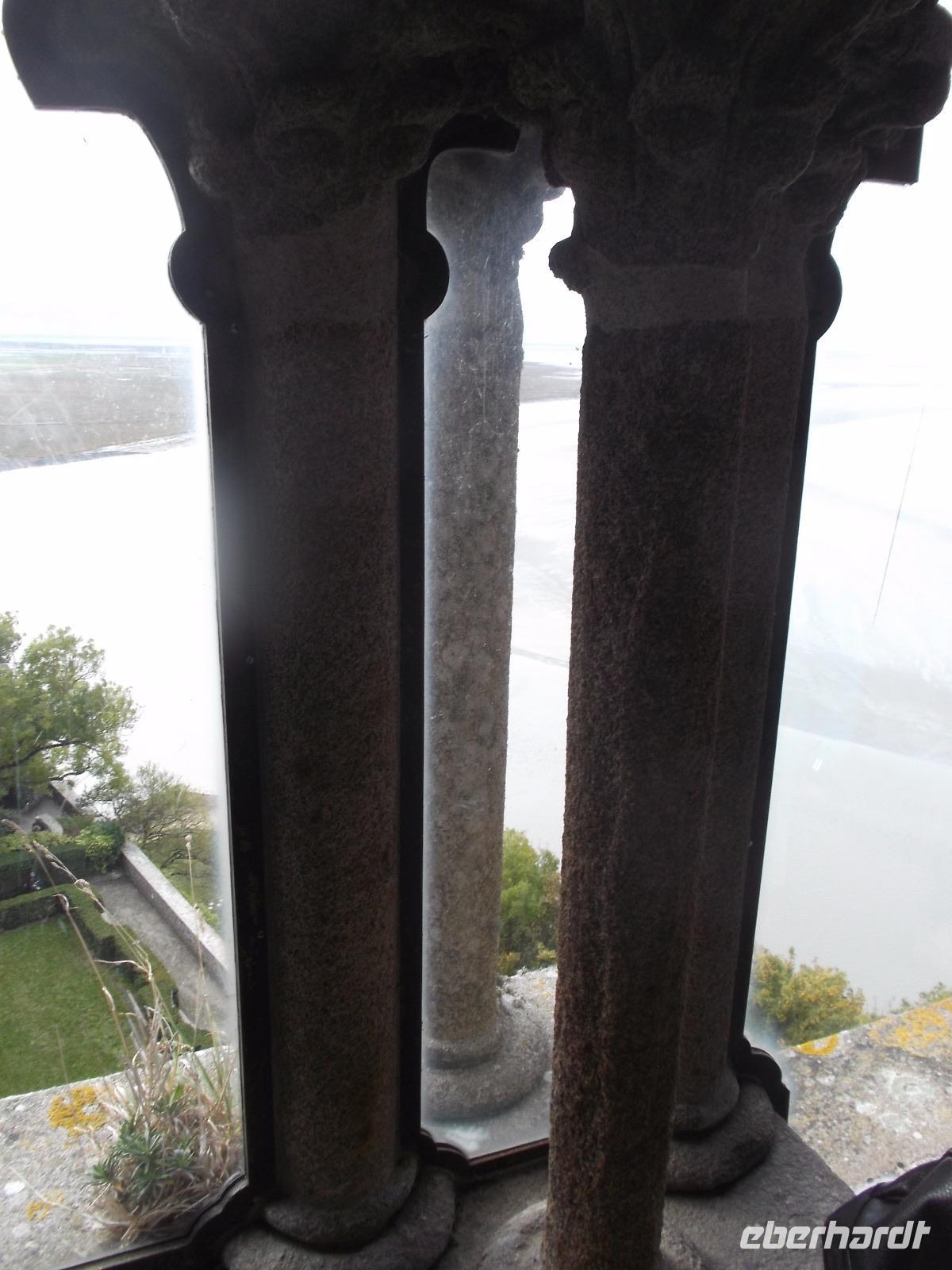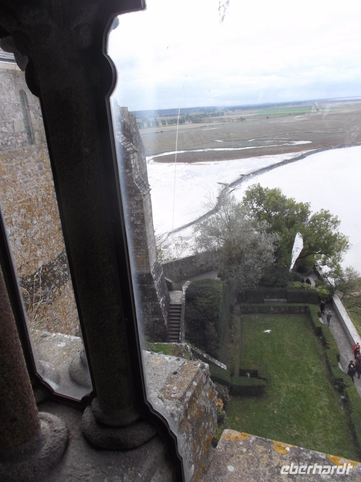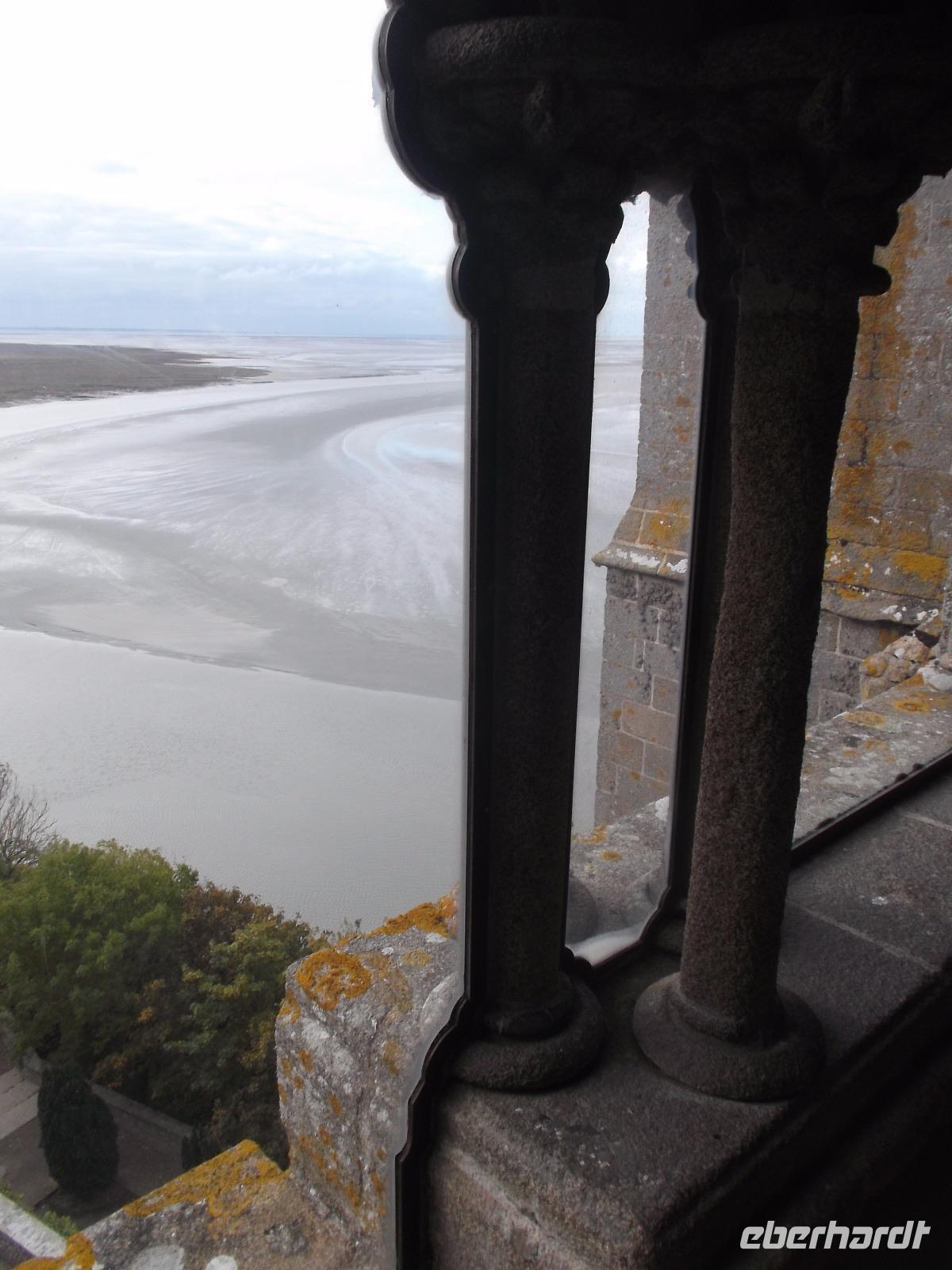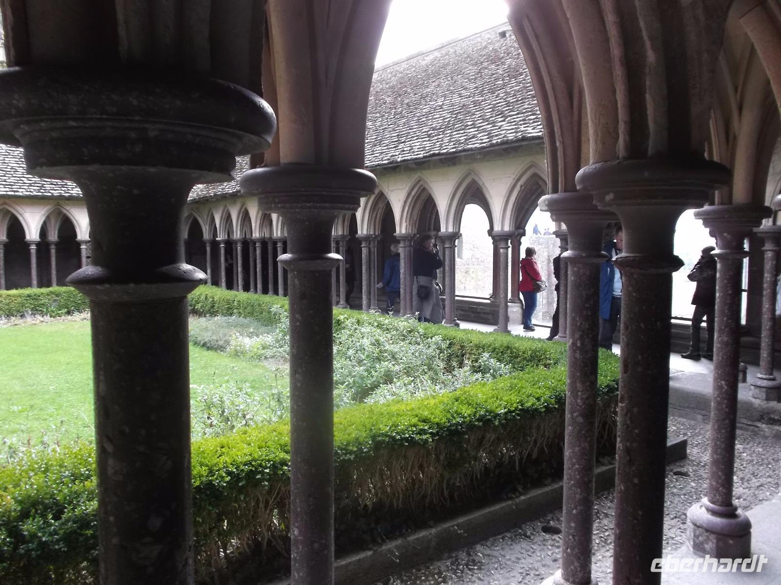 Auf dem Weg zum Kloster gingen wir nicht wie die anderen Besucher die Hauptstraße, sondern wir wählten den Weg über die Verteidigungsmauern, von wo aus man auch einen guten Blick über die Bucht von St. Michel, hat. Der Aufstieg ist interessant, aufgrund seiner vielen Stufen aber auch ermüdend. Endlich standen wir dann am Haupteingang, ich löste die Tickets und wir erreichten die eigentliche Klosteranlage. Gleich neben der Kirche liegt eines der „Wunder" vom Mont St.Michel. Genannt wird er der „schwebende Kreuzgang", denn er weist eine zur Bucht hin teilweise offene Seite auf, was ihm den Eindruck verleiht, direkt im Himmel zu enden. Von hier gelangt man in die verschiedenen Räumlichkeiten des einstigen Klosters, sieht z.B. in einem Saal die gewaltigen Säulen, die das Gewicht der darüberliegenden Kirche tragen. In mehreren gotischen Sälen haben nicht nur die Mönche gelebt, sondern auch zahlreiche gekrönte Häupter und wichtige Menschen aus ganz Europa als Pilger übernachtet. Die meisten Funktionsräume des ehemaligen Klosters und Einiges vom später hier eingerichteten Staatsgefängnis kann man besichtigen.