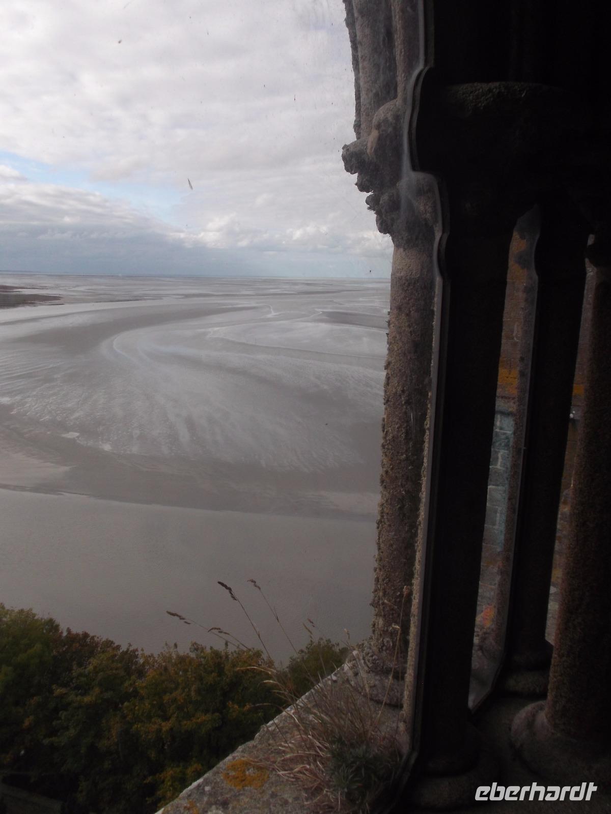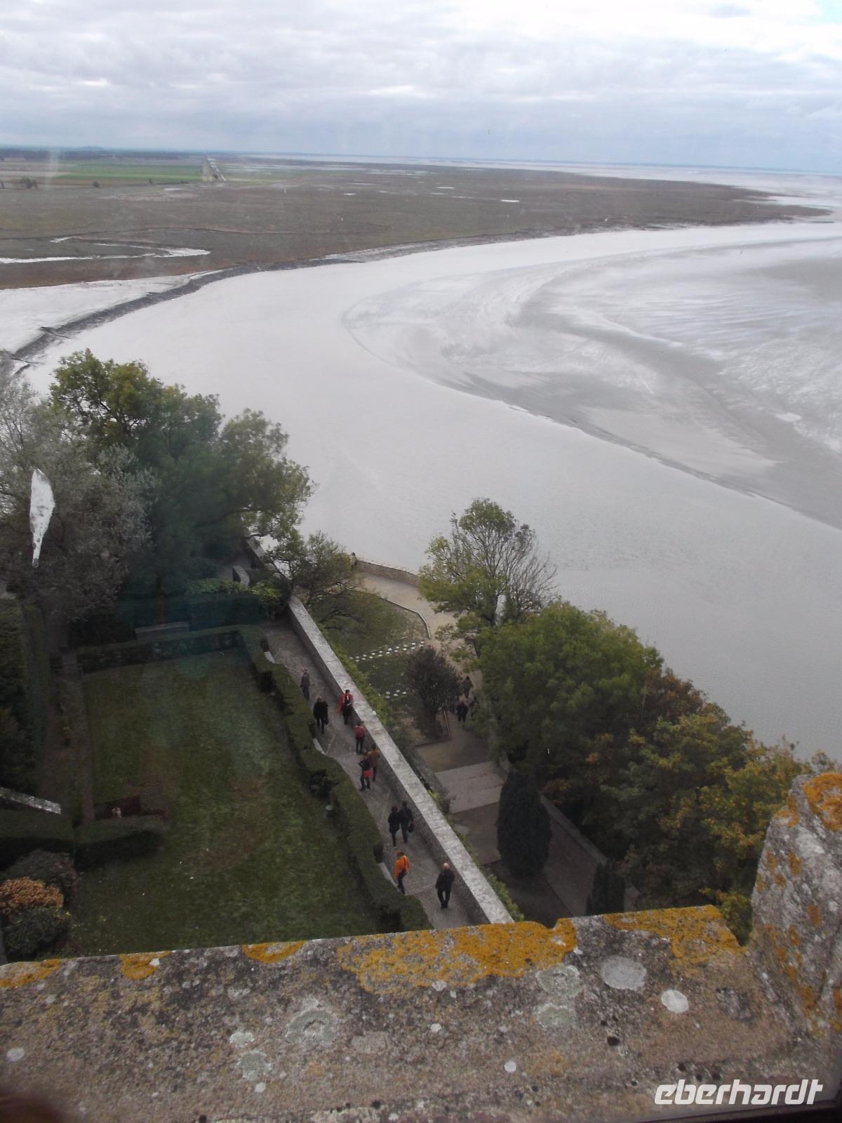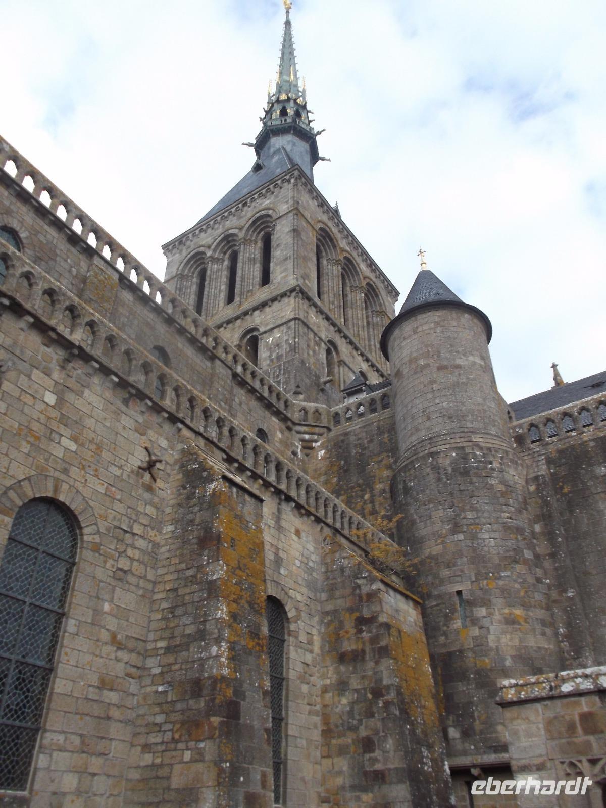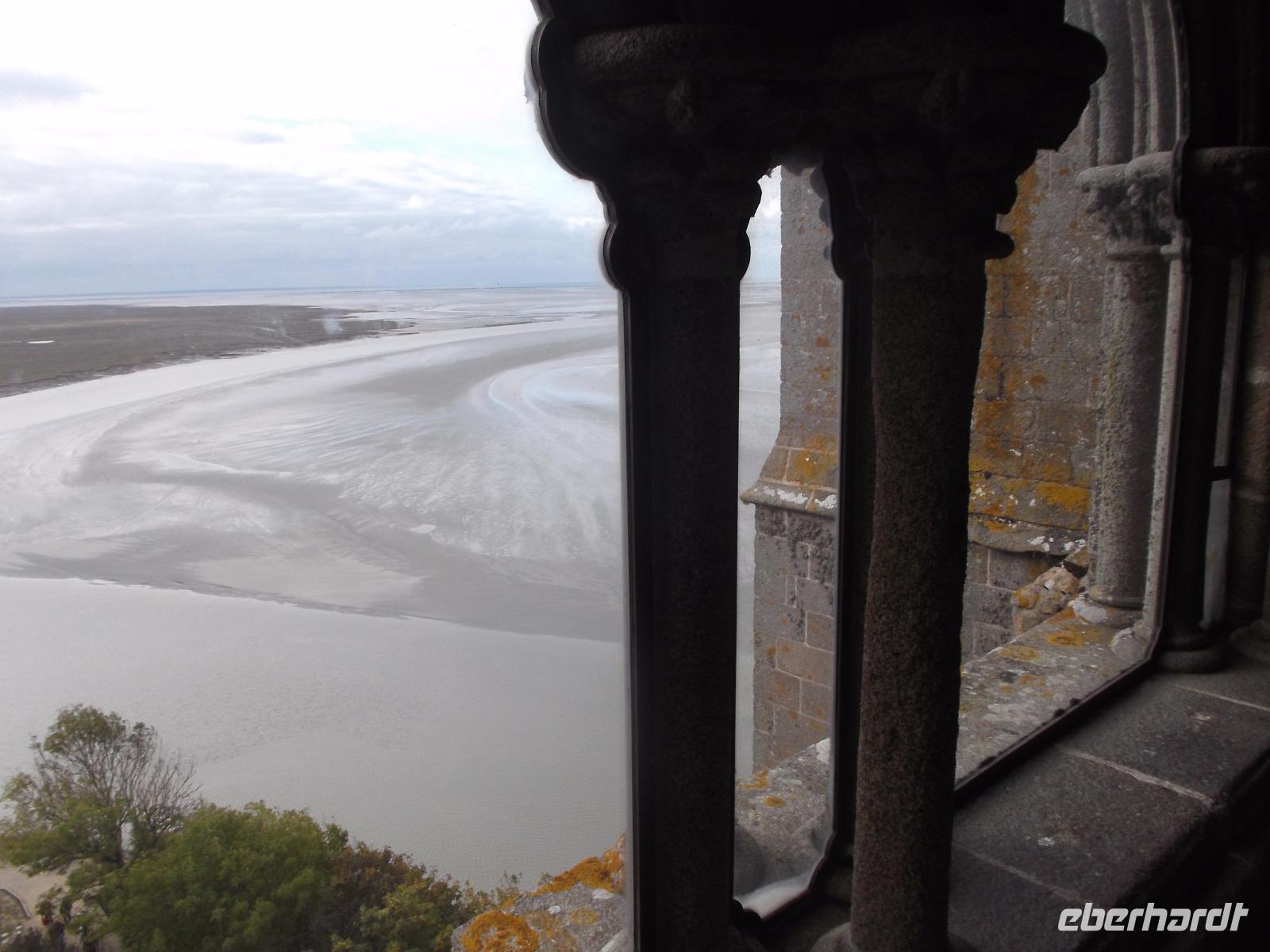 Auf dem Weg zum Kloster gingen wir nicht wie die anderen Besucher die Hauptstraße, sondern wir wählten den Weg über die Verteidigungsmauern, von wo aus man auch einen guten Blick über die Bucht von St. Michel, hat. Der Aufstieg ist interessant, aufgrund seiner vielen Stufen aber auch ermüdend. Endlich standen wir dann am Haupteingang, ich löste die Tickets und wir erreichten die eigentliche Klosteranlage. Gleich neben der Kirche liegt eines der „Wunder" vom Mont St.Michel. Genannt wird er der „schwebende Kreuzgang", denn er weist eine zur Bucht hin teilweise offene Seite auf, was ihm den Eindruck verleiht, direkt im Himmel zu enden. Von hier gelangt man in die verschiedenen Räumlichkeiten des einstigen Klosters, sieht z.B. in einem Saal die gewaltigen Säulen, die das Gewicht der darüberliegenden Kirche tragen. In mehreren gotischen Sälen haben nicht nur die Mönche gelebt, sondern auch zahlreiche gekrönte Häupter und wichtige Menschen aus ganz Europa als Pilger übernachtet. Die meisten Funktionsräume des ehemaligen Klosters und Einiges vom später hier eingerichteten Staatsgefängnis kann man besichtigen.