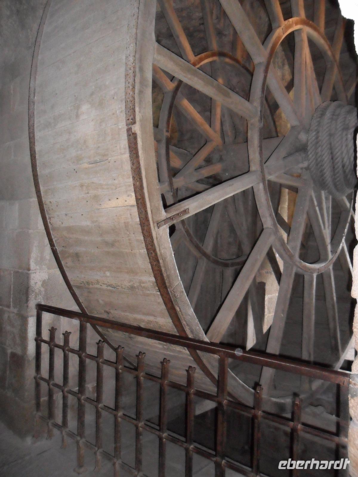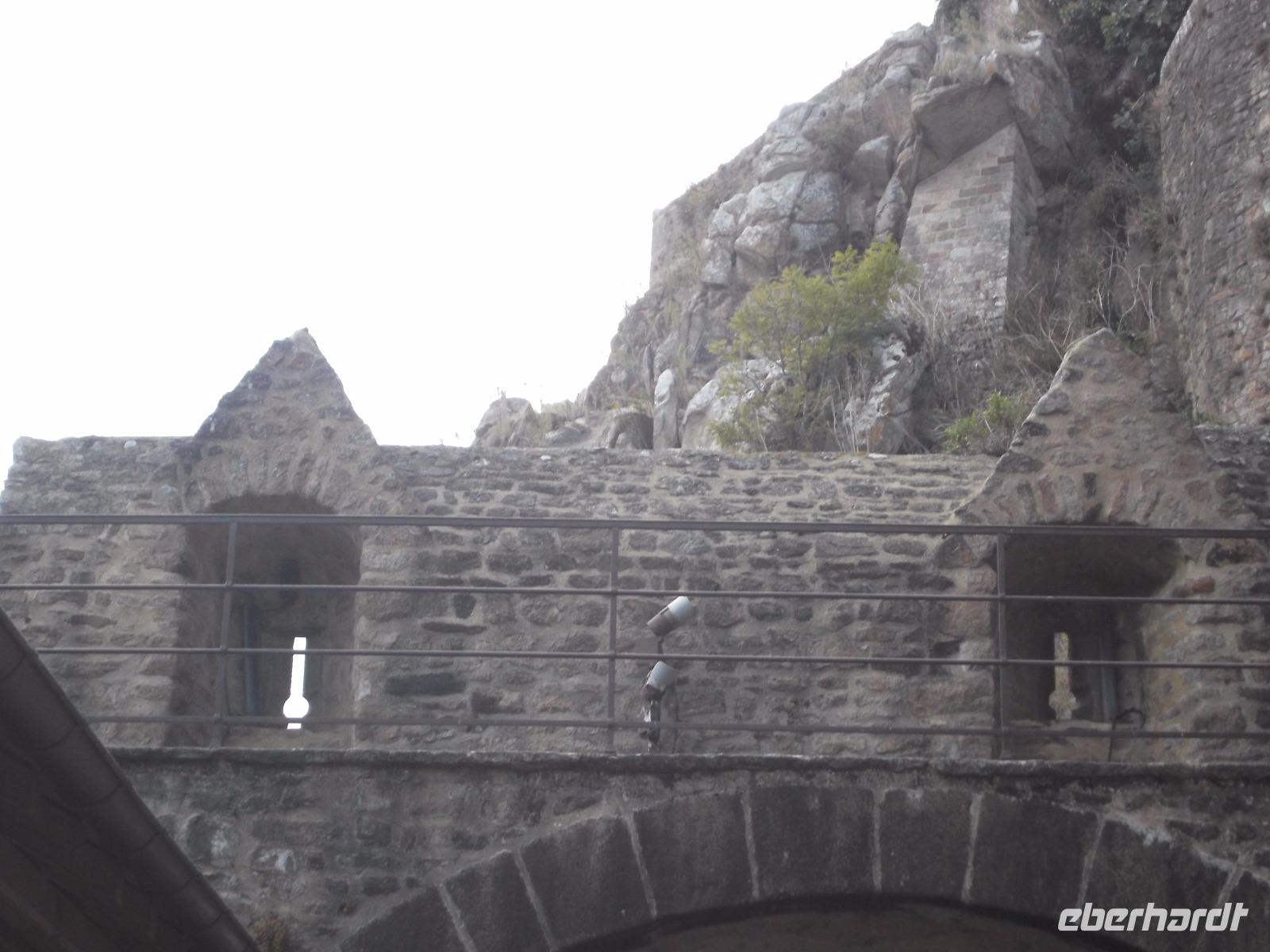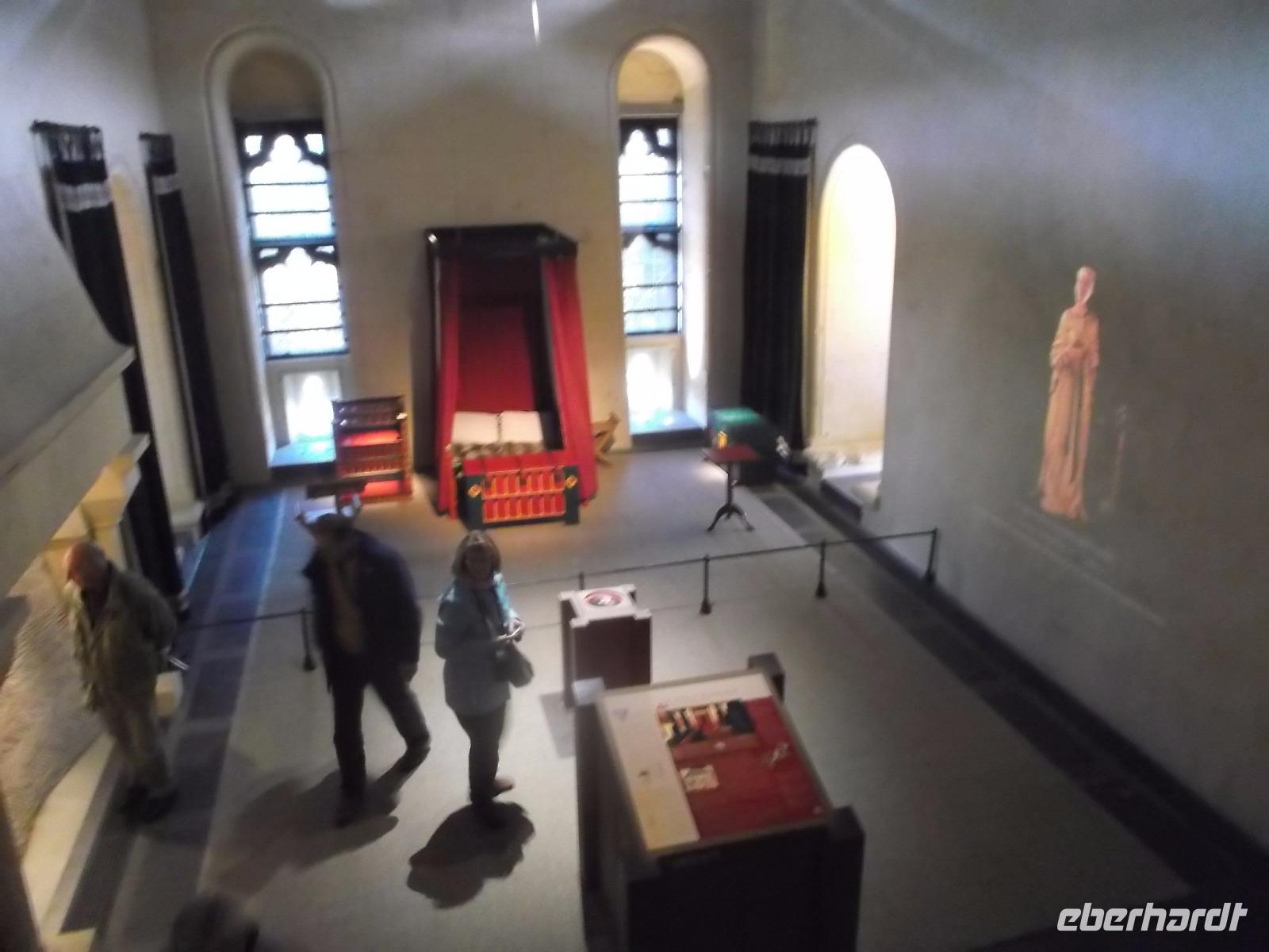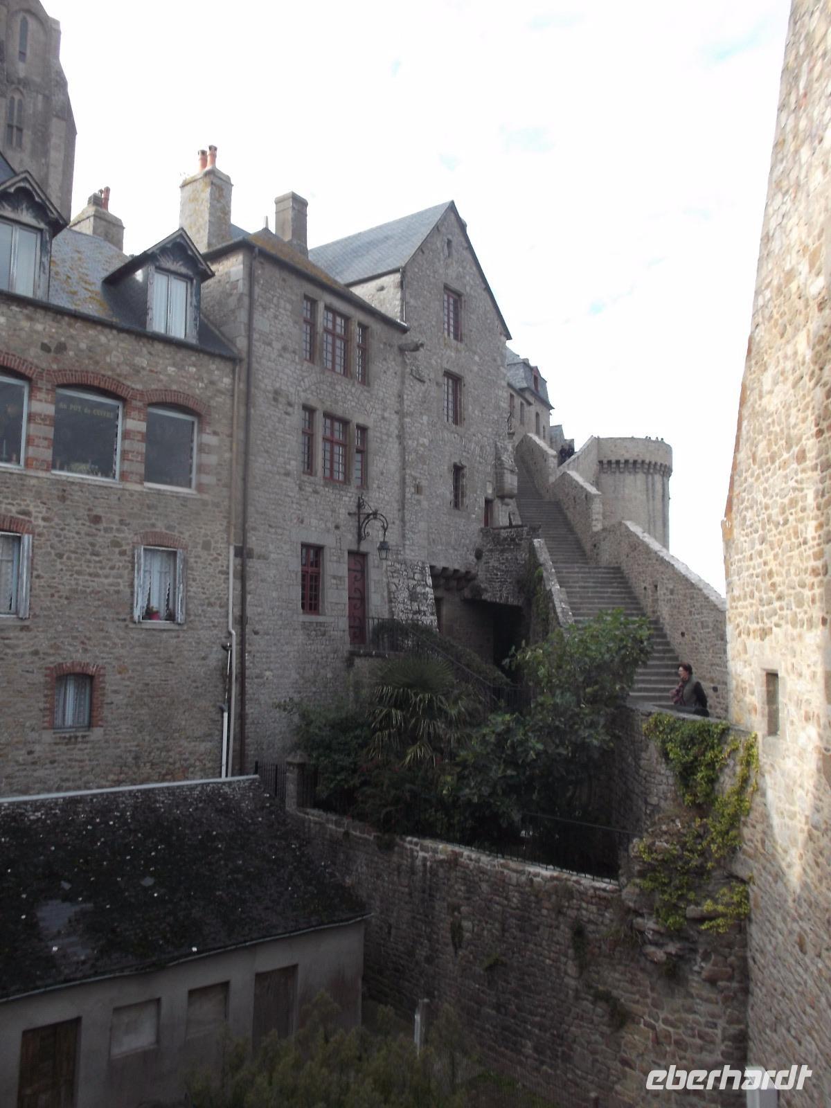 Auf dem Weg zum Kloster gingen wir nicht wie die anderen Besucher die Hauptstraße, sondern wir wählten den Weg über die Verteidigungsmauern, von wo aus man auch einen guten Blick über die Bucht von St. Michel, hat. Der Aufstieg ist interessant, aufgrund seiner vielen Stufen aber auch ermüdend. Endlich standen wir dann am Haupteingang, ich löste die Tickets und wir erreichten die eigentliche Klosteranlage. Gleich neben der Kirche liegt eines der „Wunder" vom Mont St.Michel. Genannt wird er der „schwebende Kreuzgang", denn er weist eine zur Bucht hin teilweise offene Seite auf, was ihm den Eindruck verleiht, direkt im Himmel zu enden. Von hier gelangt man in die verschiedenen Räumlichkeiten des einstigen Klosters, sieht z.B. in einem Saal die gewaltigen Säulen, die das Gewicht der darüberliegenden Kirche tragen. In mehreren gotischen Sälen haben nicht nur die Mönche gelebt, sondern auch zahlreiche gekrönte Häupter und wichtige Menschen aus ganz Europa als Pilger übernachtet. Die meisten Funktionsräume des ehemaligen Klosters und Einiges vom später hier eingerichteten Staatsgefängnis kann man besichtigen.
