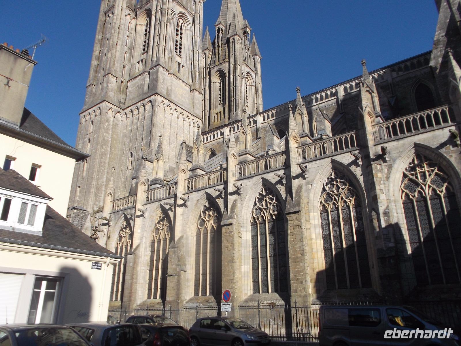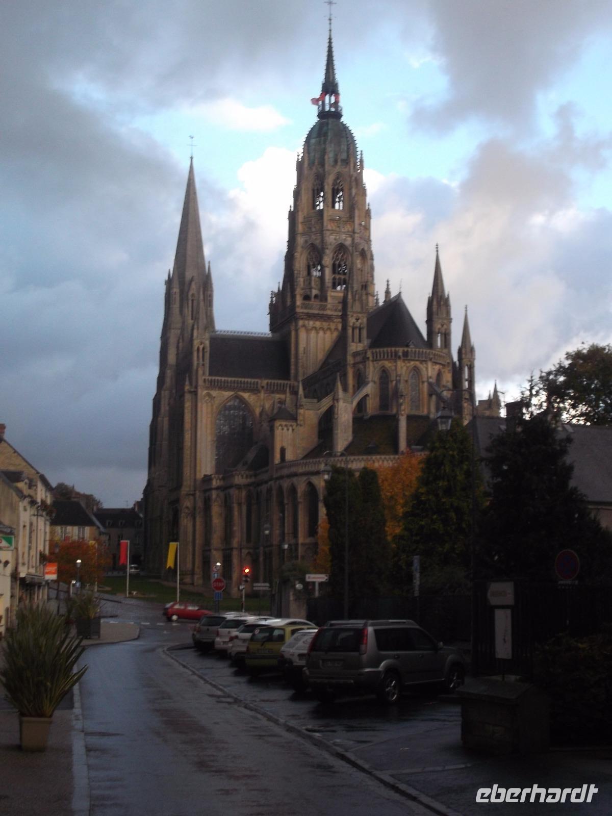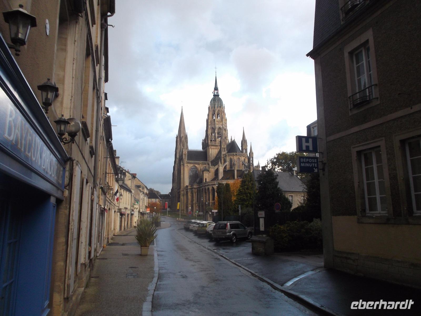 Unser Tag startete mit dem Besuch der alten Normannenhauptstadt Bayeux, an deren Rand unser Hotel lag. Kurz war der Weg in die historische Altstadt des kleinen Städtchens, die beherrscht wird von der großartigen Kathedrale Notre Dame, die noch heute Bischofssitz ist. Ursprünglich im normannisch-romanischen Stil errichtet, wurde die Kathedrale später gotisch fertiggebaut und mehrfach leicht stilistisch verändert. Dennoch präsentiert sie sich bis heute äußerlich fast perfekt und stadtbestimmend und beeindruckt im Inneren mit gewaltiger Raumwirkung. Besonders sehenswert ist die Krypta. Da sie mehrere Jahrhunderte lang vermauert und vergessen war, haben sich die Gewölbemalereien und die Gesamtwirkung hier hervorragend erhalten.