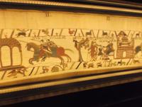 Herausragende Sehenswürdigkeit von Bayeux aber ist eines der berühmtesten und bedeutendsten Textilkunstwerke des Mittelalters und das passte genau in die Zusammenstellung und zum Motto unserer Reise - und zur Schlacht bei Hastings! Der „Teppich von Bayeux" zeigt nämlich die Vorgeschichte, den Verlauf und die Bedeutung der Schlacht. Ausgestellt in einem in den 80er Jahren des 20. Jahrhunderts eigens dafür errichteten Museumszentrum, präsentiert sich der „Teppich" als fast 70 m langer, nur 52 cm hoher Tuchstreifen, dessen Stickereien in 58 Einzelszenen die Geschichte(n) beschreiben, die sich 1066 rund um die Eroberung Englands durch die Normannen zugetragen haben sollen. Per Audioguide erklärte man uns die Bedeutung der einzelnen, mit bunten Wollfäden gestickten Szenen. Der Bildteppich weist einen erstaunlich guten Erhaltungszustand auf und nötigte uns Staunen über die Kunstfertigkeit und die Phantasie ab, mit denen die Künstler vor 1000 Jahren an diesem wundervollen alten Bildwerk arbeiteten. Tatsächlich entführt einen der Anblick des Kunstwerkes sozusagen als Originalzeuge in die Weltgeschichte!!