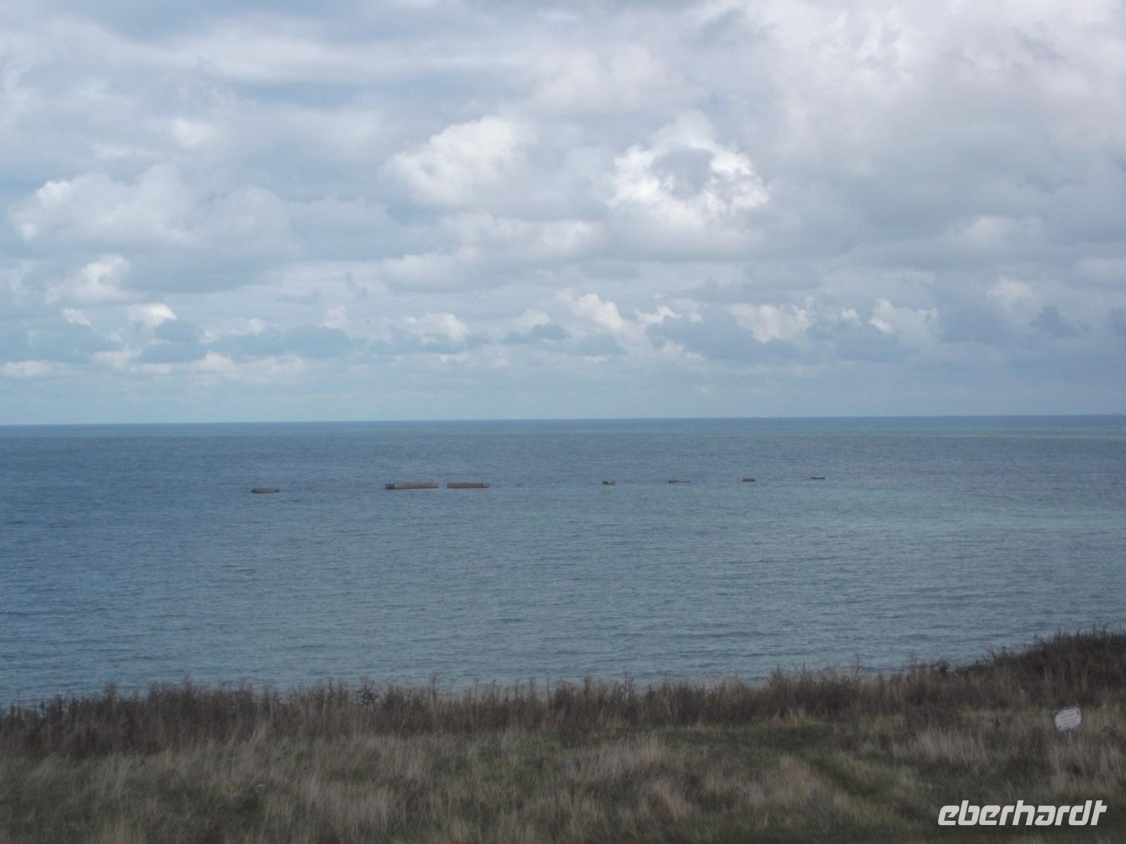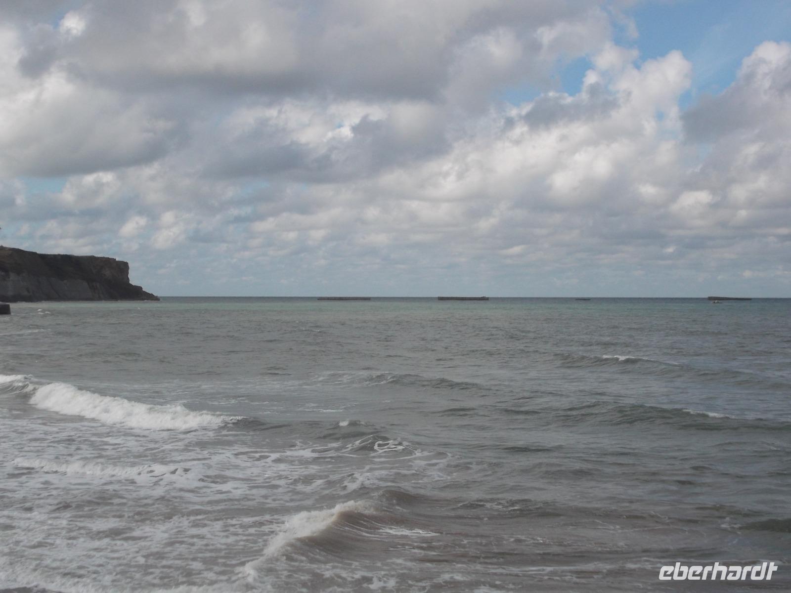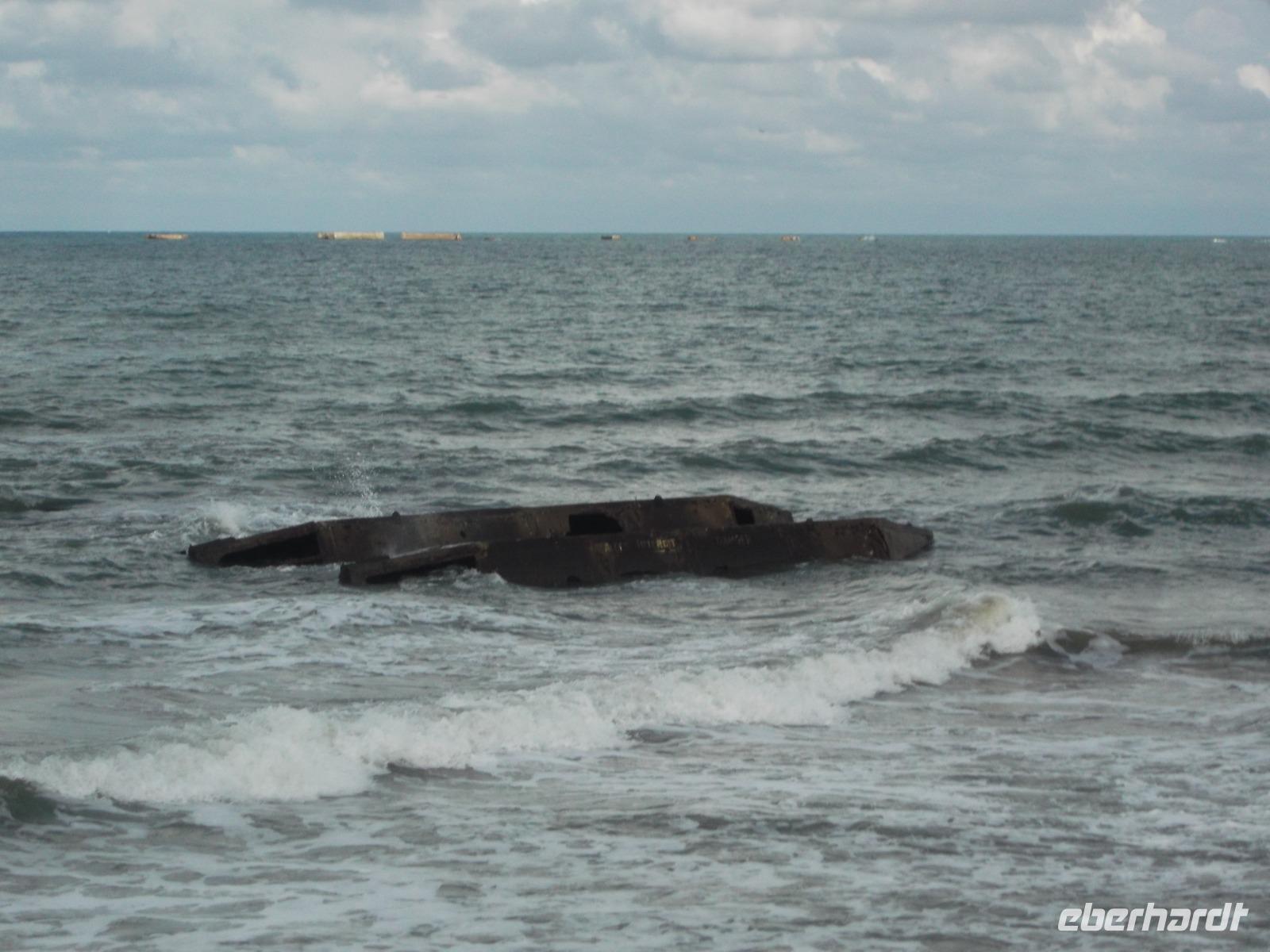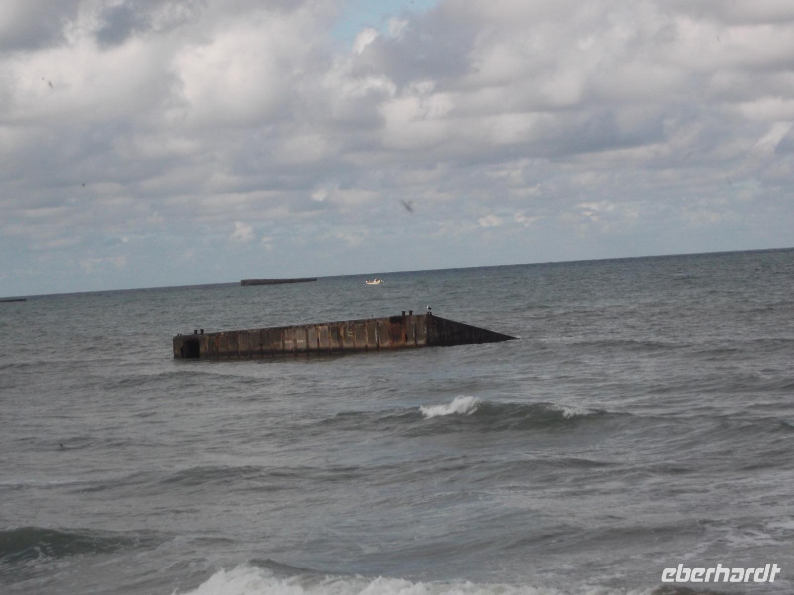 Bald schon erreichten wir die berühmte „Landungsküste", an der im Juni 1944 die Landung der Aliierten in der Normandie erfolgte. Den Auftakt zur endgültigen Niederlage Hitlerdeutschlands bildete die Landung der Truppen aus verschiedenen Nationen, die 1944 mit etwa 4300 Schiffen aus England zum Überraschungsangriff auf die deutsche Westfront hierhergekommen waren. Arromanches ist der Ort an der normannischen Küste, der sich bis heute am stärksten dem Gedenken verschrieben hat. Hier sieht man bis heute die Reste der einst großangelegten Landeoperation, die in der Militärgeschichte beispiellos war. Ihren Hafen nämlich, der zum Ausladen von Truppen und Kriegsmaterial dienen sollte, hatten aufgrund der Unwegsamkeit der Landungsküste die Alliierten mit Hilfe von betongefüllten riesigen Senkkästen, die man zwischen den Schiffen transportierte und dann auf den Boden ließ selbst mitgebracht. 33 künstlichen Molen, sogenannte „Mulberry-Häfen", wurden angelegt und ihre Überreste sieht man heute noch hier bei Arromanches, dazu auch noch Reste der ehemaligen großen Schwimmpontons.Im Museum von Arromanches wird darüber sehr ausführlich berichtet und wir hatten Zeit, uns hier umzuschauen.
