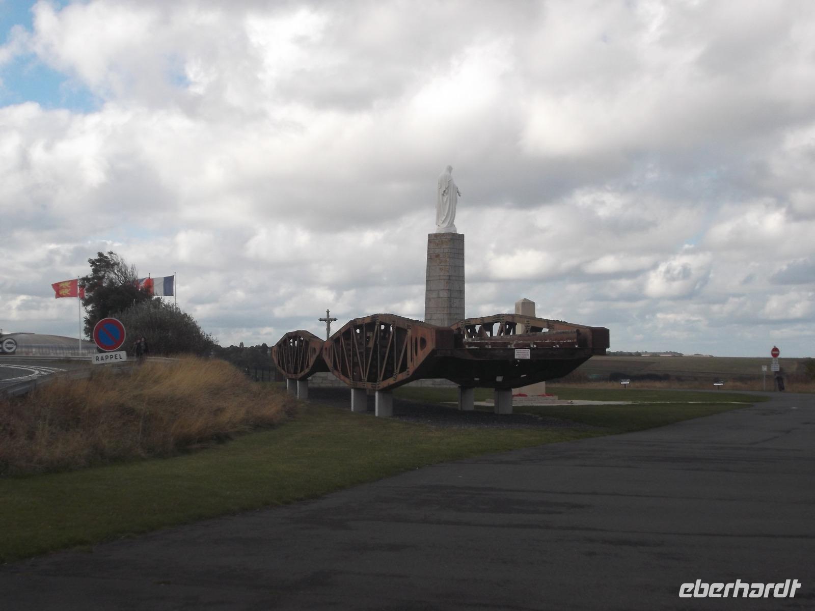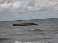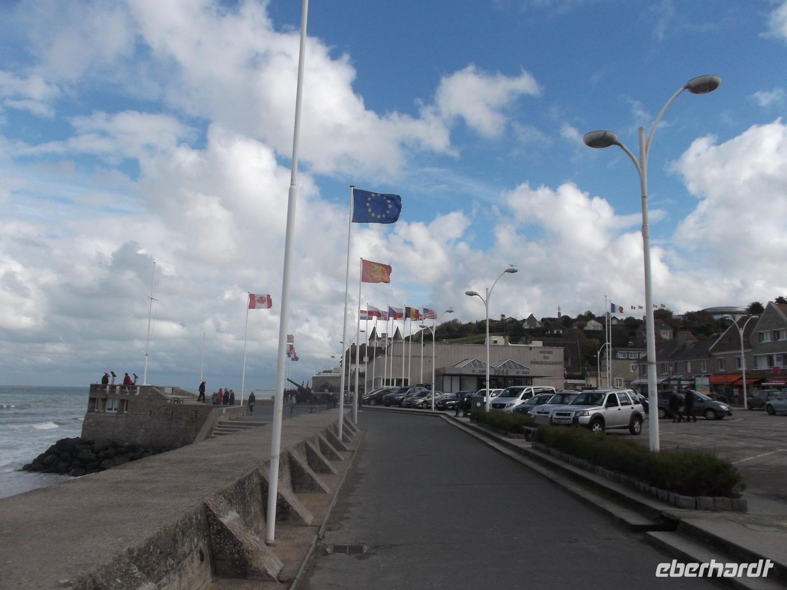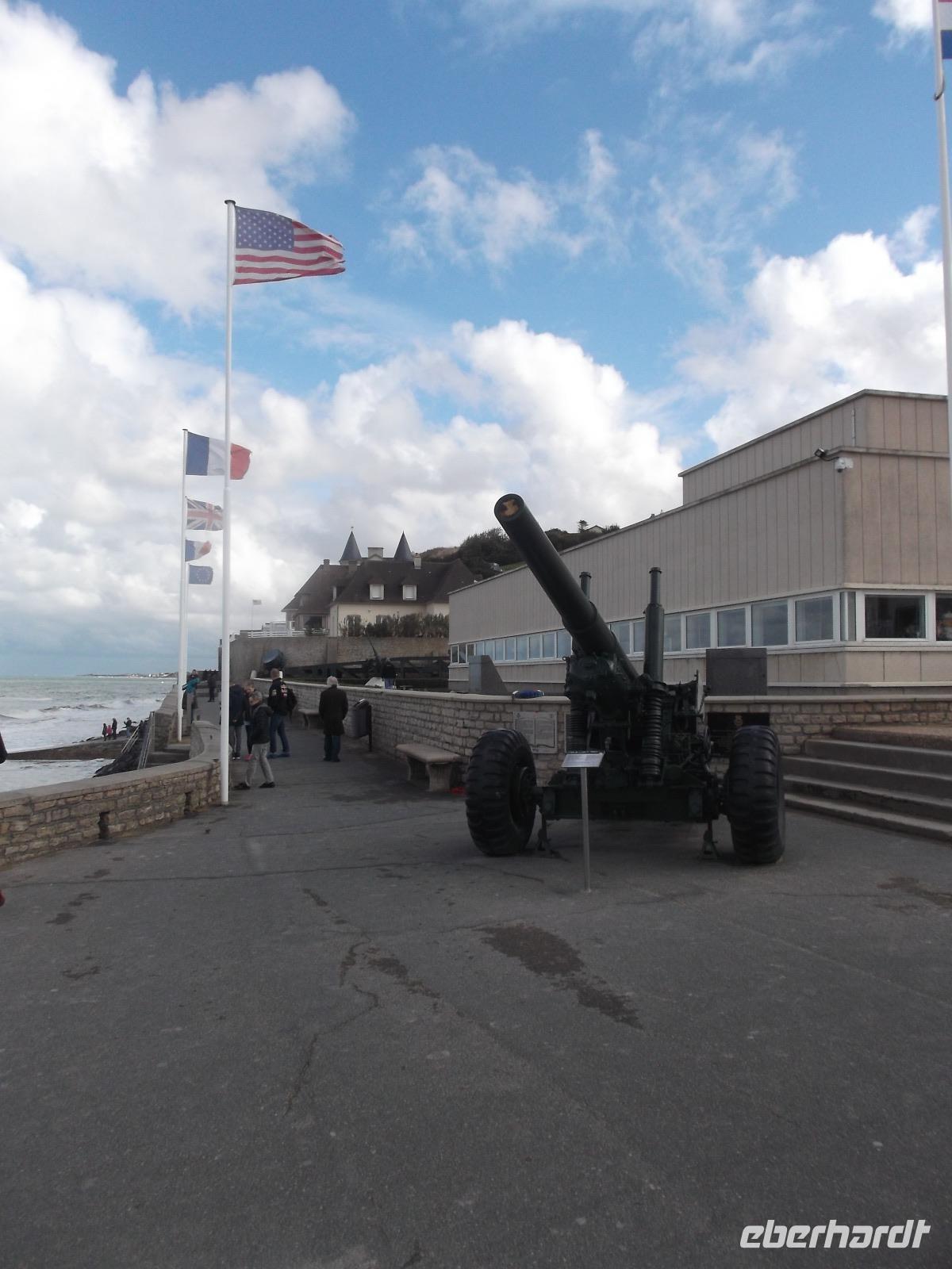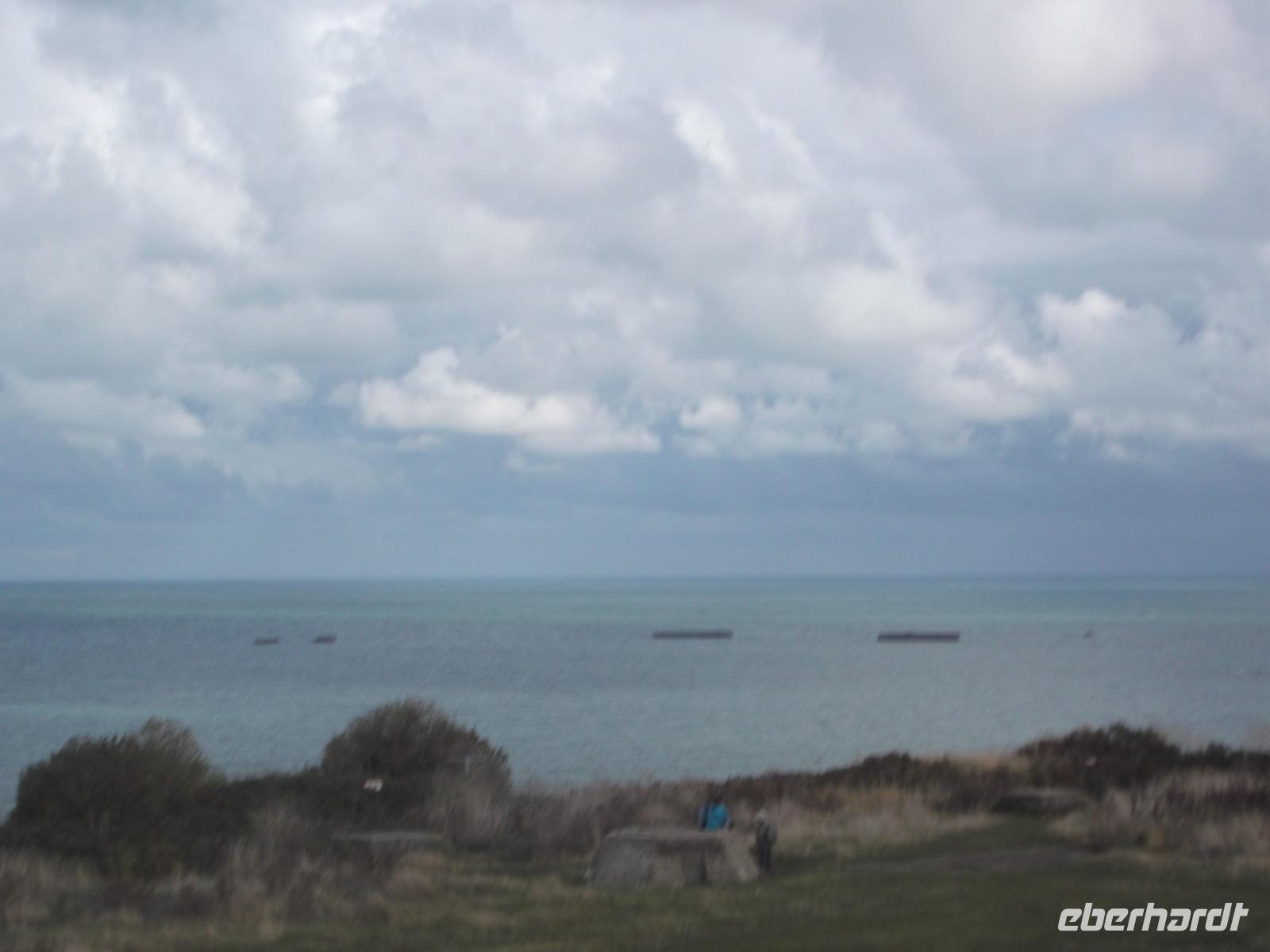 Bald schon erreichten wir die berühmte „Landungsküste", an der im Juni 1944 die Landung der Aliierten in der Normandie erfolgte. Den Auftakt zur endgültigen Niederlage Hitlerdeutschlands bildete die Landung der Truppen aus verschiedenen Nationen, die 1944 mit etwa 4300 Schiffen aus England zum Überraschungsangriff auf die deutsche Westfront hierhergekommen waren. Arromanches ist der Ort an der normannischen Küste, der sich bis heute am stärksten dem Gedenken verschrieben hat. Hier sieht man bis heute die Reste der einst großangelegten Landeoperation, die in der Militärgeschichte beispiellos war. Ihren Hafen nämlich, der zum Ausladen von Truppen und Kriegsmaterial dienen sollte, hatten aufgrund der Unwegsamkeit der Landungsküste die Alliierten mit Hilfe von betongefüllten riesigen Senkkästen, die man zwischen den Schiffen transportierte und dann auf den Boden ließ selbst mitgebracht. 33 künstlichen Molen, sogenannte „Mulberry-Häfen", wurden angelegt und ihre Überreste sieht man heute noch hier bei Arromanches, dazu auch noch Reste der ehemaligen großen Schwimmpontons.Im Museum von Arromanches wird darüber sehr ausführlich berichtet und wir hatten Zeit, uns hier umzuschauen.