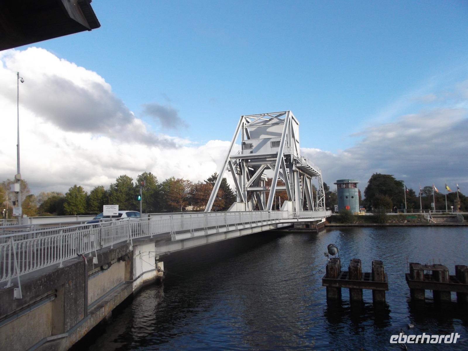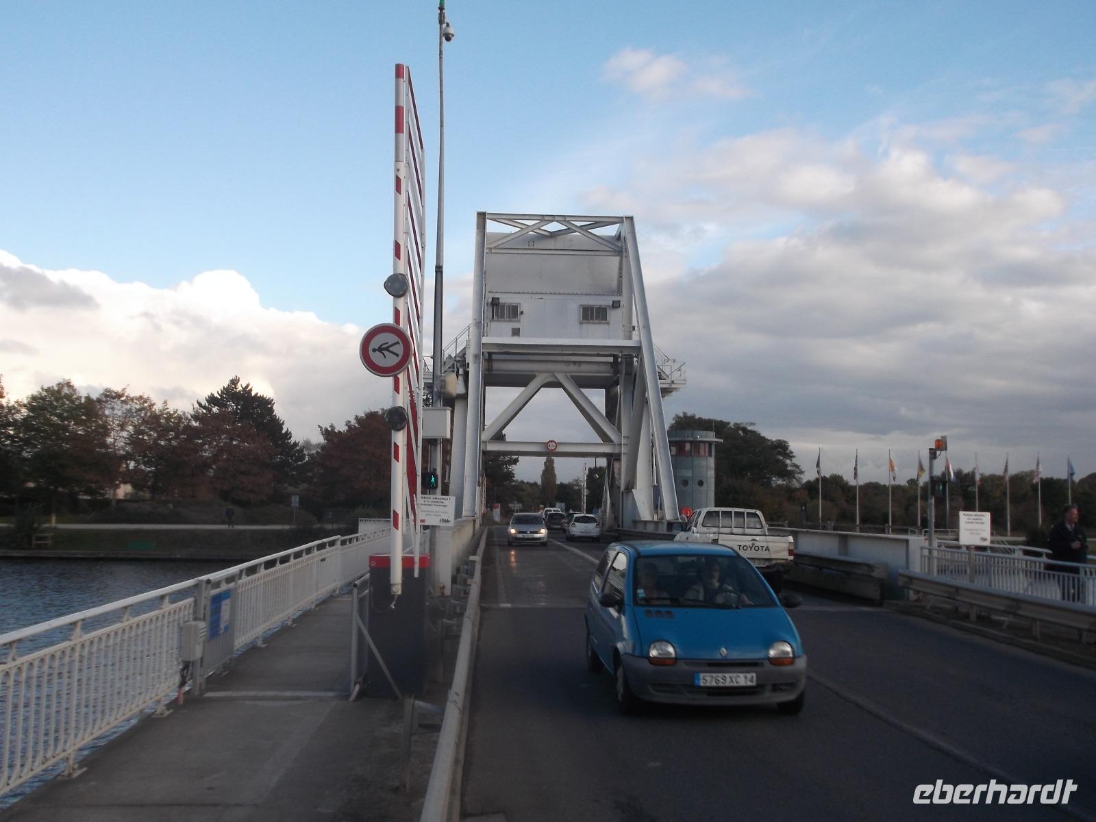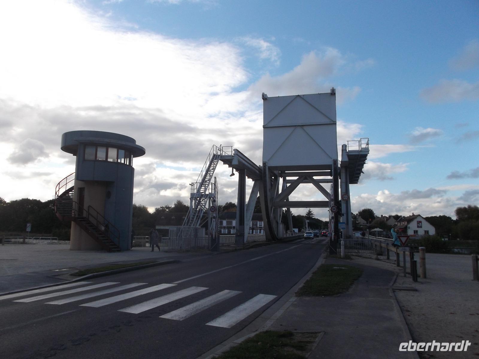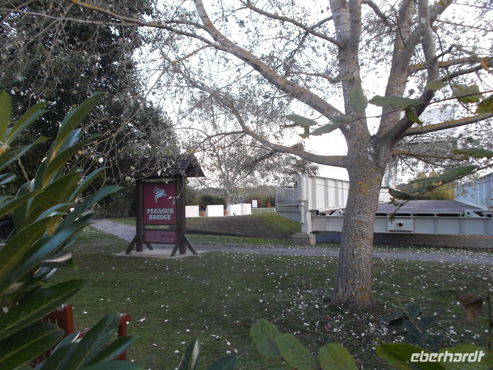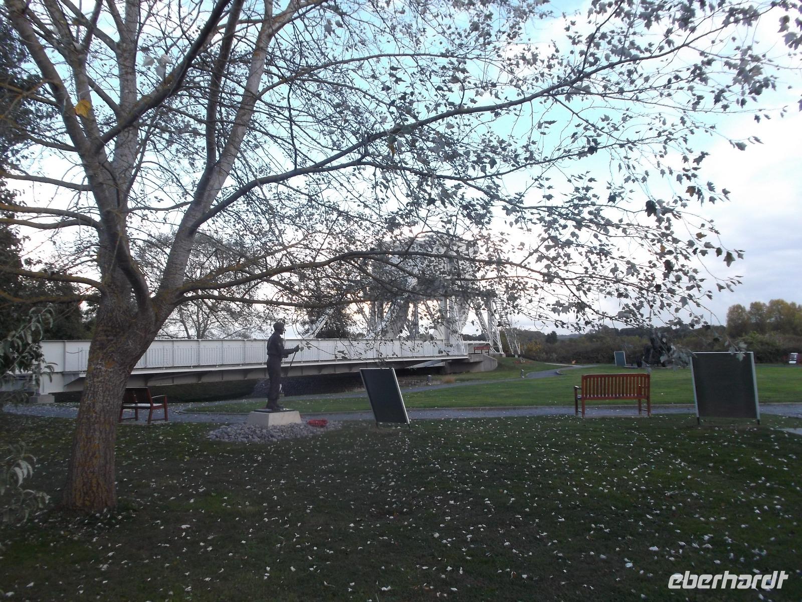 Anschließend fuhren wir in der Nähe der Ladungsküste bis Ouistreham und dann weiter zu unserem Hotel nach Caen. Allerdings konnten wir unterwegs noch einen Stopp einlegen: an der berühmten Pegasusbrücke, die 1944 Ziel einer beispiellosen Einzelaktion des „D-Day" genannten Landungstages der Aliierten war. Eine britische Luftlande-Einheit, von deren Schulterstücken mit geflügeltem Pferd übrigens der heutige Ehrenname „Pegasusbrücke" stammt, hatte damals die strategisch wichtige Brücke erobert und gehalten. Wir hatten Gelegenheit zu einem ausgedehnten Fotostopp an der seltsam aussehenden Brücke. Ihre Besonderheit verdankt sie der relativ seltenen 1935 erstmals gebauten Konstruktion einer Wipp-Brücke.