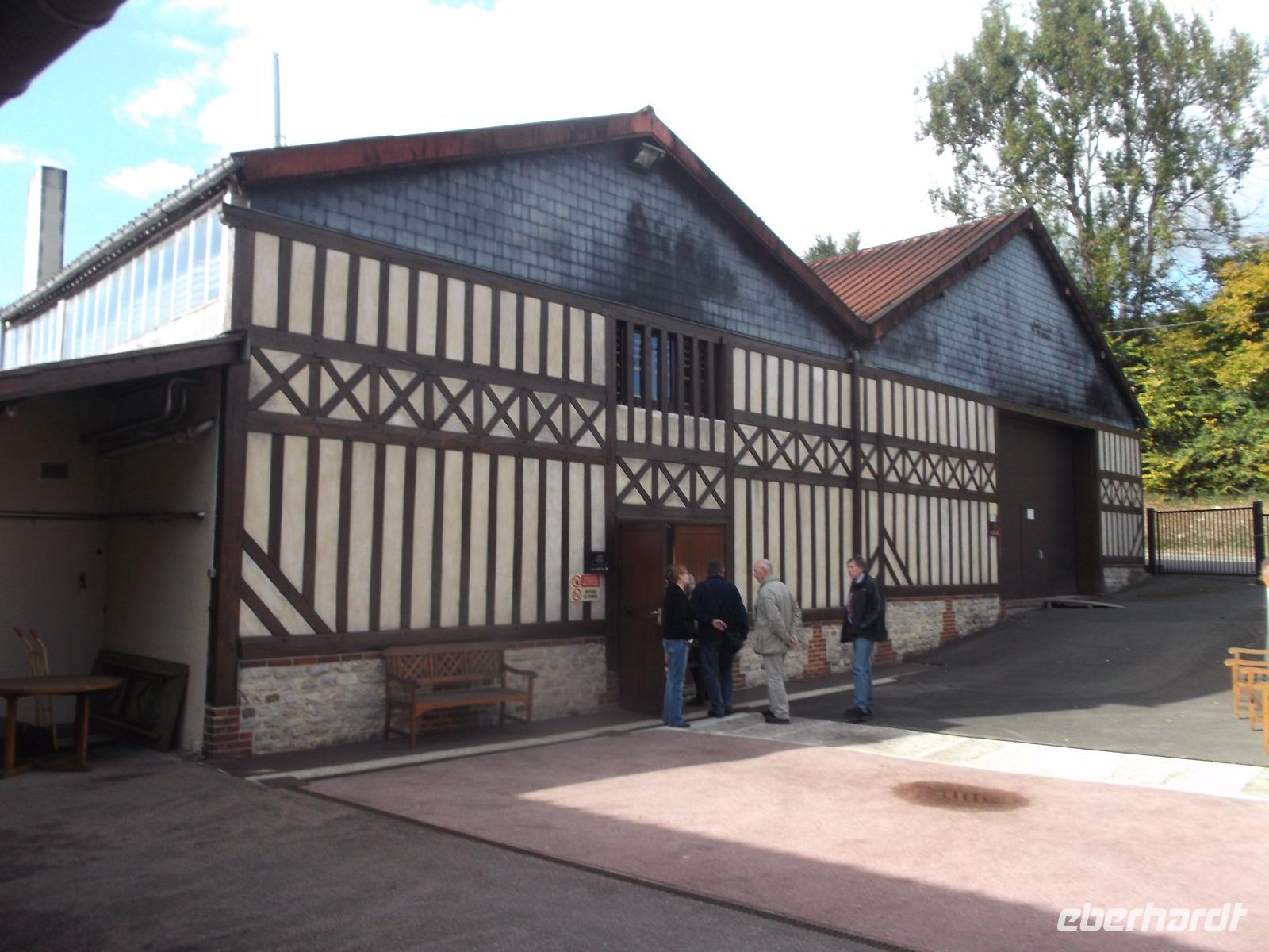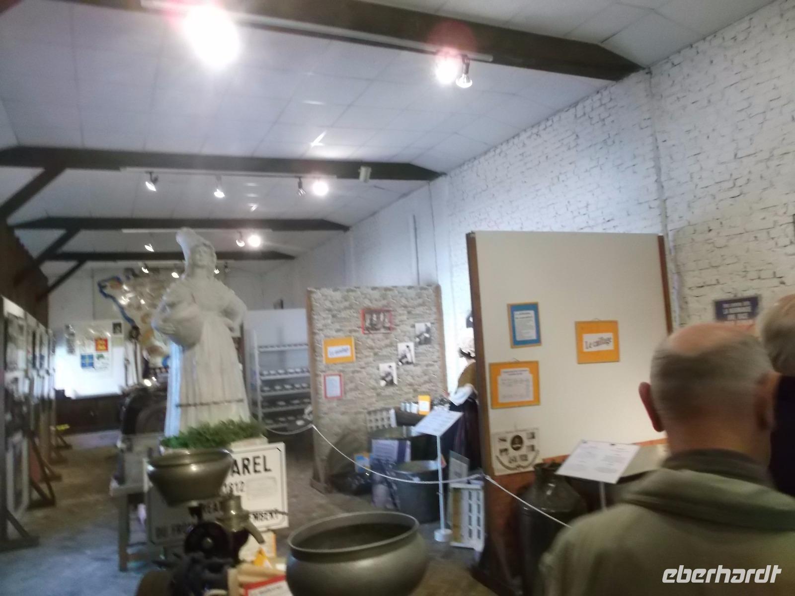 Von Falaise aus fuhren wir weiter durch die normannische Landschaft und machten dann im Städtchen Vimoutiers am Camembert-Museum Halt. Vor einiger Zeit kam man auf die Idee, dem wohl populärsten und am weitesten weltweit verbreiteten normannischen Käse ein Museum zu errichten. Ganz in der Nähe liegt das Dörfchen Camembert, in dem der gleichnamige französische Weißschimmelkäse „erfunden" worden sein soll. Der Legende nach war die Bäuerin Marie Fontaine Harel die erste, die ihn - nach einem ihr überlassenen Rezept aus der Landschaft des Brie - hergestellt haben soll. Rasch trat er seinen Siegeszug an, wurde schnell auch außerhalb der Normandie kopiert und dann auch in anderen Ländern, teilweise in Lizenz, produziert. Wir erfuhren Wissenswertes über die Besonderheiten und die Herstellung der normannischen Käsespezialität - beispielsweise wie die Käse ihre Form bekommen und durch Wenden, Waschen und Reifung ihr charakteristisches würziges Aroma. Natürlich konnten wir auch Käse verkosten - sogar im Vergleich mit zwei anderen populären normannischen Käsesorten, dem Livarot und dem Pont l'Eveque, der als eine der ältesten Käsespezialitäten der Normandie gilt.