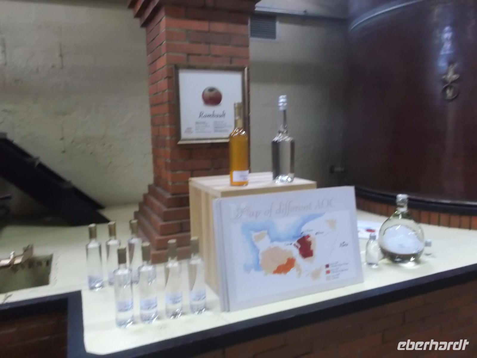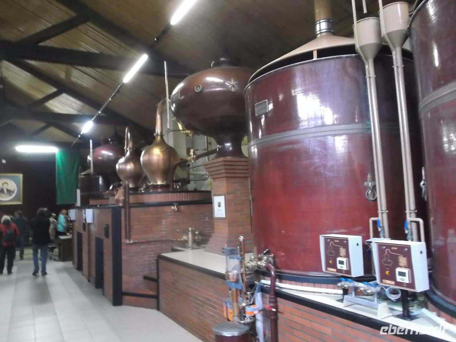 Nach der Käseverkostung wartete nach kurzer Busfahrt noch eine andere normannische Speziualität auf uns: der Calvados! An einer Brennerei hielten wir an, wurden freundlich empfangen und durch den Betrieb geführt, in dem in langer Tradition aus dem normannischen Apfelwein „Cidre" der nicht weniger berühmte und leckere „Calvados" gebrannt wird. Benannt wurde der Schnaps nach der Region aus der er stammt. Heute ist dieser Apfelbrand eine der bekanntesten und in alle Welt exportierten normannischen Spezialitäten. Beim Rundgang durch die inzwischen sehr moderne Destillieranlage und dem Durchgang durch die großen Lagerhallen erfuhren wir, was alles nötig ist, um die begehrte, hier erzeugte und nicht nur in Frankreich beliebte Spirituose zu erzeugen. Natürlich konnten wir uns danach auch hier bei einer „Degustation" überzeugen, dass der hier hergestellte Apfelbrand „Calvados" wirklich sehr schmackhaft ist.
