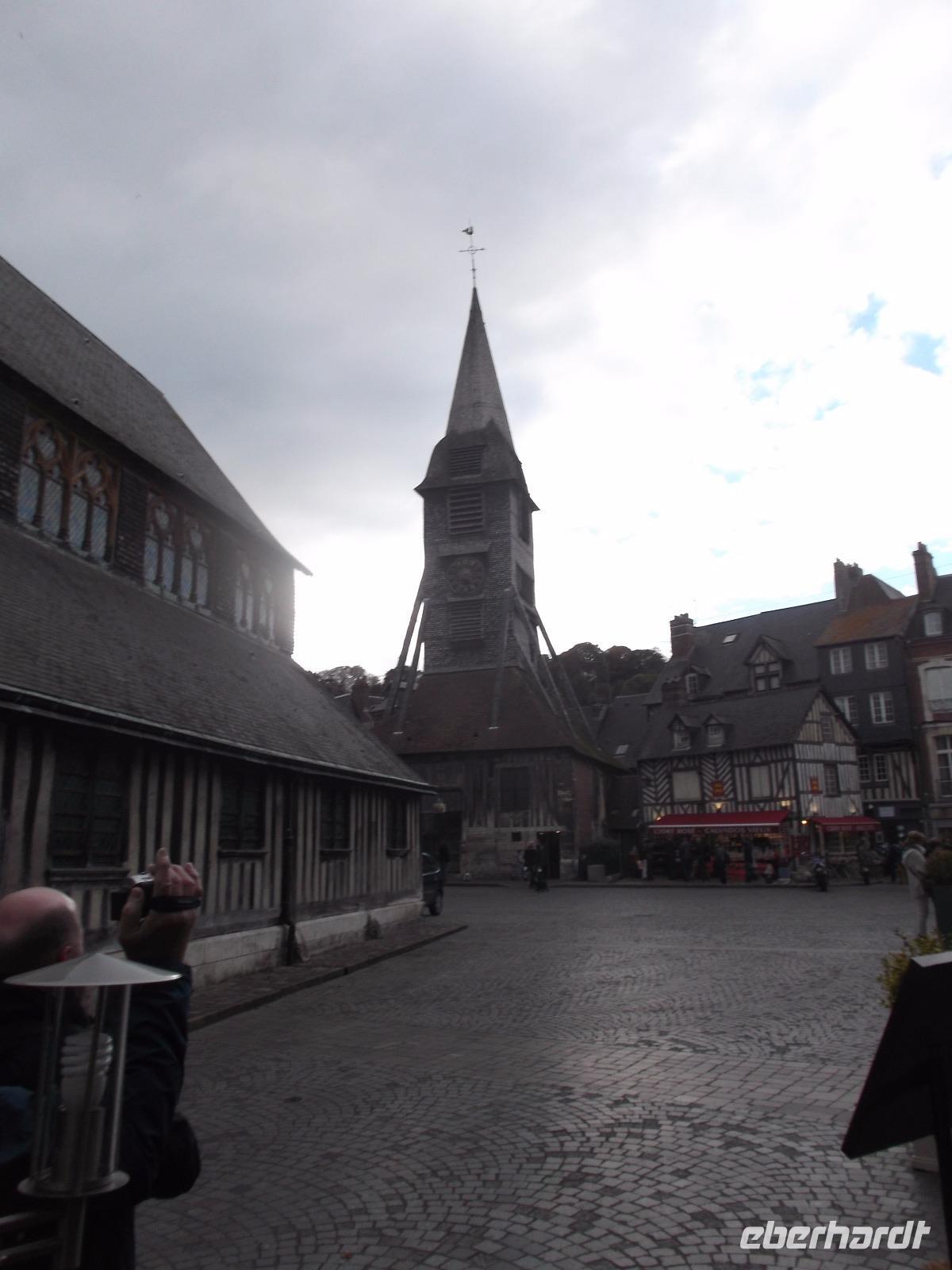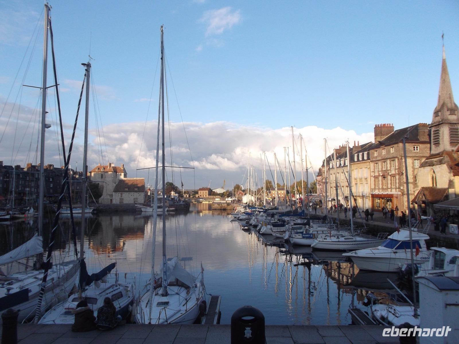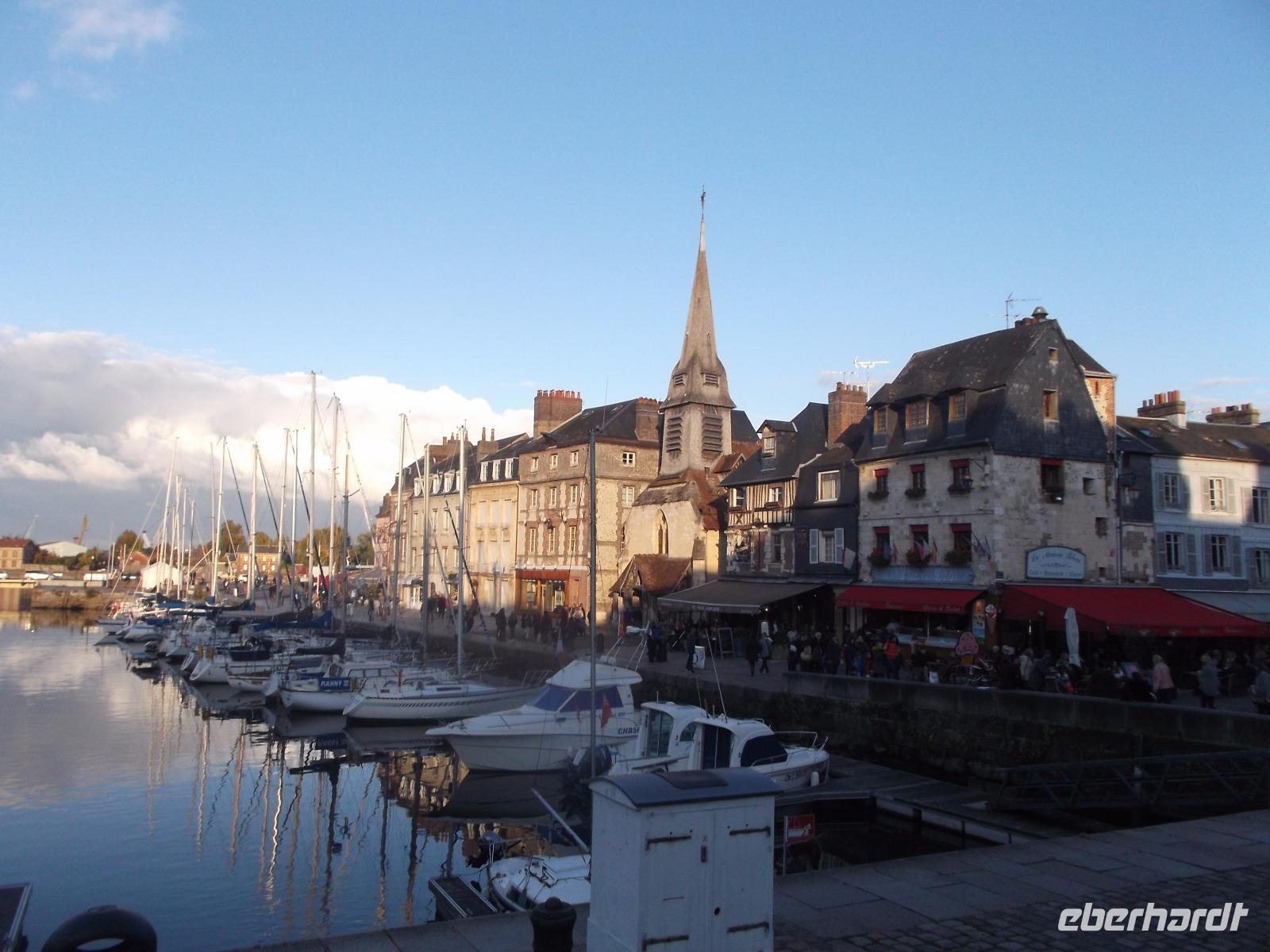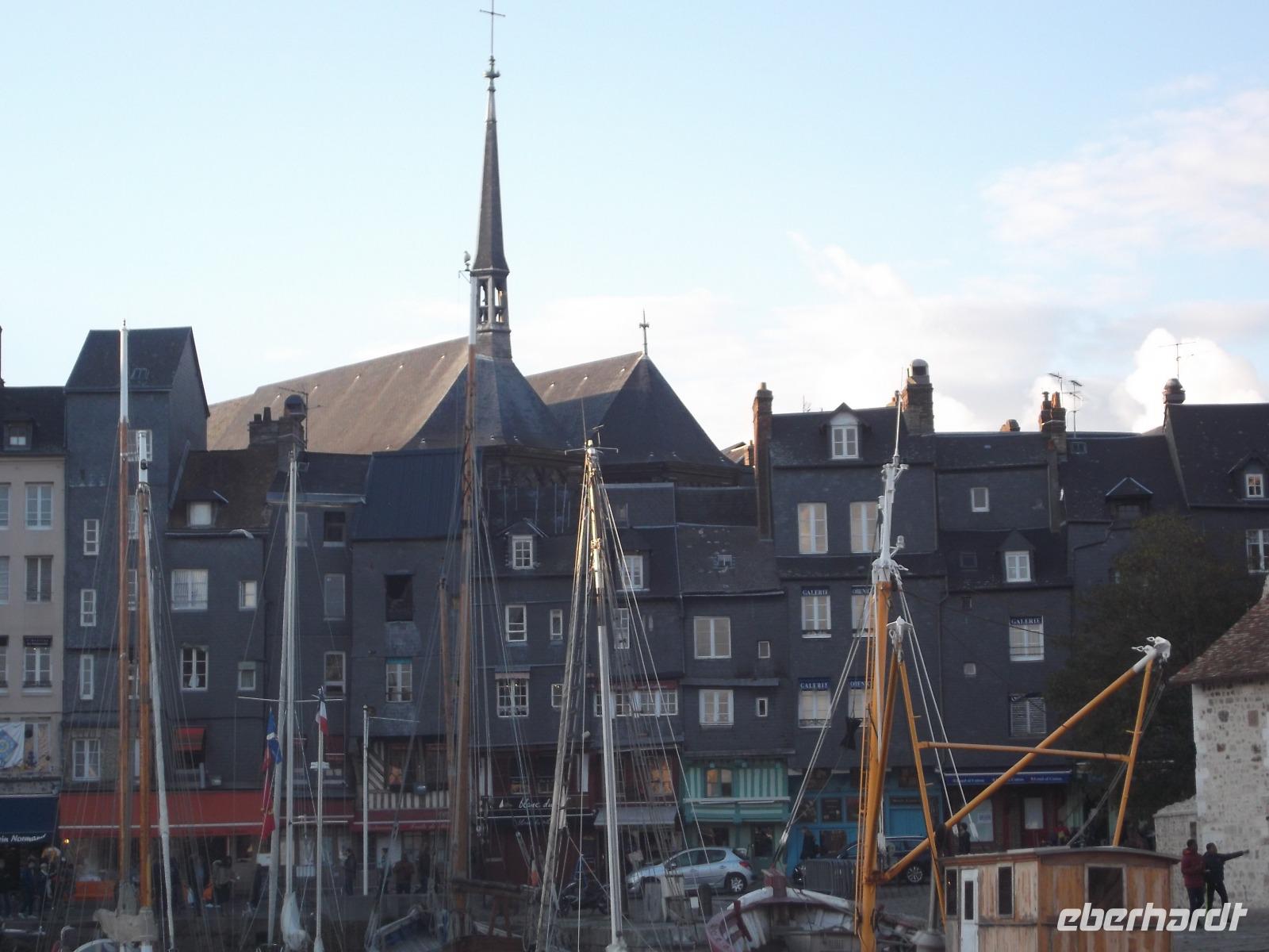 Im Anschluss an die Verkostung fuhren wir in Richtung Küste und verbrachten noch etwas Zeit in der hübschen alten Hafenstadt Honfleur. Vor allem ihr von pittoresken hohen, schiefergedeckten Häusern umstandene Hafenbecken ist eine der bedeutendsten Touristenattraktionen der Normandie, die mit ihrem unglaublichen Flair aus dem 17. Jahrhundert nicht nur zahllose Besucher, sondern auch namhafte Künstler anzog und anzieht. Man behauptet sogar, die Stilrichtung der impressionistischen Malerei sei hier erfunden worden. Neben dem historischen Hafenbecken ist auch die „Lieutenanterie", das alte Haus des Hafengouverneurs, sehr sehenswert, an dessen einer Seite noch ein altes Tor mit Ehrentafeln für den ersten Gouverneur Französisch-Kanadas zu finden ist. Von hier, von Honfleur aus, ist Samuel de Champlain Anfang des 17. Jh. nach „Neufrankreich" gestartet und hat die Siedlung Quebec gegründet. Unweit von hier steht die bemerkenswerte alte Katherinenkirche, ein in ganz Europa einzigartiges Werk. Da sie kurz nach dem französischen Sieg im hundertjährigen Krieg erbaut wurde, als überall Baumeister und Steinmetze fehlten, die zum Wiederaufbau der großstädtischen Kathedralen abgezogen worden waren und es für Orte wie Honfleur auch nicht genug Baumaterial gab, errichteten Schiffszimmerleute die flache, aber sehr eindrucksvolle zweischiffige Kirche. Der Überlieferung nach verwendeten sie für die Kirche und ihren malerischen freistehenden Glockenturm als Materialien die Reste abgewrackter Schiffe.