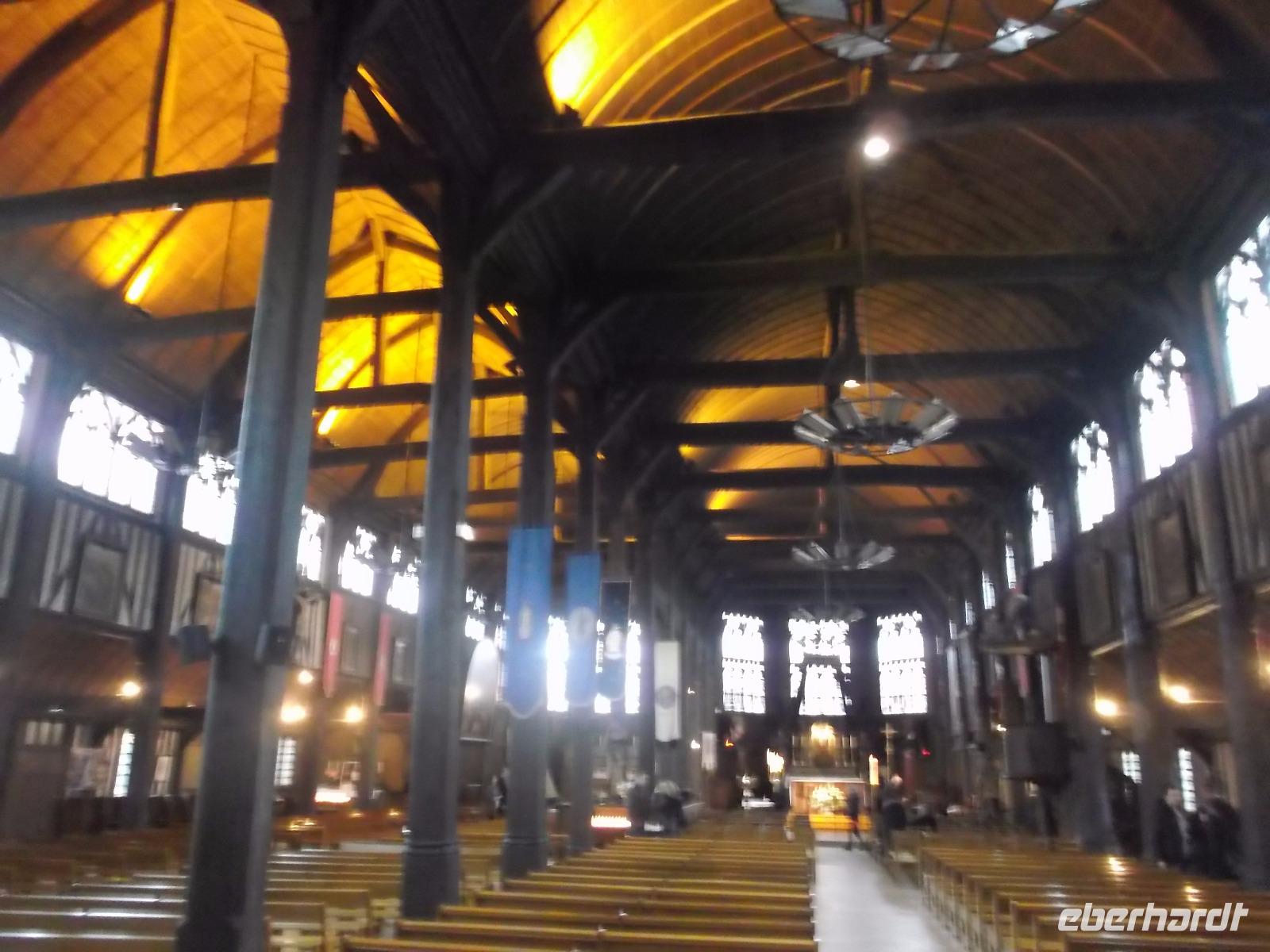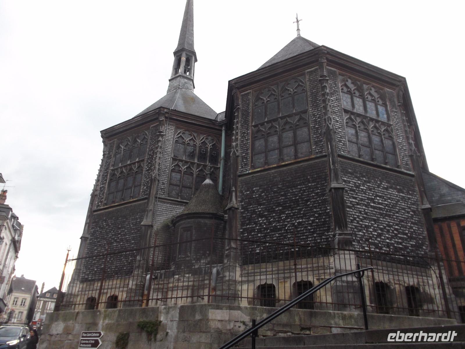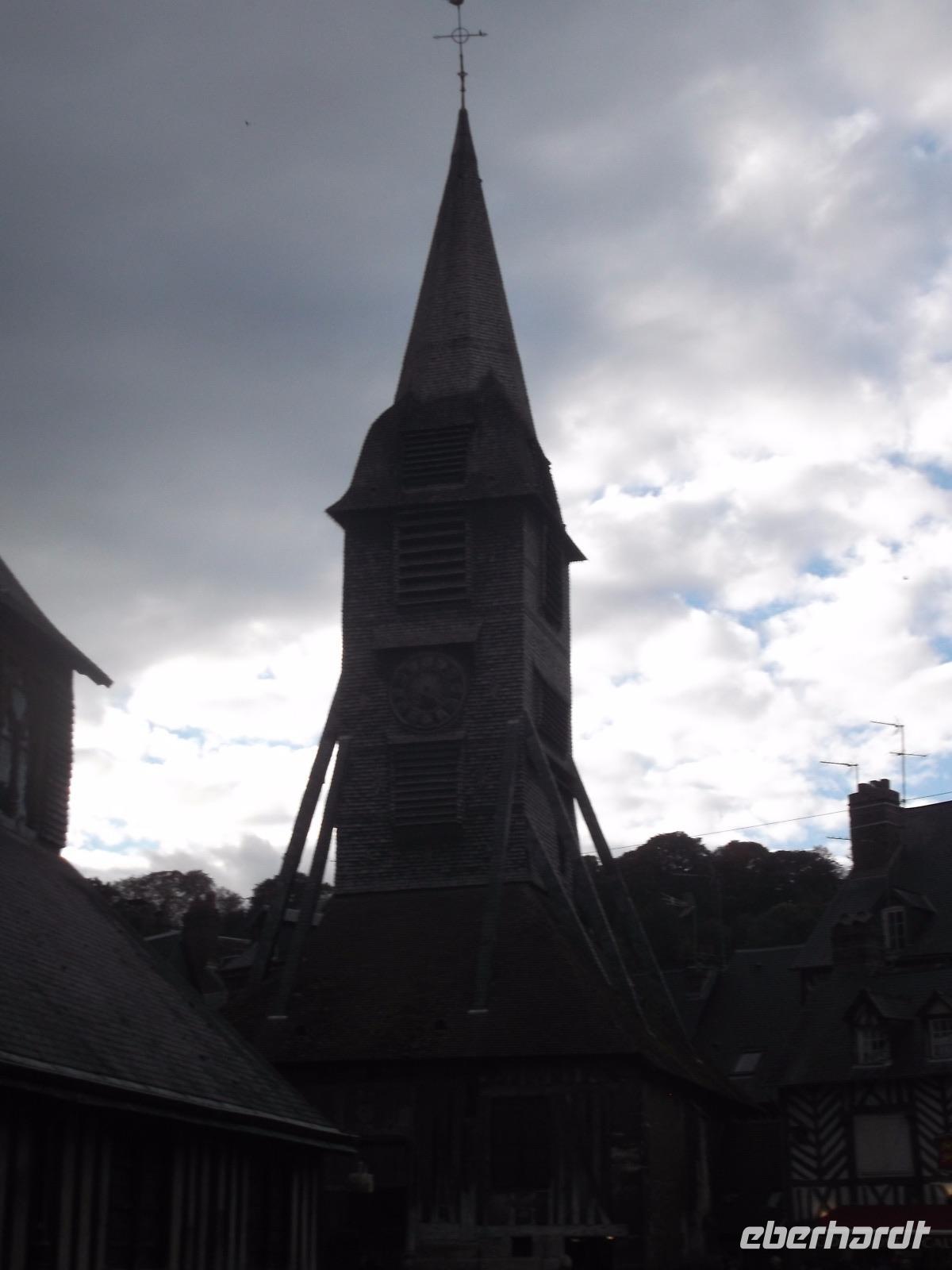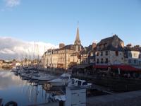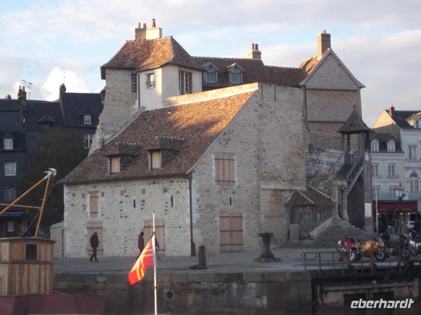 Im Anschluss an die Verkostung fuhren wir in Richtung Küste und verbrachten noch etwas Zeit in der hübschen alten Hafenstadt Honfleur. Vor allem ihr von pittoresken hohen, schiefergedeckten Häusern umstandene Hafenbecken ist eine der bedeutendsten Touristenattraktionen der Normandie, die mit ihrem unglaublichen Flair aus dem 17. Jahrhundert nicht nur zahllose Besucher, sondern auch namhafte Künstler anzog und anzieht. Man behauptet sogar, die Stilrichtung der impressionistischen Malerei sei hier erfunden worden. Neben dem historischen Hafenbecken ist auch die „Lieutenanterie", das alte Haus des Hafengouverneurs, sehr sehenswert, an dessen einer Seite noch ein altes Tor mit Ehrentafeln für den ersten Gouverneur Französisch-Kanadas zu finden ist. Von hier, von Honfleur aus, ist Samuel de Champlain Anfang des 17. Jh. nach „Neufrankreich" gestartet und hat die Siedlung Quebec gegründet. Unweit von hier steht die bemerkenswerte alte Katherinenkirche, ein in ganz Europa einzigartiges Werk. Da sie kurz nach dem französischen Sieg im hundertjährigen Krieg erbaut wurde, als überall Baumeister und Steinmetze fehlten, die zum Wiederaufbau der großstädtischen Kathedralen abgezogen worden waren und es für Orte wie Honfleur auch nicht genug Baumaterial gab, errichteten Schiffszimmerleute die flache, aber sehr eindrucksvolle zweischiffige Kirche. Der Überlieferung nach verwendeten sie für die Kirche und ihren malerischen freistehenden Glockenturm als Materialien die Reste abgewrackter Schiffe.