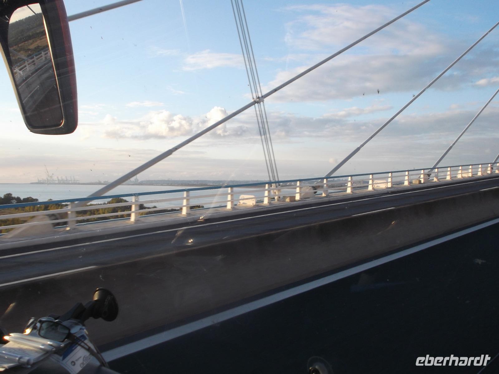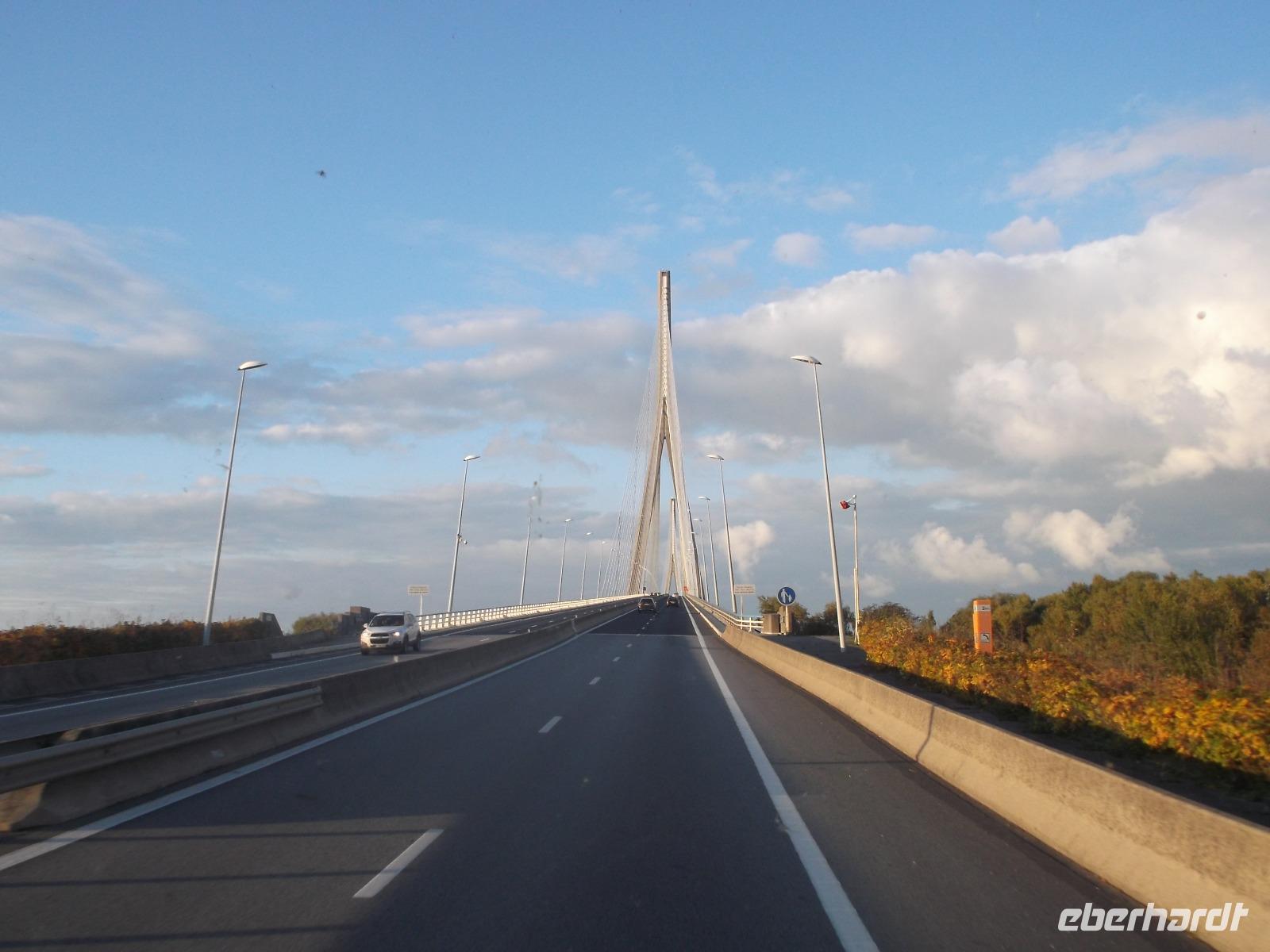 Über die berühmte Brücke, mit über zwei Kilometern etwa so lang wie die Champs-Elysées in Paris, fuhren wir zu unserem Übernachtungsort. Die Pont de Normandie ist bis heute eine der größten Schrägseilbrücken der Welt und führt in etwa 60 m Höhe über dem Höchstwasserspiegel in gewaltigem Bogen eine vielbefahrene mehrspurige Straße über die Seinemündung. An einem der alten Hafenbecken am Rande von Le Havre lag unser Hotel für die heutige Übernachtung.
