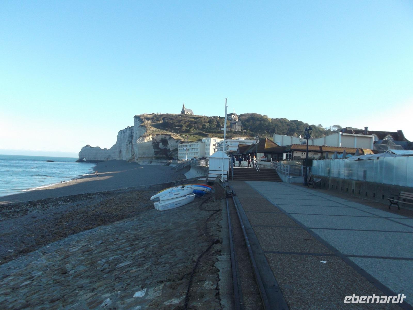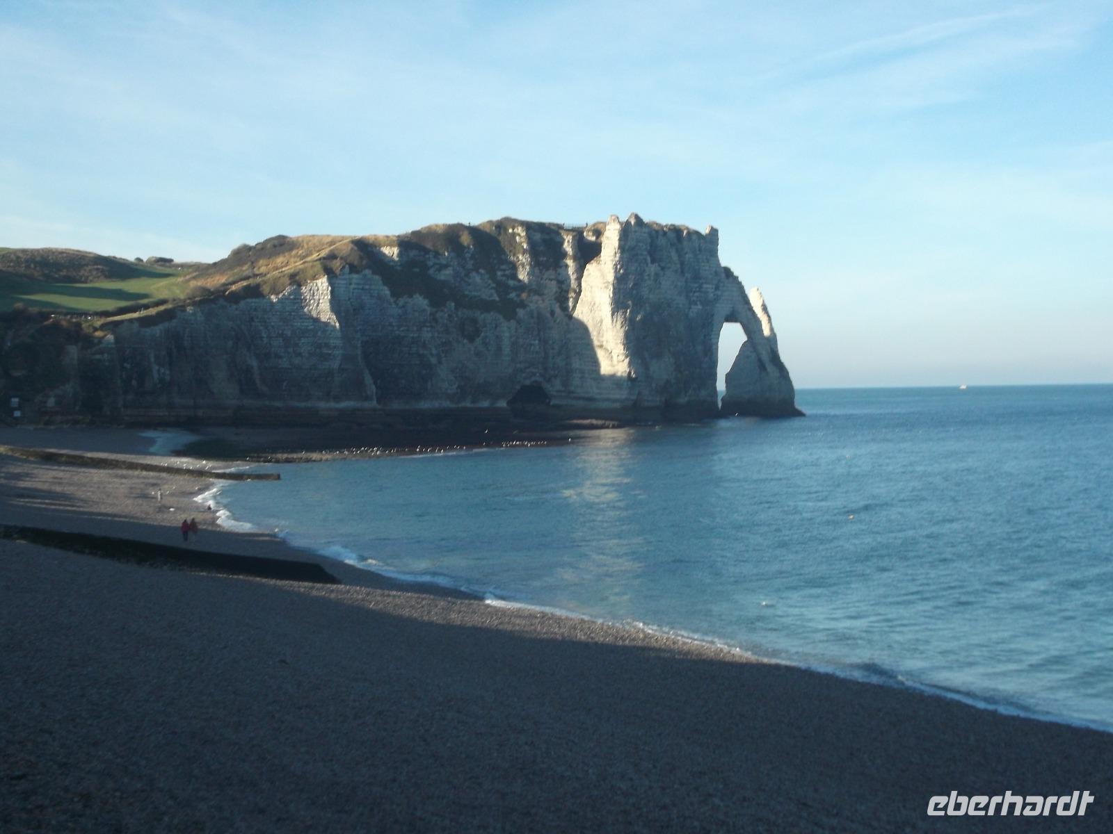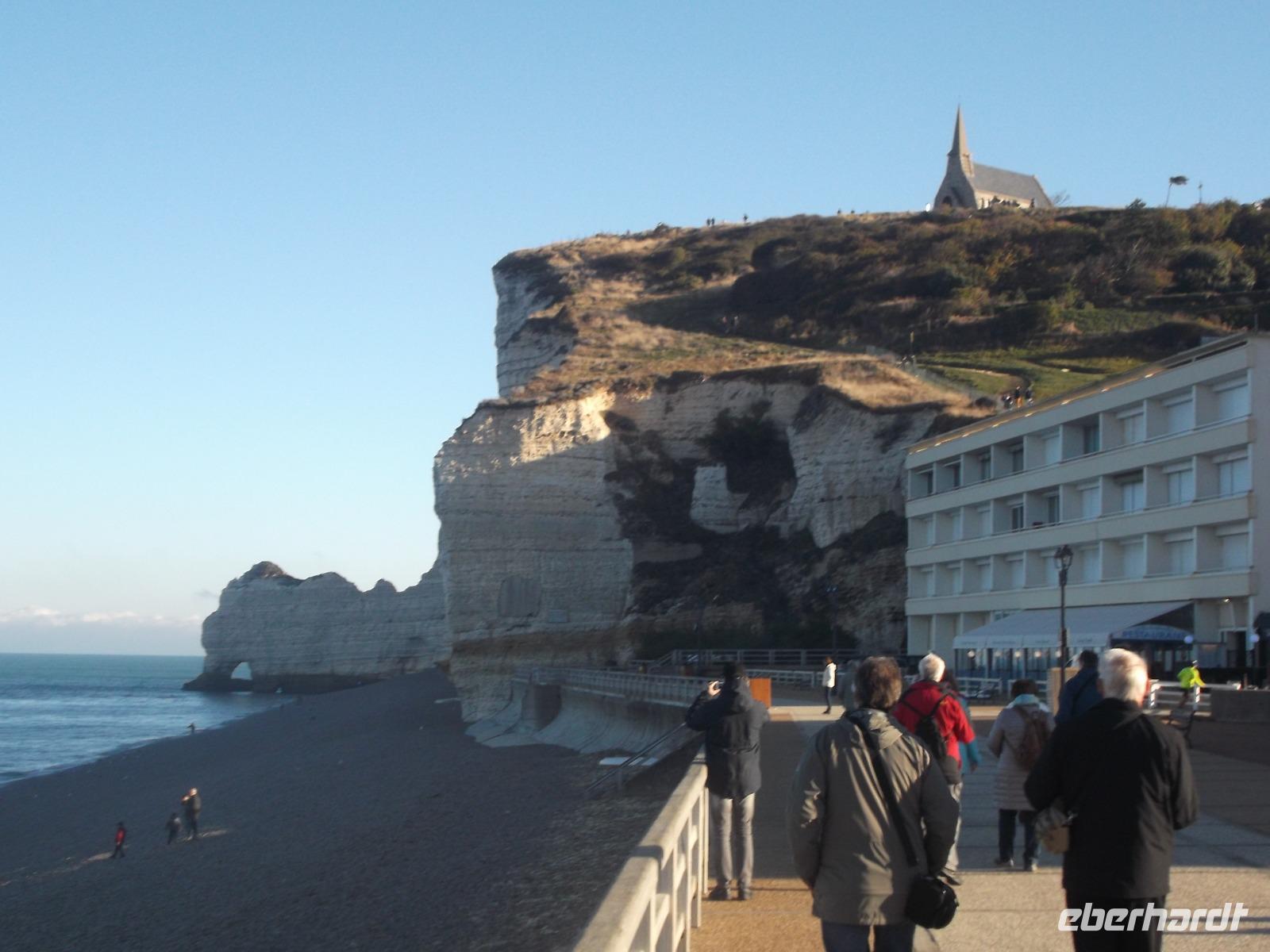 Heute Morgen ging es nach Ètretat, dem vielleicht bekanntesten normannischen Badeort. Er wird eingerahmt von Felsen mit herrlichen Formationen und hat - wie auch das gestern besuchte Honfleur - schon seit Jahrhundertern Künstler angelockt. Darunter sind bedeutende Literaturgrößen wie Gustave Flaubert oder Guy de Maupassant. Sie haben hier gelebt und den Ort ebenso als Schauplatz in ihre literarischen Werke einbezogen wie der hier ansässige Krimiautor Maurice Leblanc, der die Figur des Meisterdiebes und -detektivs Arsène Lupin schuf. Auch bekannte romantische und impressionistische Maler - z.B. Boudin, Courbet und Delacroix waren von den zauberhaften Felsenskulissen angetan. Wie malten auch Huet, Matisse und Monet hier am Schotterstrand des Badeortes. Wer Etretát mit seiner Kies- und Schotterküste kennt, in der Saison extrem dicht mit Badenden und Sonnenhungrigen belebt, der war erstaunt und begeistert über die Ruhe, in der wir bei herrlichem Wetter unsere Zeit hier verbringen konnten. Nachdem wir vom Busparkplatz aus zunächst den Ort mit Restaurants, Creperien und malerischen alten Fachwerkhäusern - das wohl bemerkenswerteste von ihnen ist der Nachbau der alten Fischmarkthalle - durchschritten hatten, erreichten wir bald den Strand. Wundersam sind die von der Natur geschaffenen Formen der „Falaises", jener Kreidefelsen, die wegen ihrer bizarren Formen wegen oft auch „Elefantenfelsen" genannnt werden. Tatsächlich erinnern sie - mit ihren durchbrochenen Steilküstenabschnitten und der Durchbrüche in den Felsen - an im Wasser stehende und mit ihren Rüsseln trinkende Elefanten. Einer von ihnen, „Falaise d'Amont", hat auf seiner Klippe eine kleine Kirche, gewidmet der Schutzpatronin der Seeleutete. Von hier hat man einen schönen Ausblick auf die Formationen die hinter Etretat auf der anderen Seite liegen, die Felsentore der „Falaise Porte d'Aval", ebenfalls „elefantenförmig" und mit einer an ein steinernes Segel erinnernden Felsnadel davor. Wir hatten in Etretát" genügend Zeit, um uns einen Überblick zu verschaffen und das herrliche Wetter für einen grandiosen Ausblick zu nutzen.