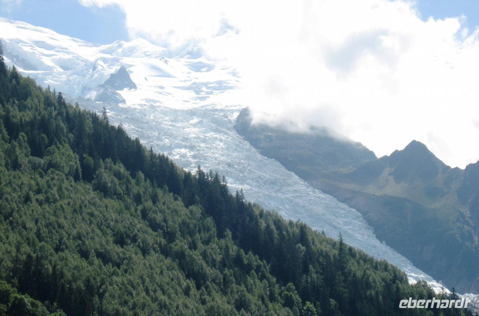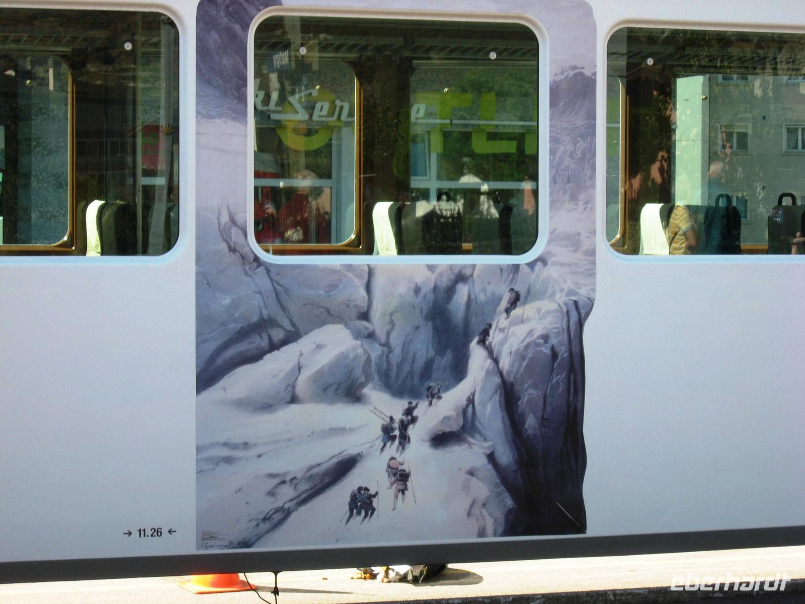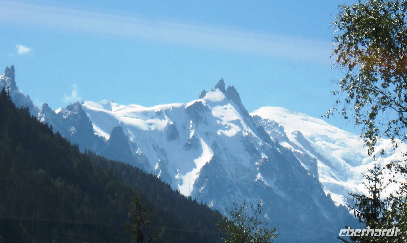 Nach dem Frühstück machen wir einen Spaziergang durch Martigny, besichtigen das römische Amphitheater, die Reste des römischen Forums und die Ausgrabungen eines Peristyl-Hauses. Dann geht es auch schon zum Bahnhof. Von hier fahren wir am späten Vormittag mit dem Mont Blanc Express über Vernayaz, die Trient-Schlucht, Finhaut und Vallorcine bis nach Chamonix Mont Blanc in Frankreich. Das Wetter ist immer noch vortrefflich und so nimmt fast die gesamte Reisegruppe die Seilbahn auf den 3.842 m hohen Aiguille du Midi. Ein ganz besonderes Naturerlebnis: von hier aus hat man bei klarem Himmel Blick auf den 4.810 m hohen Mont Blanc, aber auch die Bergsteigergruppen, die hier trainieren. Alternativ lockt die Montenvers-Zahnradbahn, die die Gäste bis zum Mer de Glace, dem 7 km langen Gletscher bringt, in dem eine Eisgrotte für Besucher eingerichtet ist. Aber auch ein Besuch in Chamonix selbst ist attraktiv: wir sehen viele Hotels und Häuser im typischen Châlet-Baustil, Cafés und eine Kirche, in die einige Kirchenfenster mit bunten Skifahrern eingesetzt worden sind.