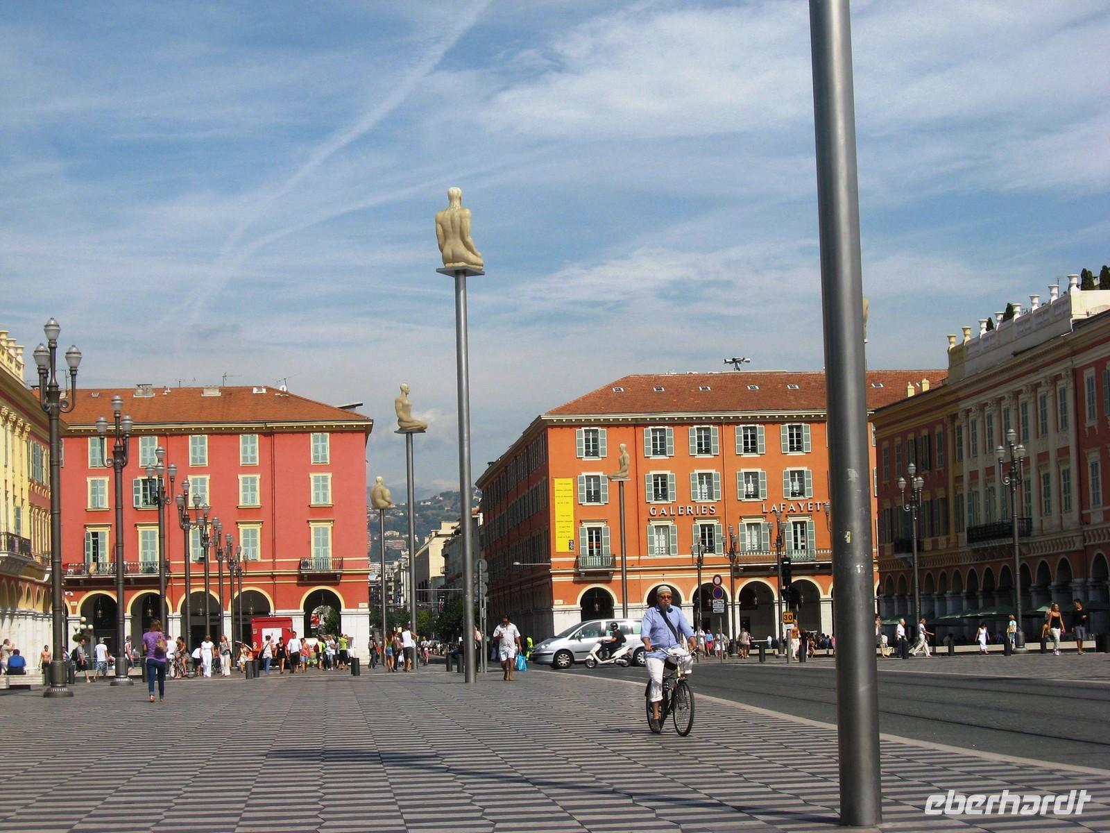 Wir beginnen den Morgen mit einem Stadtrundgang oder alternativ einer Stadtrundfahrt mit dem petit train für Touristen. Wir Fußgänger laufen vom Brunnen an der Place Massena, von der die große Nizzaer Einkaufsmeile in Richtung Norden verläuft zum schönen Gebäudekomplex Theater/Oper und danach über den Markt, auf dem täglich ein üppiges Angebot an Obst, Gemüse, Pilzen, Gewürzen, Blumen und Bildern bereitliegt, an der Präfektur vorbei durch enge Altstadtgassen bis zur Kathedrale Sainte-Réparate, zum wunderschönen und großen Stadtpalais Lascaris aus dem 16. Jahrhundert und im Bogen zum Justizpalast,