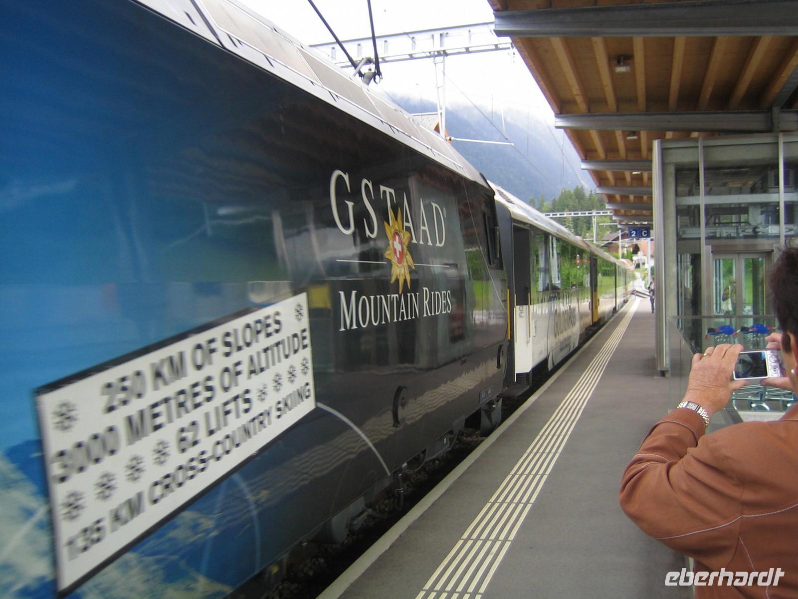 laken am Thuner See. Ein Aufenthalt bot die Gelegenheit die Stadt im Berner Oberland zu erkunden und das vergletscherte Jungfraumassiv bei herrlichem Sonnenschein zu genießen. Nach einem Mittagsimbiss am Ufer des Thuner Sees hieß es Schweiz Pur - die Fahrt durch das Simmental, mit seiner typischen Holzarchitektur der Schweizer Bergbauern. Es stimmt - vor jedem Haus auf der Alm ist die Schweizer Fahne aufgezogen. In Gstaad angekommen blieb noch etwas Zeit vor der Zugabfahrt in diesem bekannten Urlaubsort zu bummeln. Mit Schweizer Pünktlichkeit brachte uns der „ Panoramic- Express“ durch die grandiose Alpenlandschaft hin zum Genfer See nach Montreux. Ein ganz besonderes Flair strahlt diese Stadt aus , der Genfer See, die so mediterran anmutende Uferpromenade und schneebedeckte Alpengipfel. Am späten Nachmittag, nach einem ausgiebigen Bummel durch Montreux fuhren wir nach einem Fotostopp am schönsten Wasserschloss der Schweiz - dem