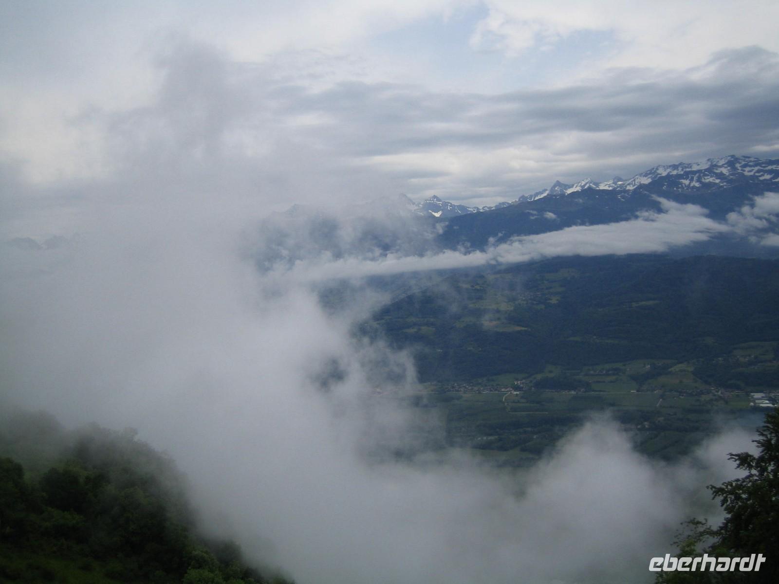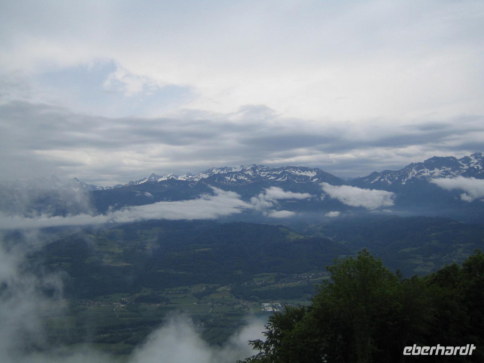 Am nächsten Morgen Regen schon beim Frühstück. Tief liegende Wolken über den Alpen und Grenoble lieferten den Verzicht auf eine Auffahrt zum Fort Bastille- keine Sicht an diesem Tag.