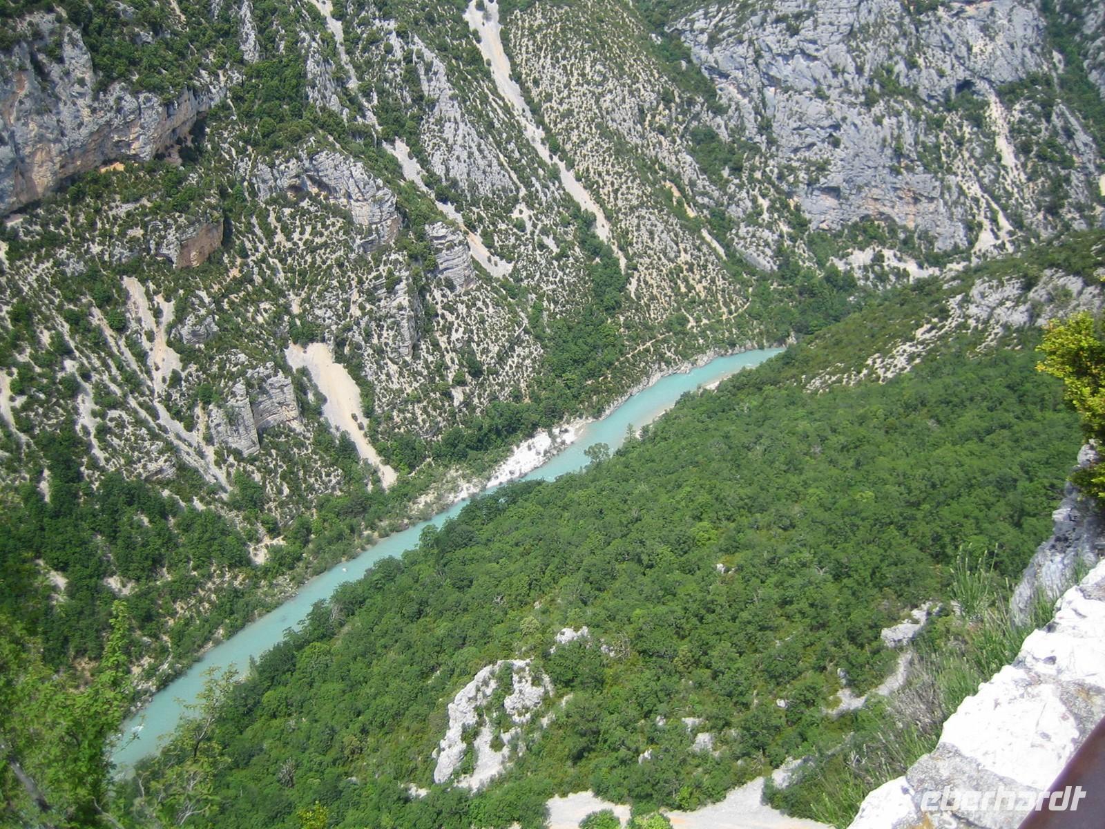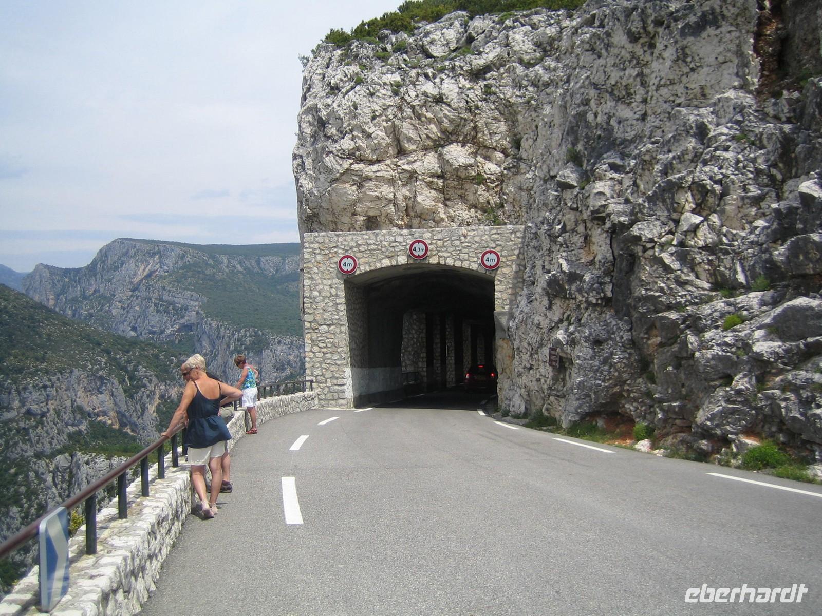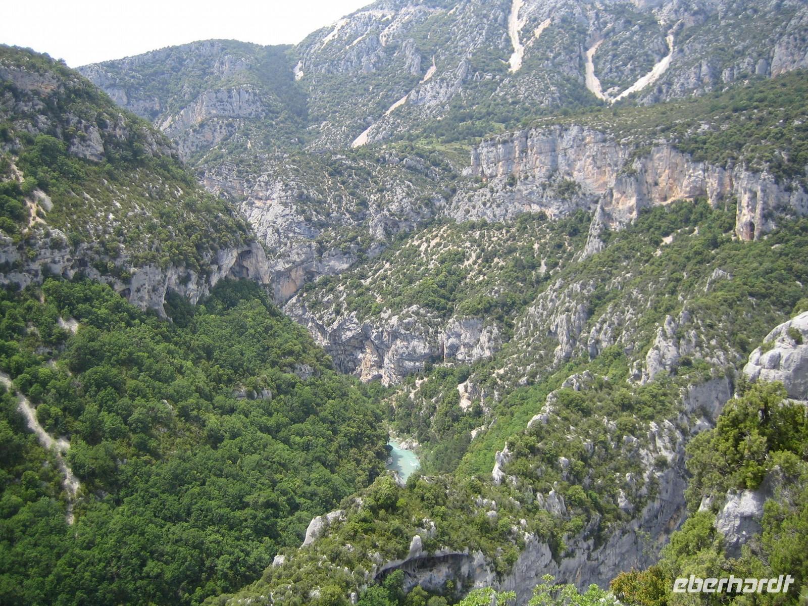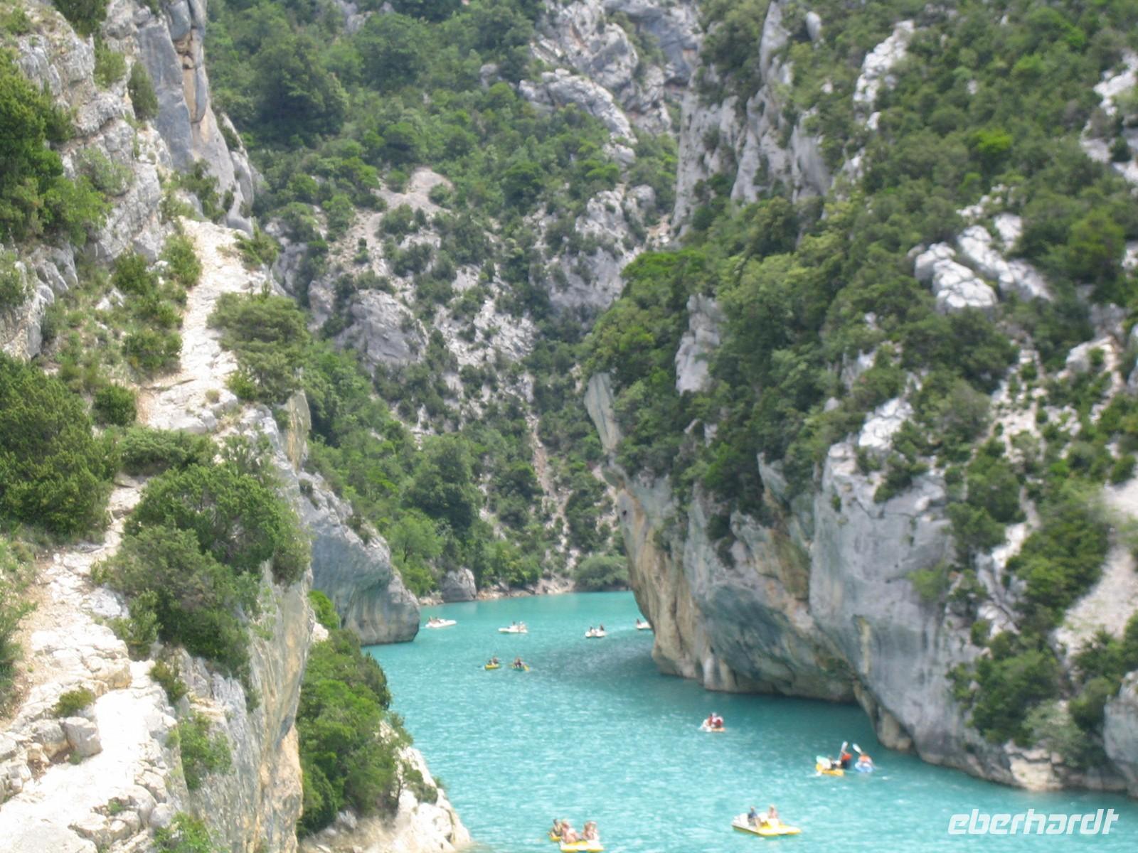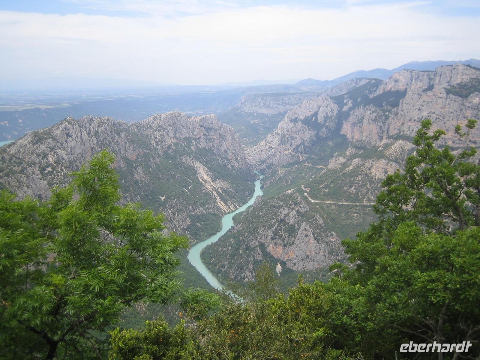 bevorstehende Fahrt entlang der bizarren Schlucht des Verdon. Auf 20 km Länge führt die Hochstraße entlang des türkisblauen Flusses, der sich bis zu 800m tief in die Kalkfelsen gearbeitet hat.