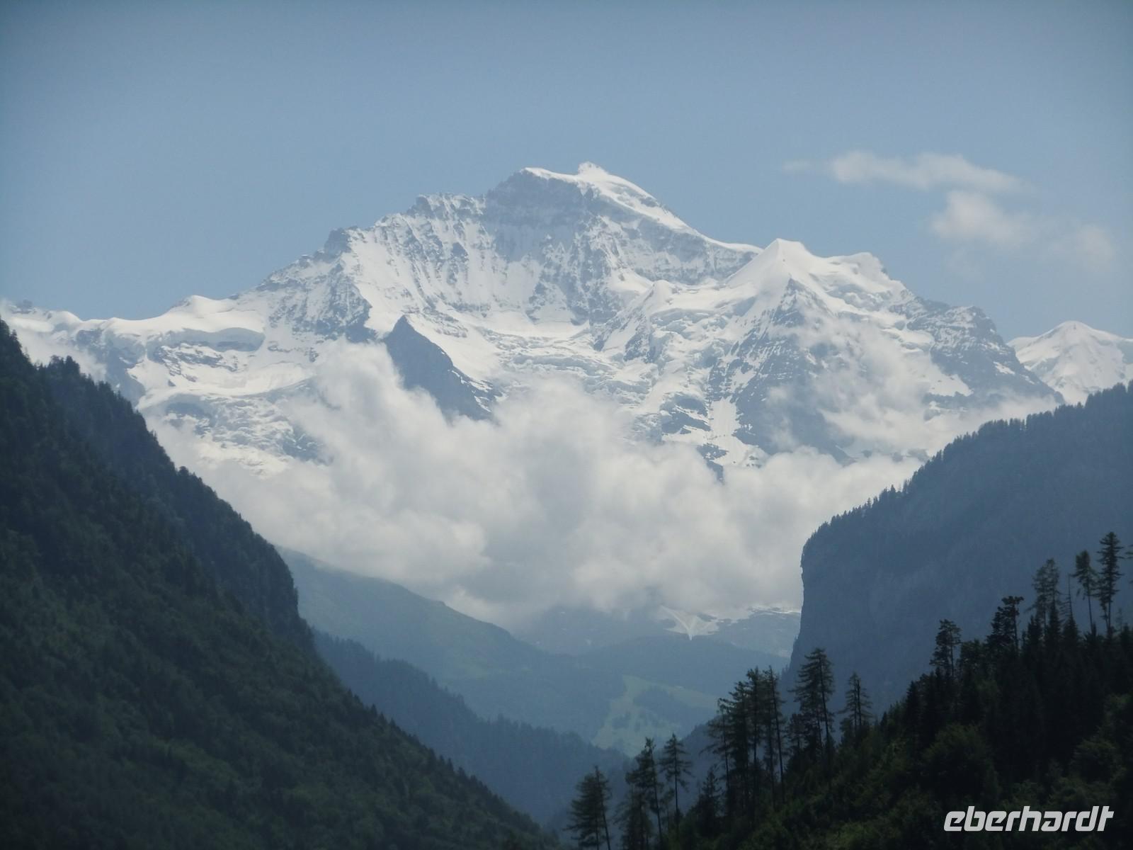 Diesmal werden vor allem die Bergfreunde mit wunderschönen Landschaften bedient. "Die Schweiz ist ein kleines, armes Land, hat keine Bodenschätze, nur Berge, Luft und Wasser. Aber das verkaufen wir gut" meinen die Schweizer. Man sieht es am Thuner See und vor allem in Interlaken. Das Berner Oberland lockt selbst Gäste aus Japan und China und die vielen Geschäfte in Interlaken bieten ein großes Sortiment an Mitbringseln. Die Jungfrau schaut zwischen einer Lücke in den vorgelagerten Bergen durch. Die Schweizer lassen sich die Bahnfahrt zum Jungfraujoch auf 3471 m gut bezahlen. Wir haben keine Zeit dafür und außerdem die Chance am nächsten Tag, noch höher hinaufzufahren.