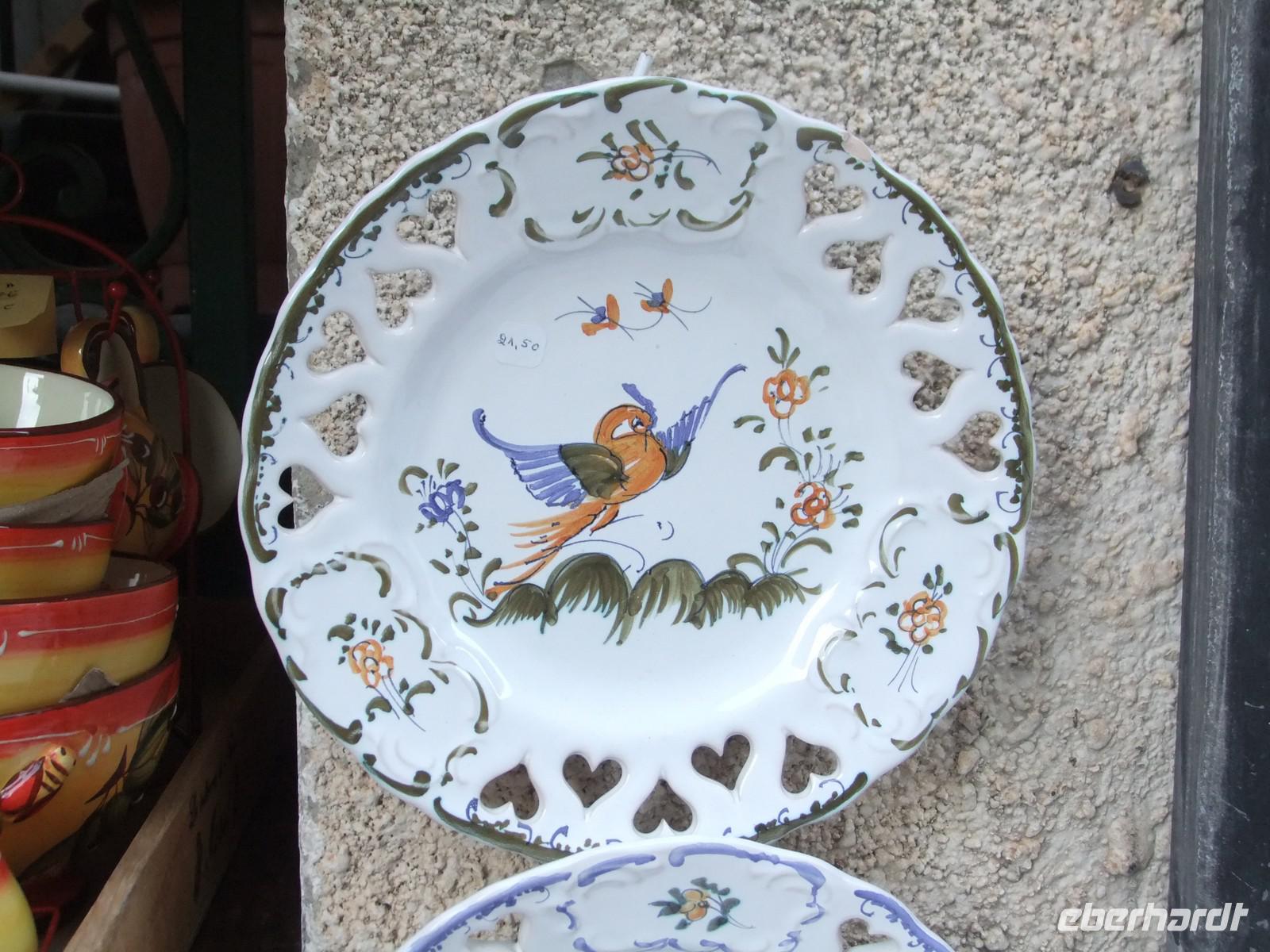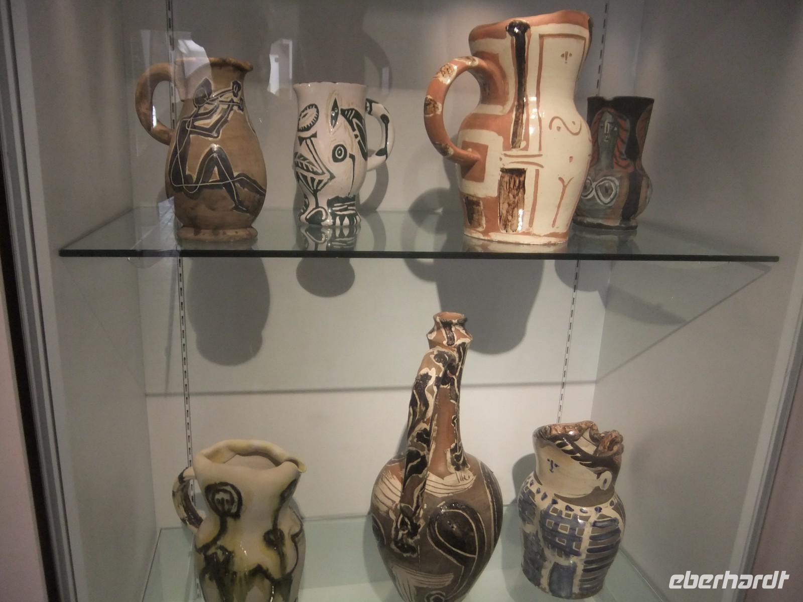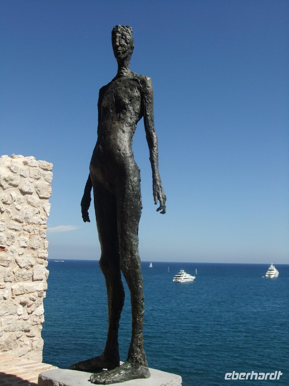 Antibes ist ganz anders als Cannes oder Nizza mit ihren Hotelfronten an langen Promenaden. Zwar liegen auch hier fast 2000 Boote und Jachten vor Anker, mehr noch als in Cannes, aber die Altstadt hat fast dörflichen Charakter. Eine trutzige Burg, die einmal den Grimaldis gehörte, überragt auf einer Klippe den Ort. Die Stadt Antibes stellte nach dem 2. Weltkrieg die großen Räume Picasso zu Verfügung, der wegen der Materialknappheit auf Sperrholz, Asbestzement und alten Gemälden und Landkarten mit Schiffsfarben großflächig malte. Er vermachte über 200 Werke der Stadt, so wurde die Burg über Nacht Kunstmuseum, noch zu Lebzeiten Picassos. Im benachbarten Ort Vaulloris töpferte er, auch aus dieser Zeit 1948/49 sind Keramiken ausgestellt. In einer Galerie am Museum kann man noch Originale kaufen, z.T. liegen die Preise über 10.000 €. Hoffentlich sind die Stücke echt.