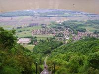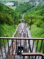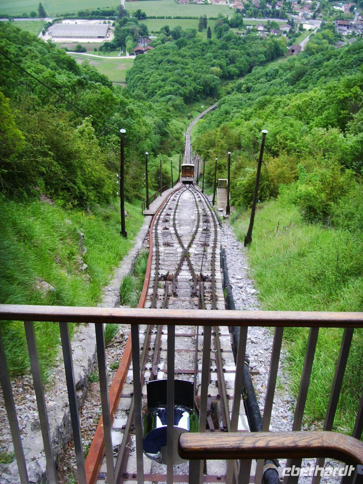 Getreu unserem Reisemotto wartet ohnehin am Nachmittag die nächste Bergbahn auf uns. Nach Golden Pass Panoramic, Mont Blanc Express und der Télépherique de la Bastille schon die vierte Bahn. Diesmal ist es die Standseilbahn Le Funiculaire, die den Talort Montfort mit dem ca. 600 m höher liegenden Dorf Saint-Hilaire du Touvet verbindet. Ziemlich steil die Auffahrt, stellenweise über 80% Steigung, kaum zu glauben, dass das funktioniert. Tut es aber, wir kommen heil oben an, leider im Regen und so endet der Aufenthalt oben schließlich gemütlich im dortigen Café.