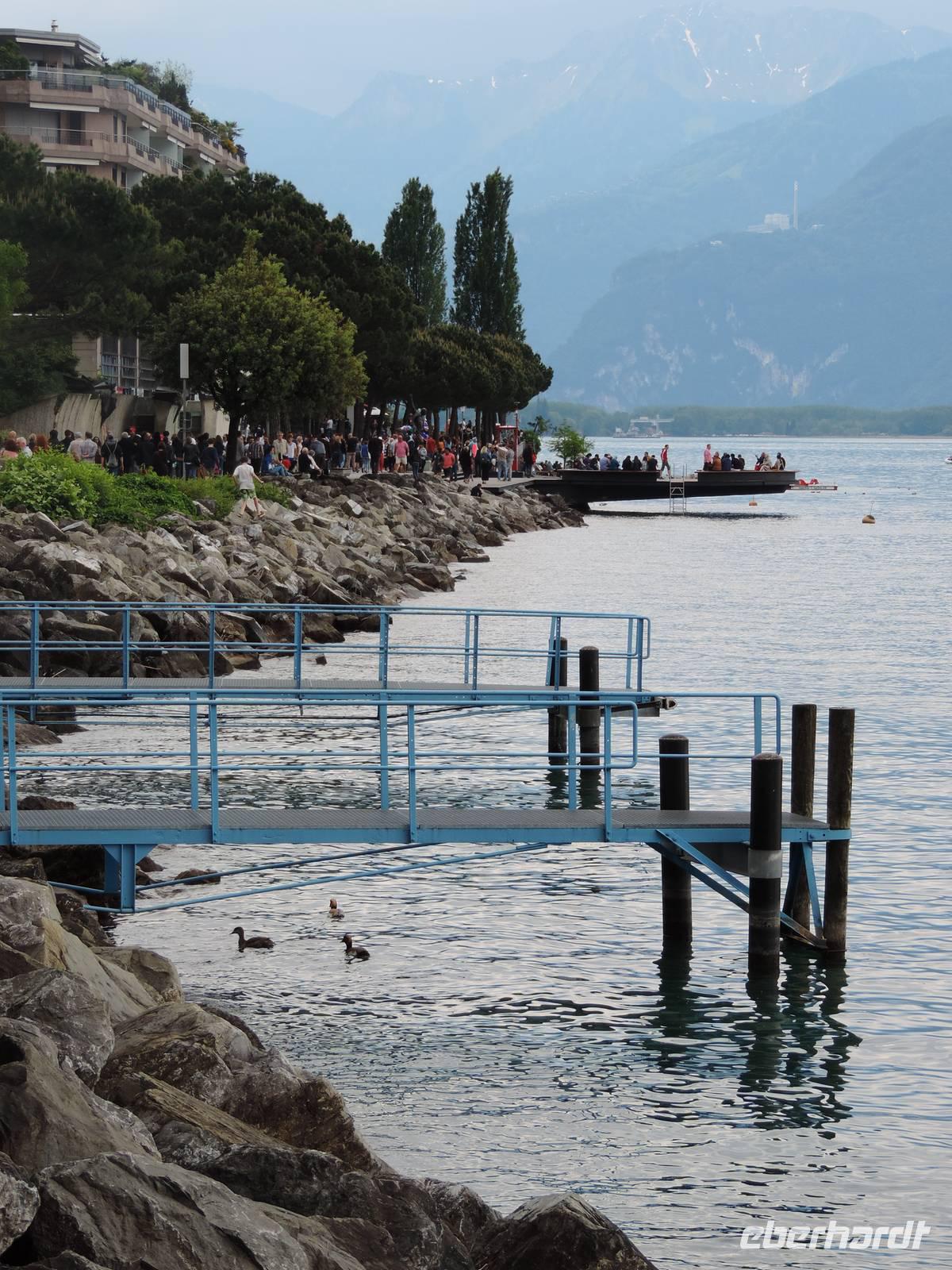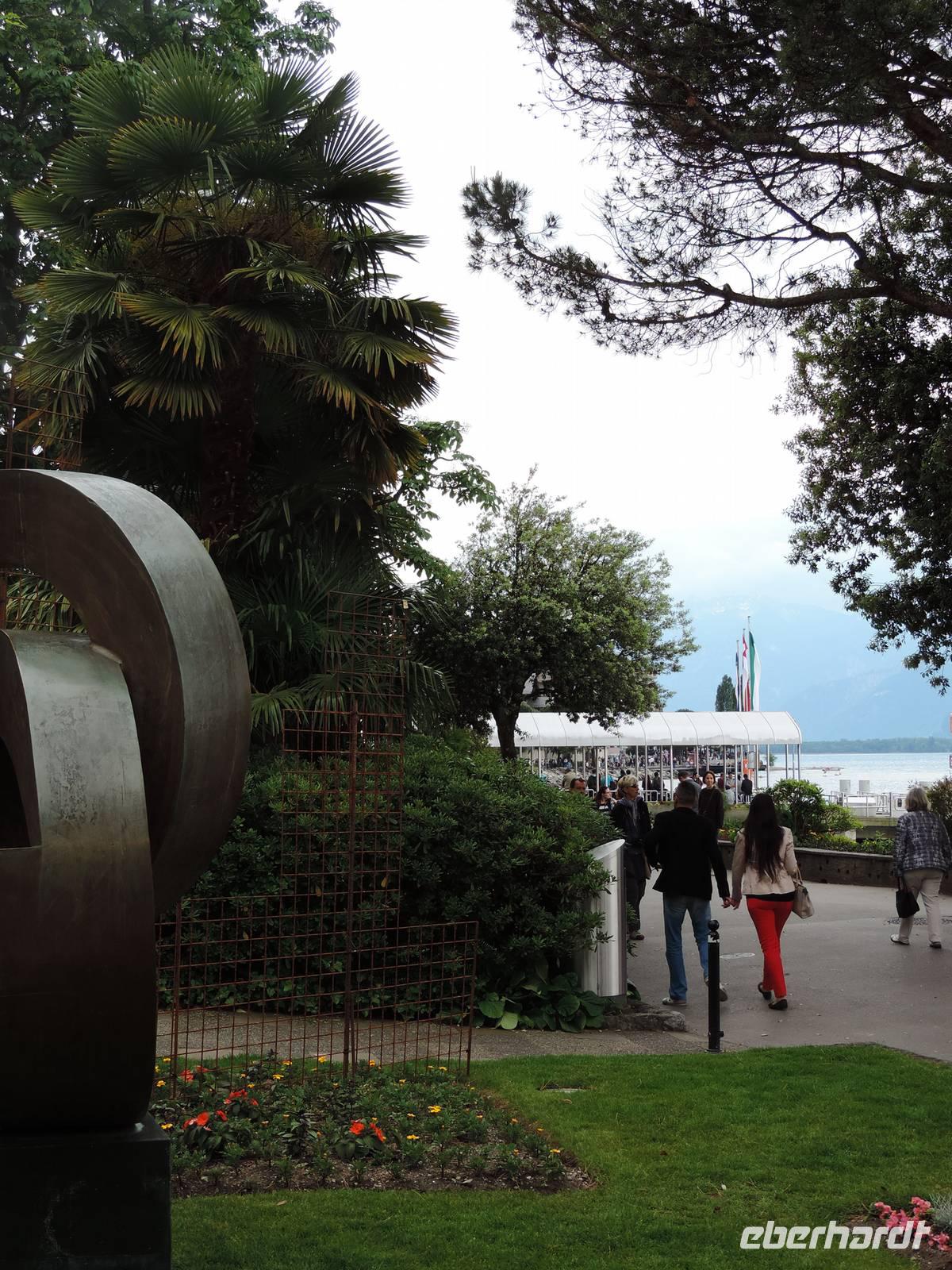 Pünktliche Abfahrt des Golden Pass Panoramic Zuges. Man hat uns umgesetzt - in die erste Klasse. Außen am Abteil prangt ein Schild „Eberhardt Travel". Zunächst zuckeln wir über die grüne Hochebene, dann geht es durch Tunnel und Serpentinen ins Tal hinab nach Montreux, das wir 16.13 Uhr erreichen. Dort spazieren wir zur Seepromenade. Freizeit.